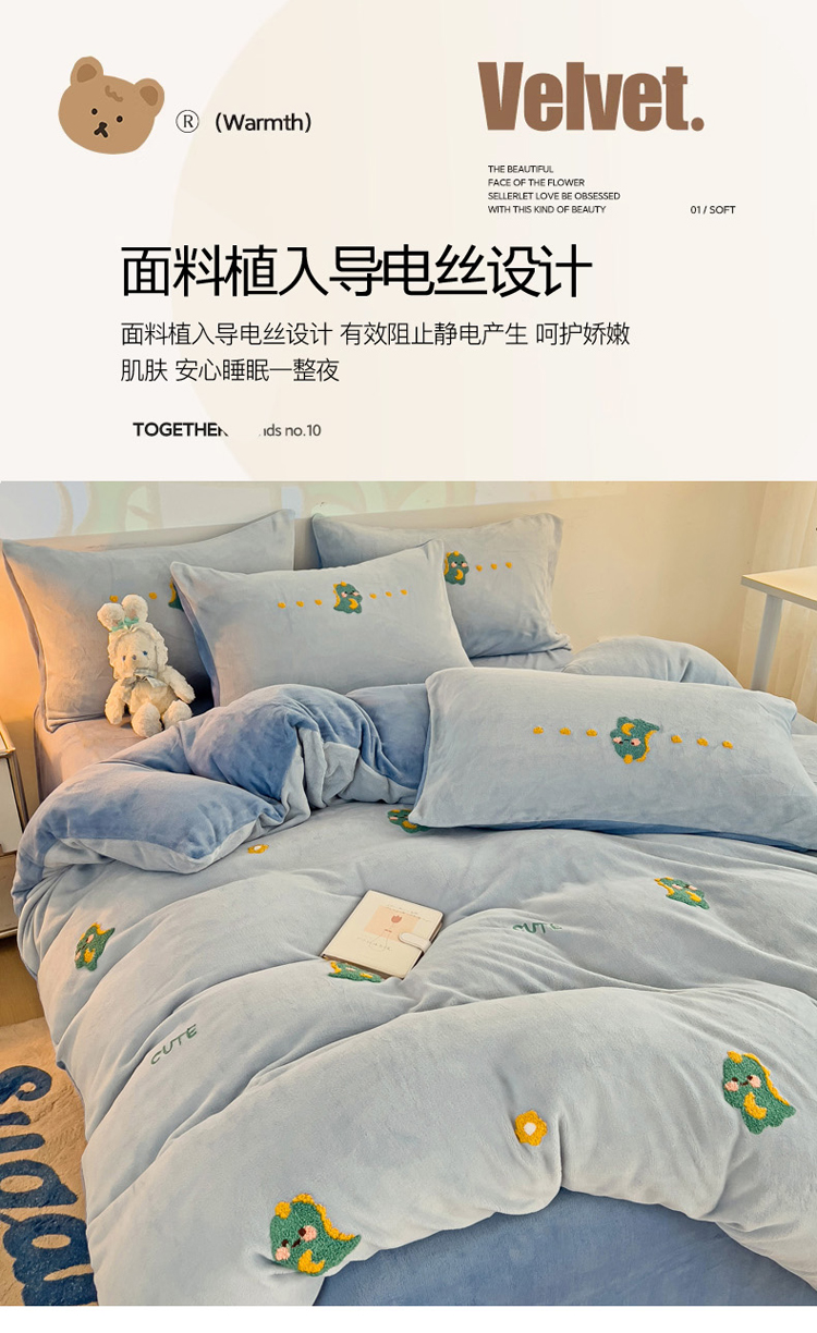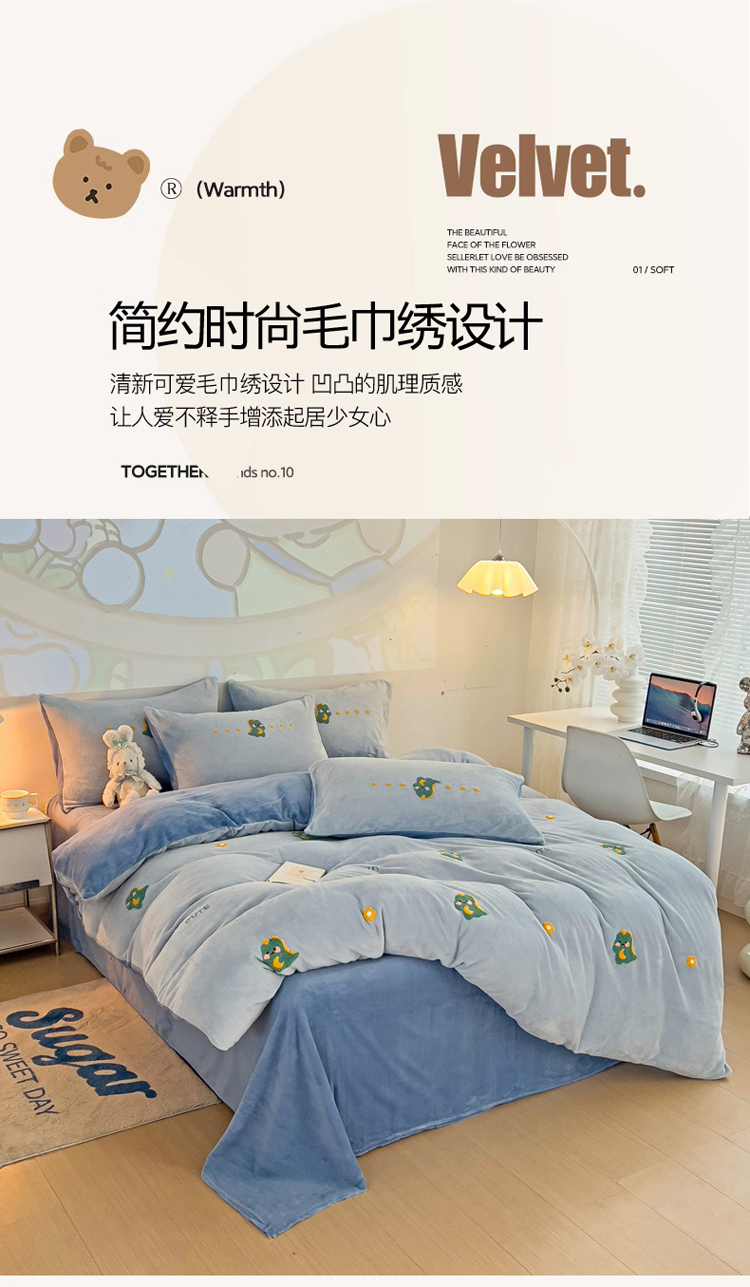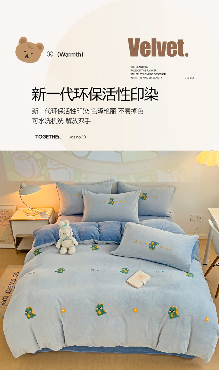 商品名称:寐居家纺 2023新款高克重牛奶绒毛巾绣四件套 萌宠恐龙-蓝