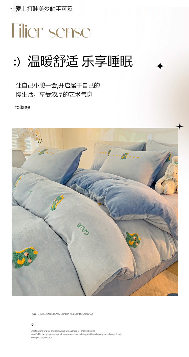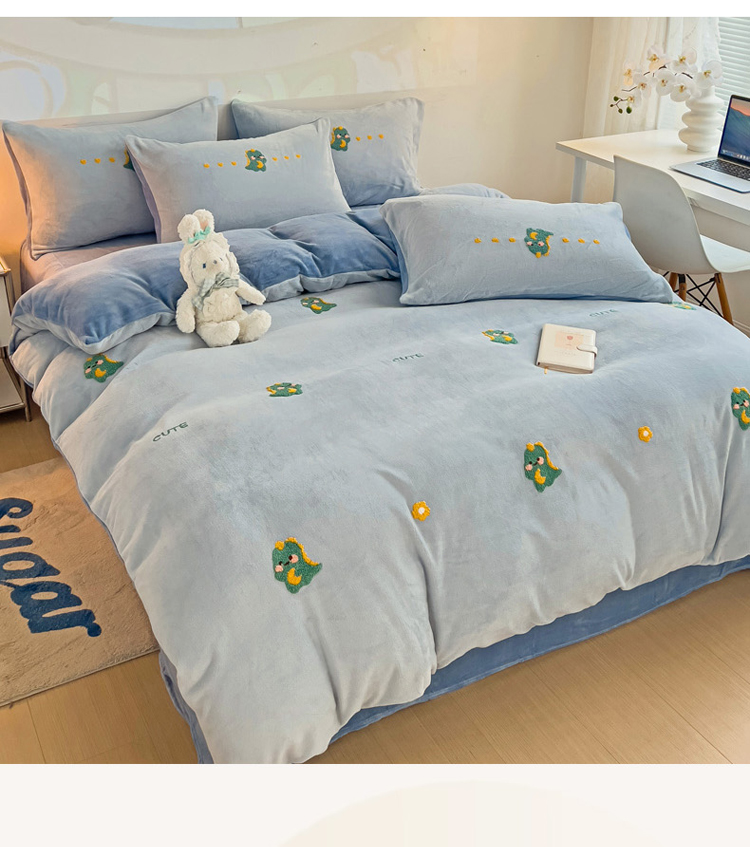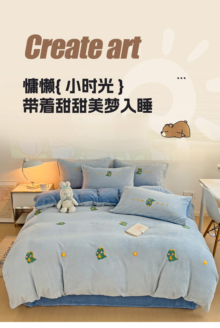 寐居家纺 2023新款高克重牛奶绒毛巾绣四件套 萌宠恐龙-蓝