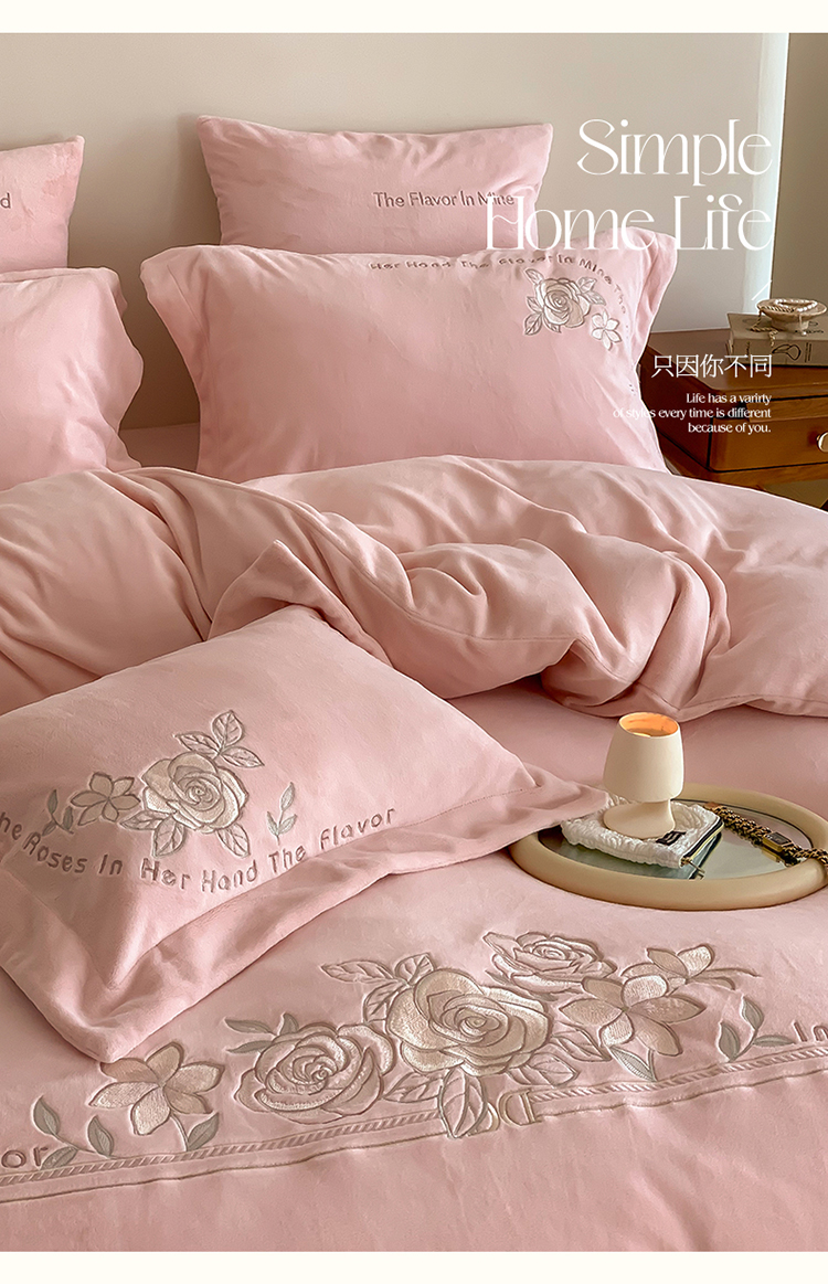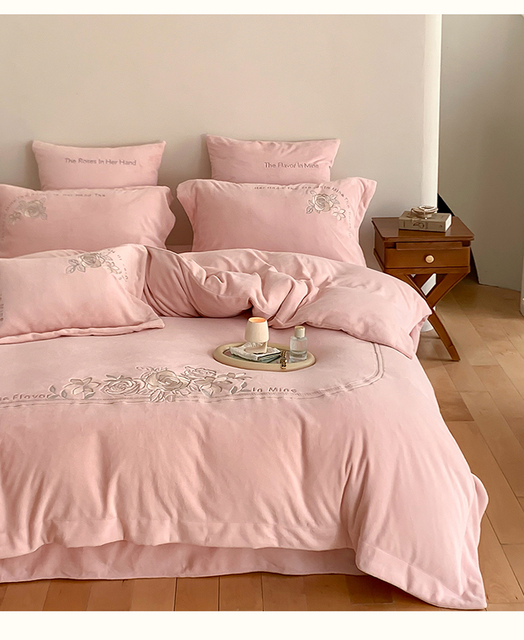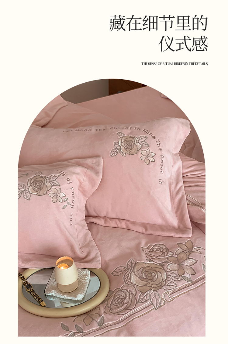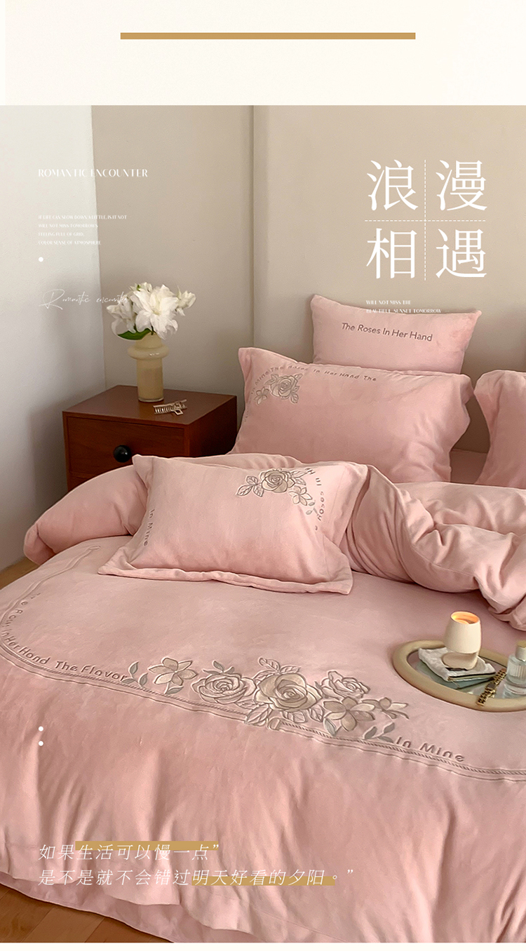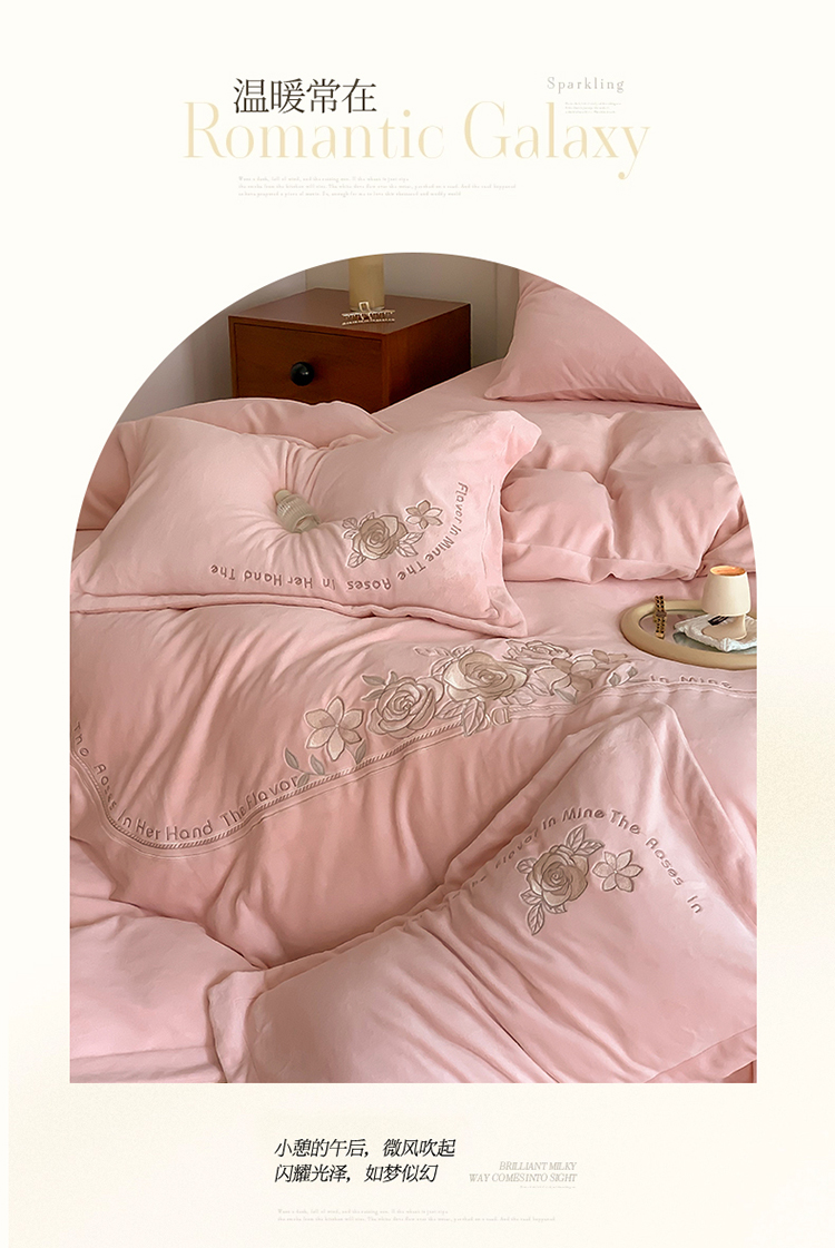 商品名称:名品优仓 2023新款高克重230g牛奶绒绣花蔓璃系列四件套 樱花粉