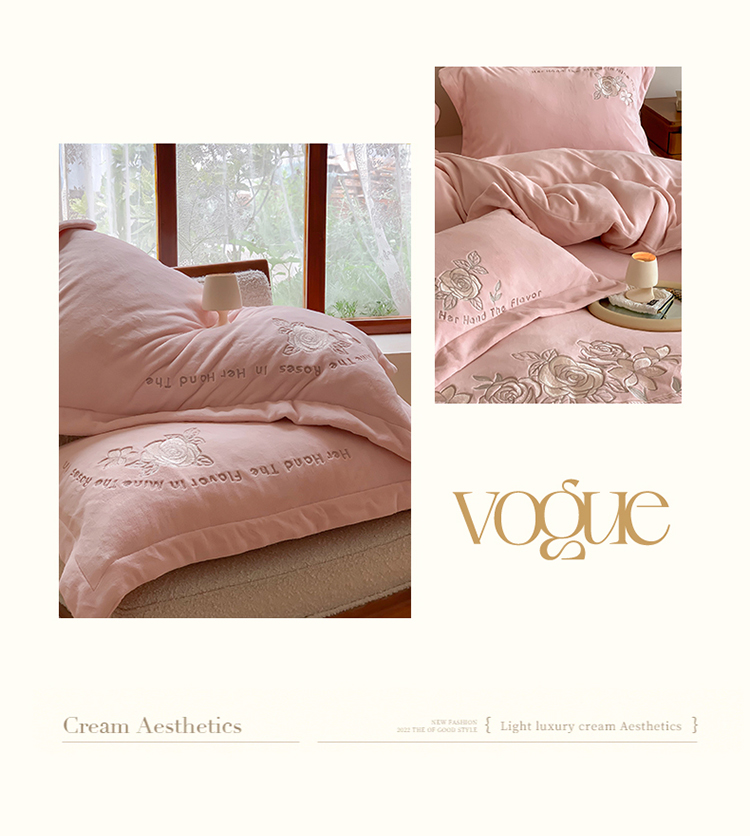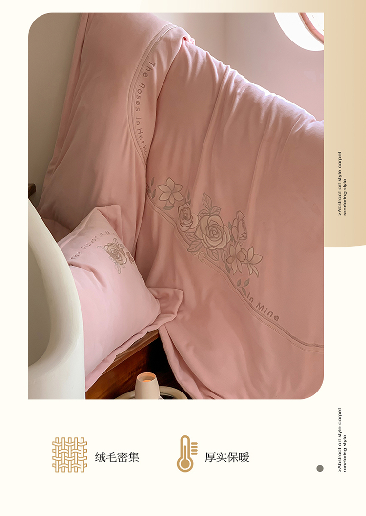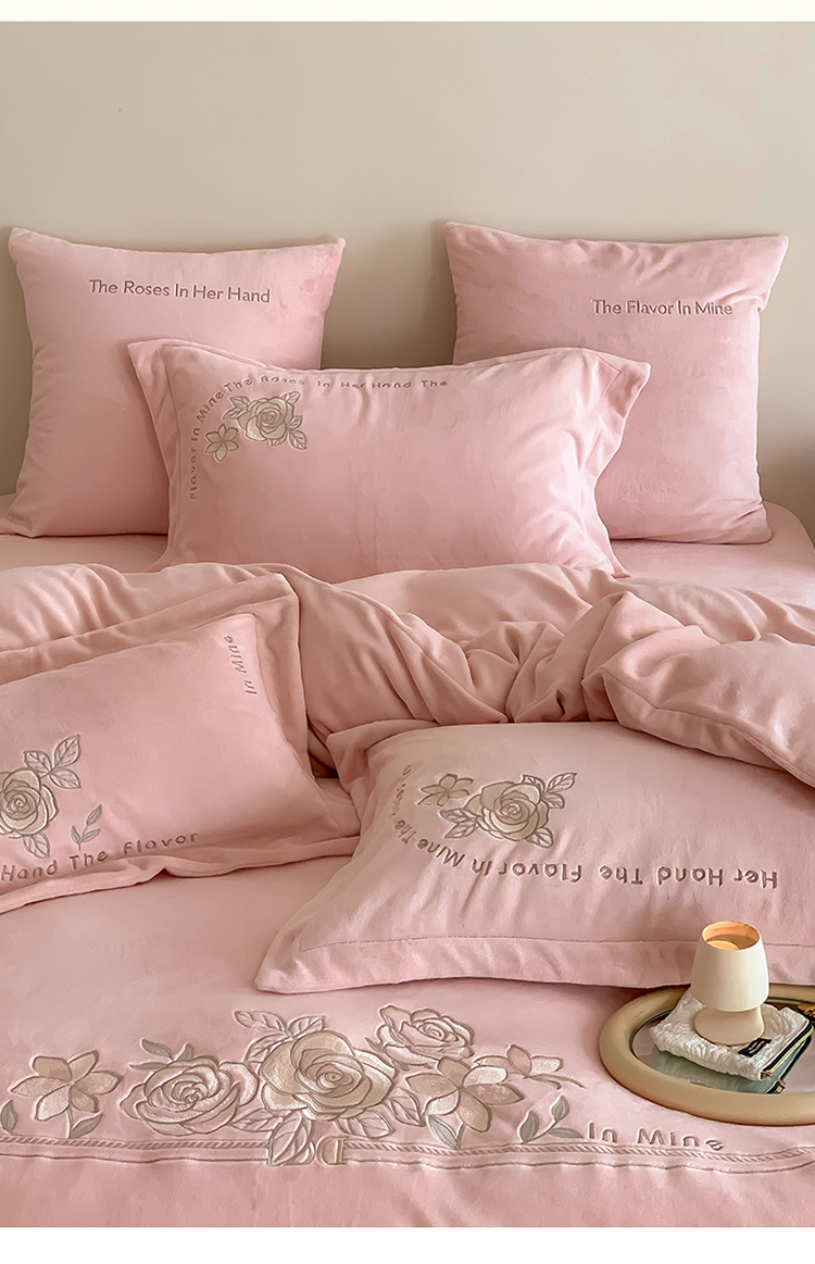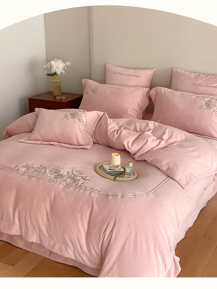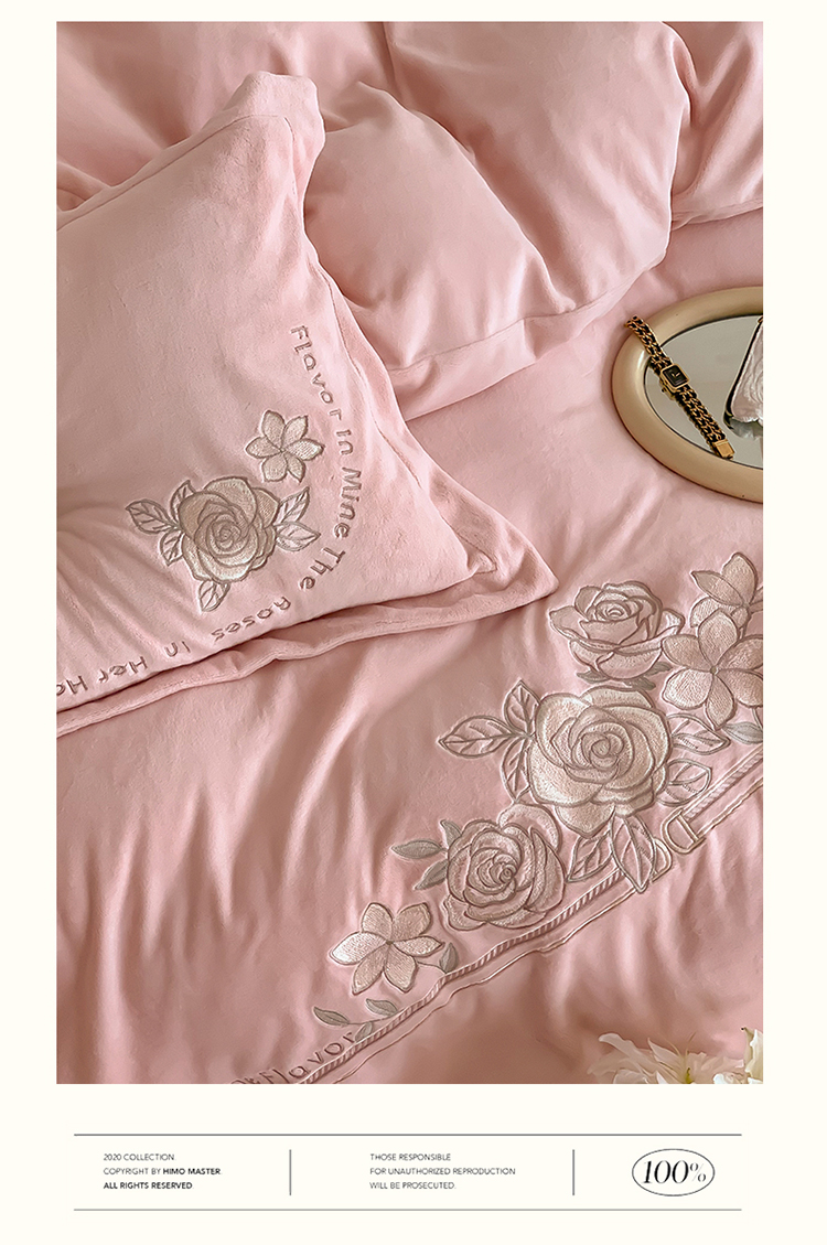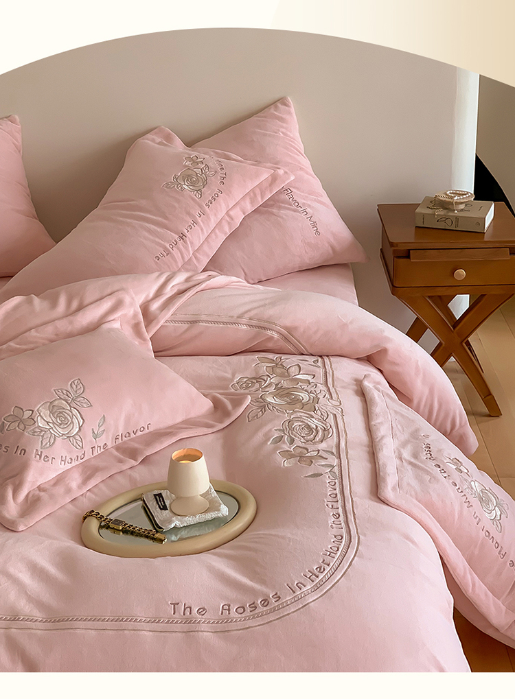 商品名称:名品优仓 2023新款高克重230g牛奶绒绣花蔓璃系列四件套 樱花粉