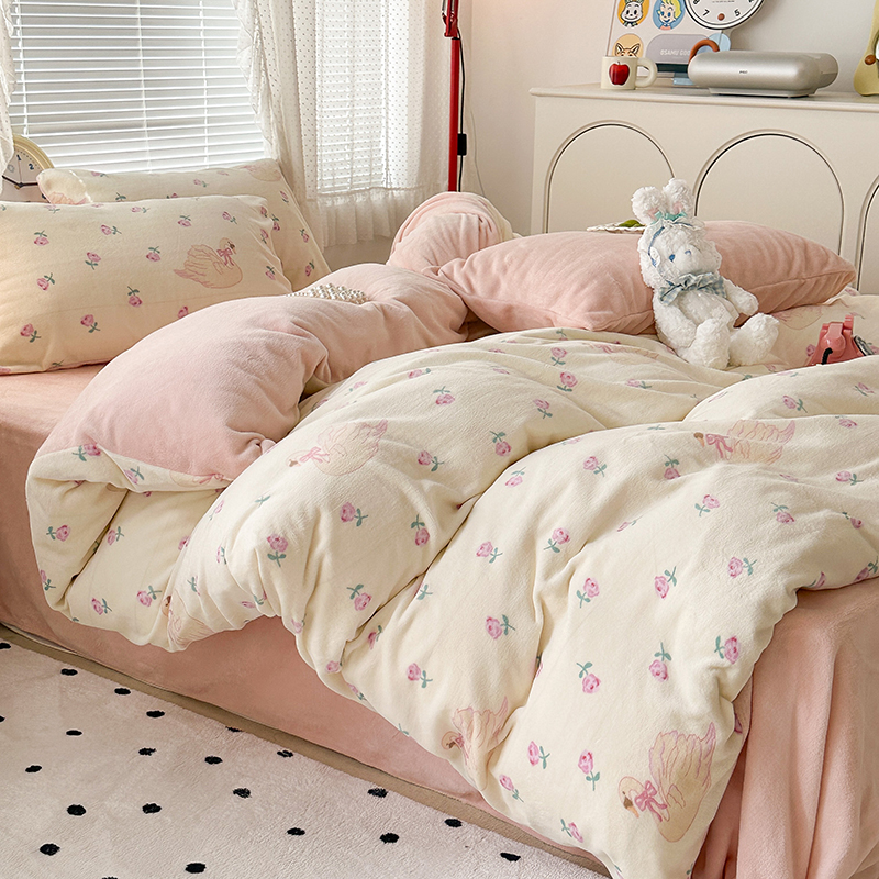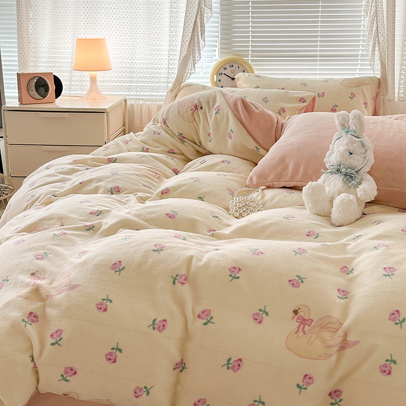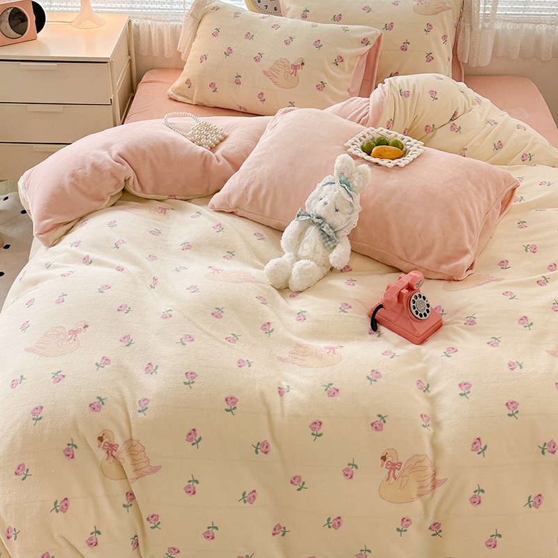 昔可家纺 2023新款高克重印花牛奶绒小清新系列四件套 天鹅玫瑰