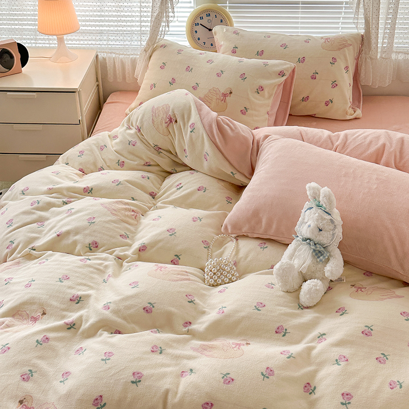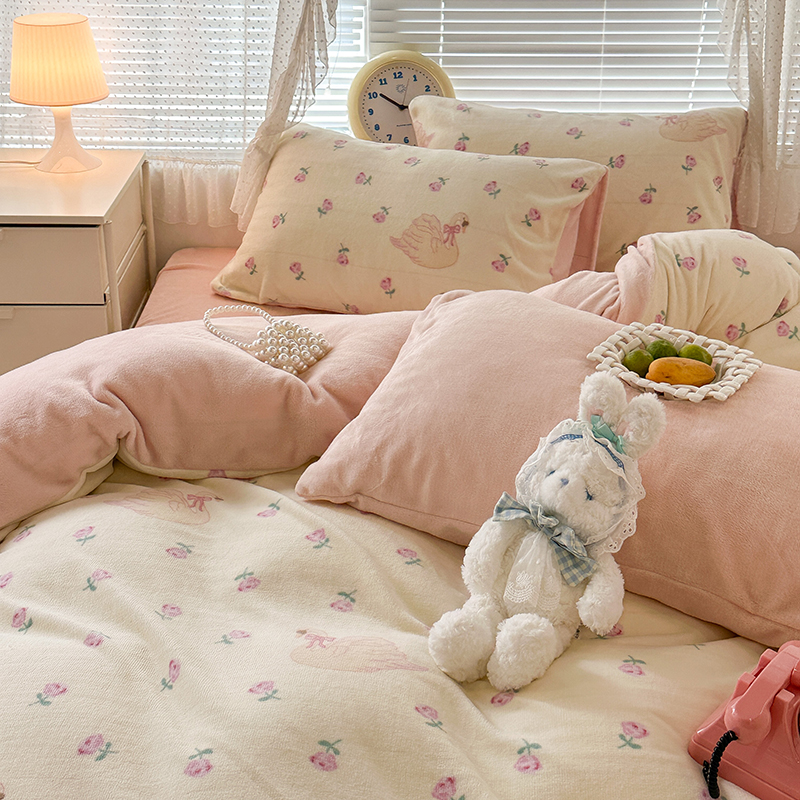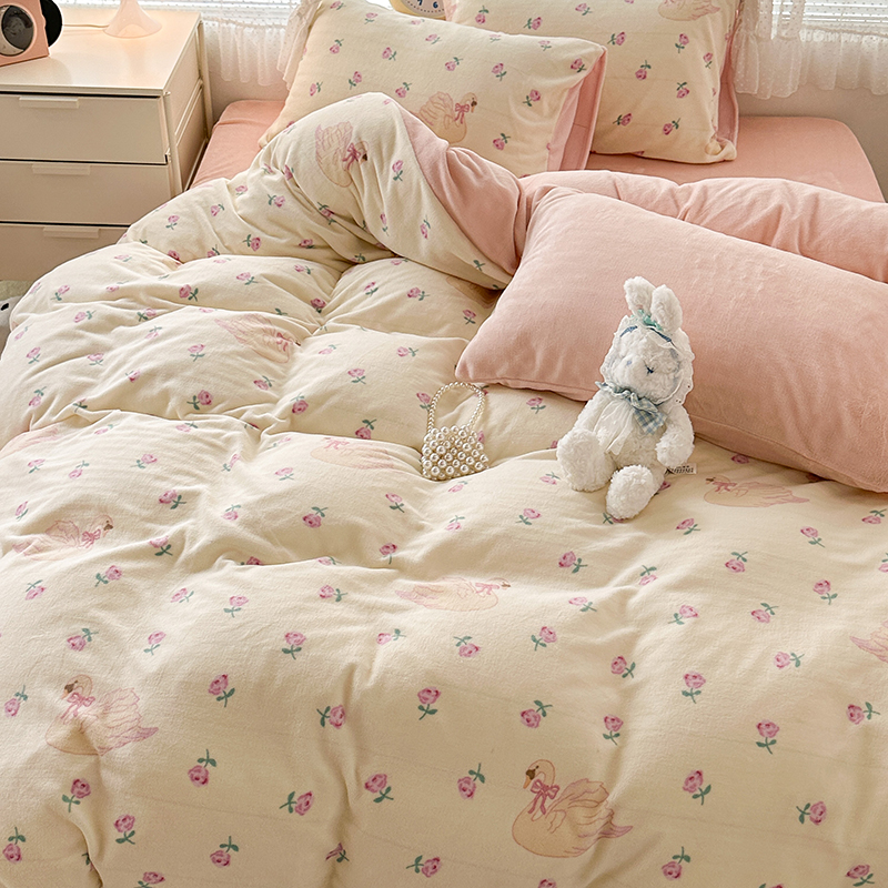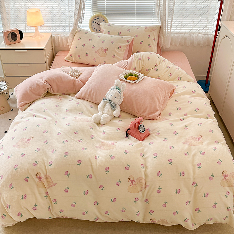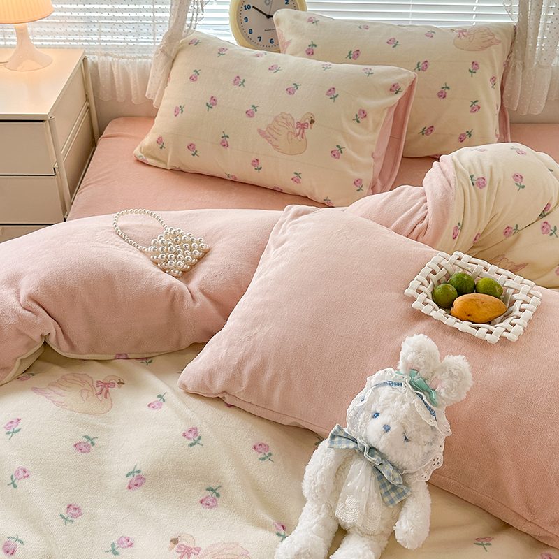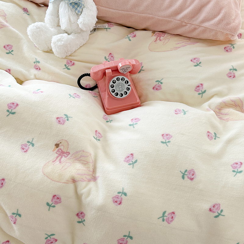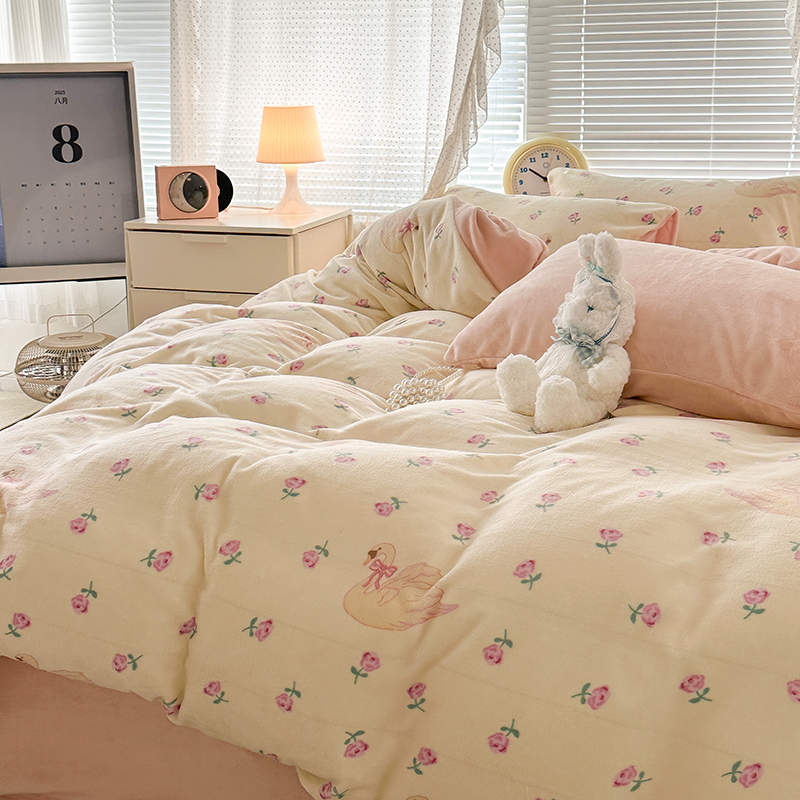 商品名称:昔可家纺 2023新款高克重印花牛奶绒小清新系列四件套 天鹅玫瑰
