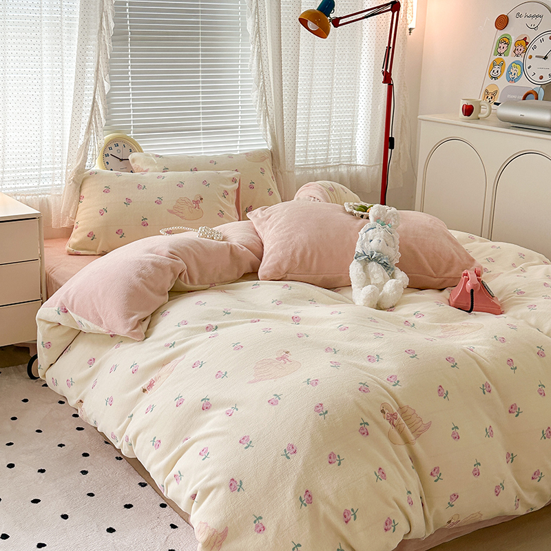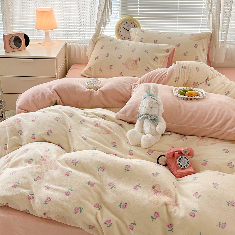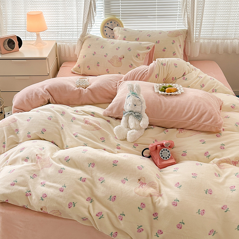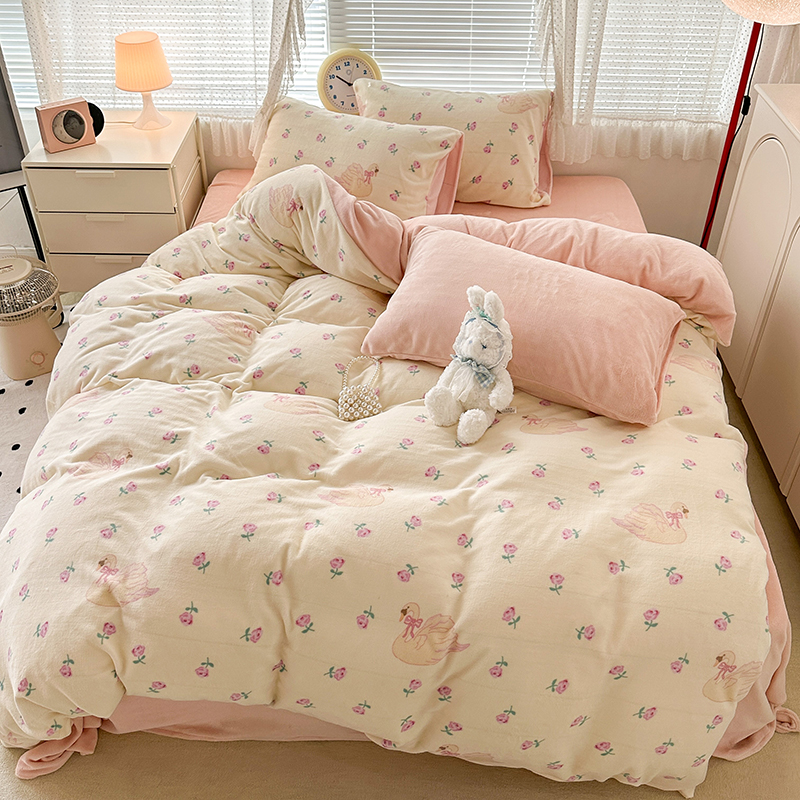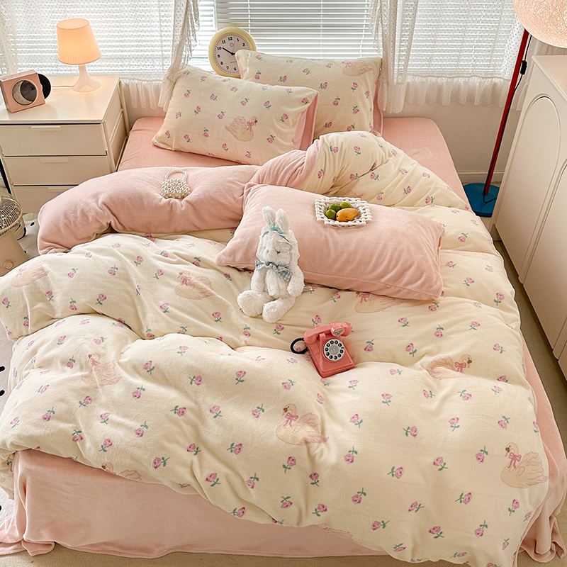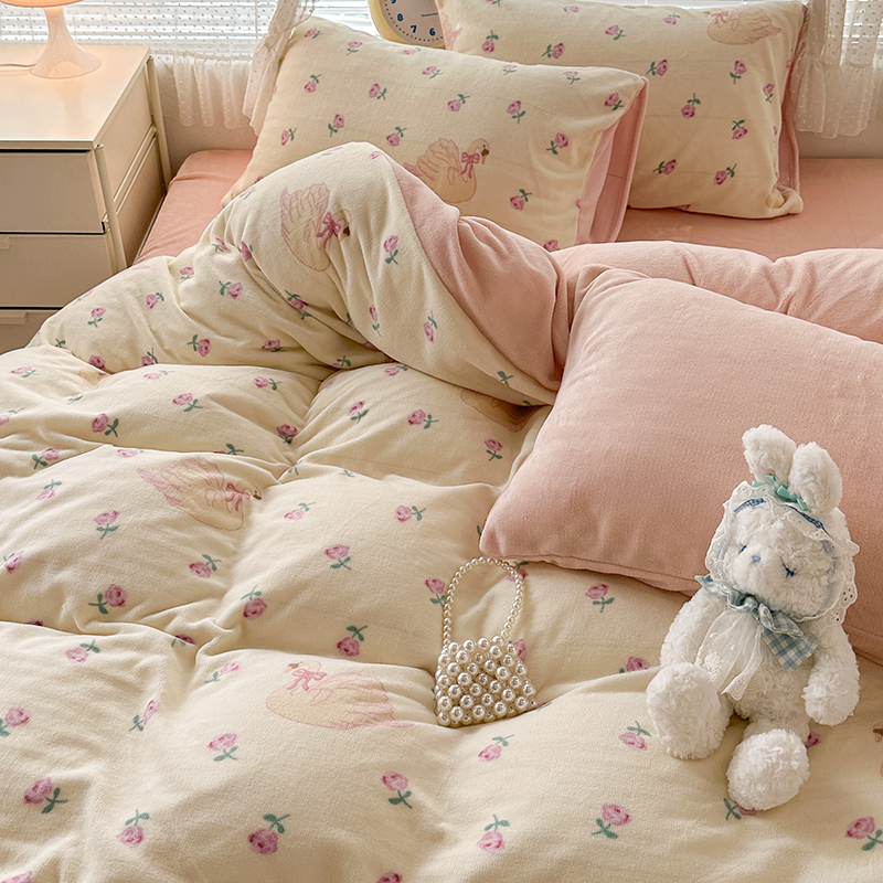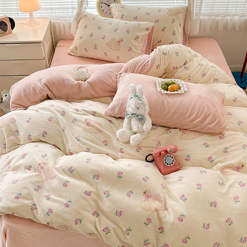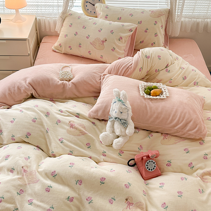 商品名称:昔可家纺 2023新款高克重印花牛奶绒小清新系列四件套 天鹅玫瑰