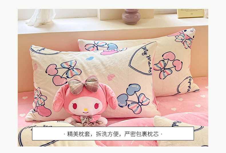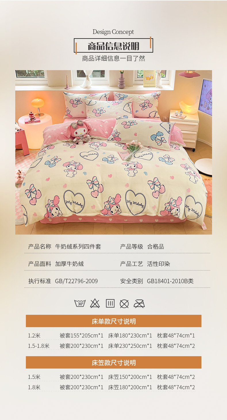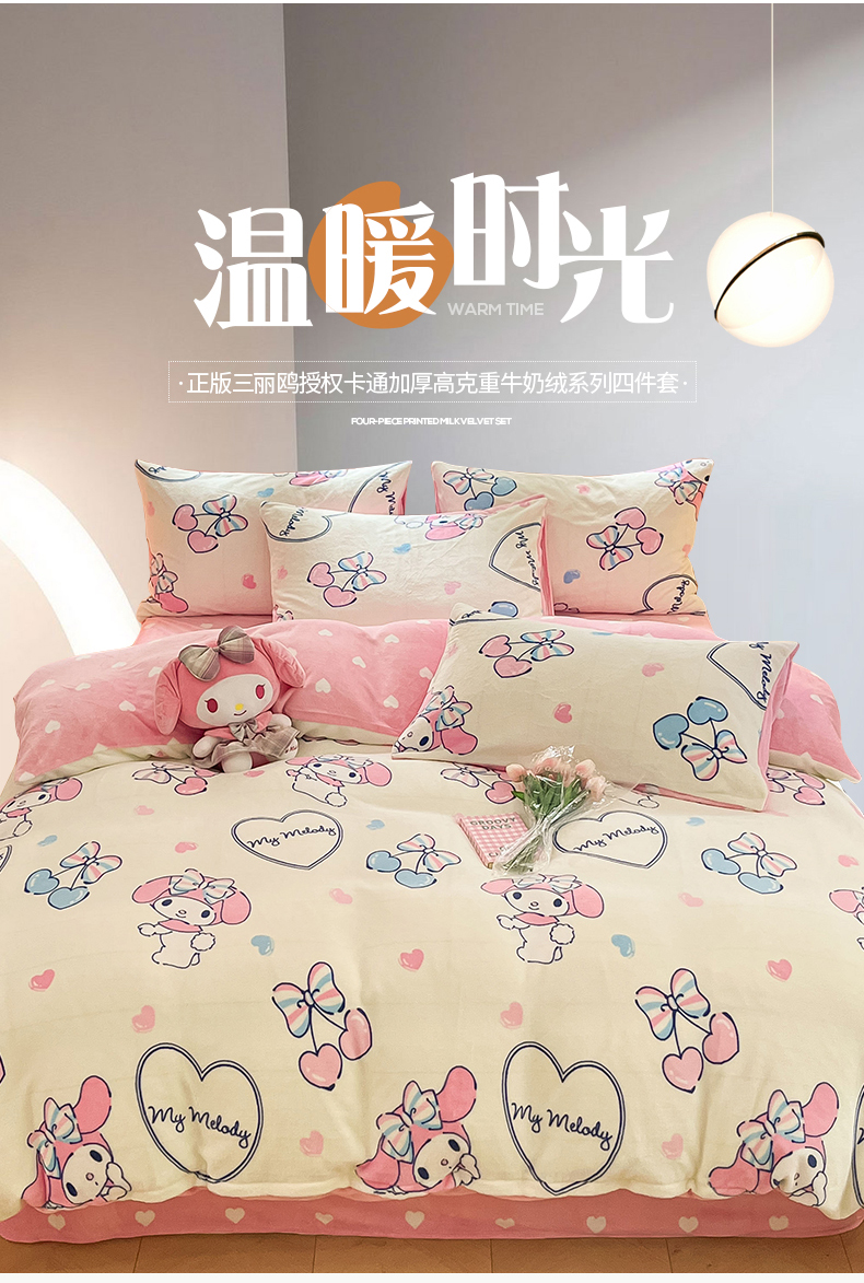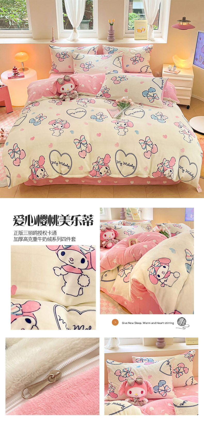当前位置: 91家纺网 > 商品网购 > 床品套件 > 四件套 > 牛奶绒四件套 > 桃子 2023新款正版三丽鸥授权卡通加厚高克重牛奶绒系列四件套 绒三丽鸥-爱心樱桃美乐蒂