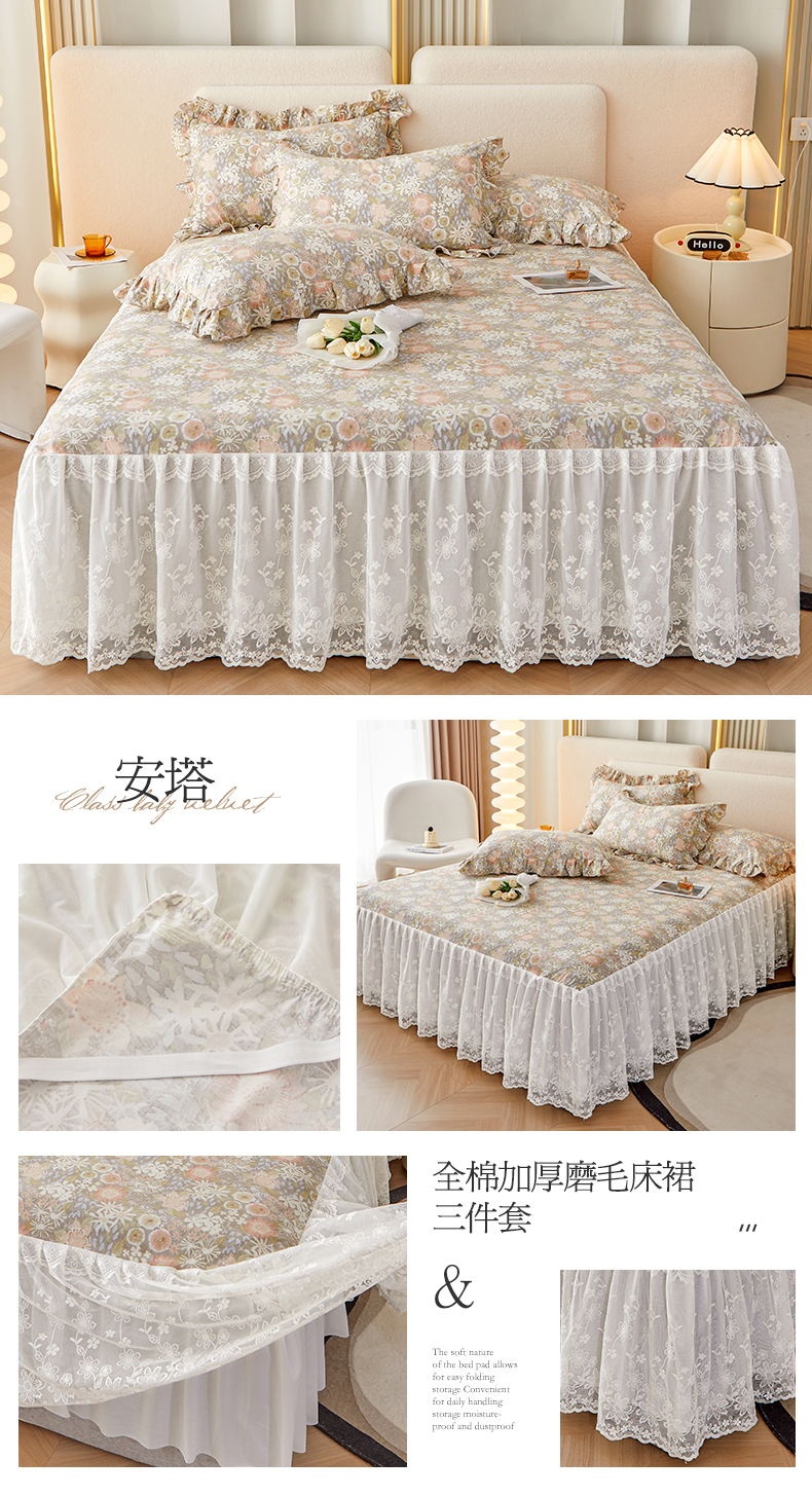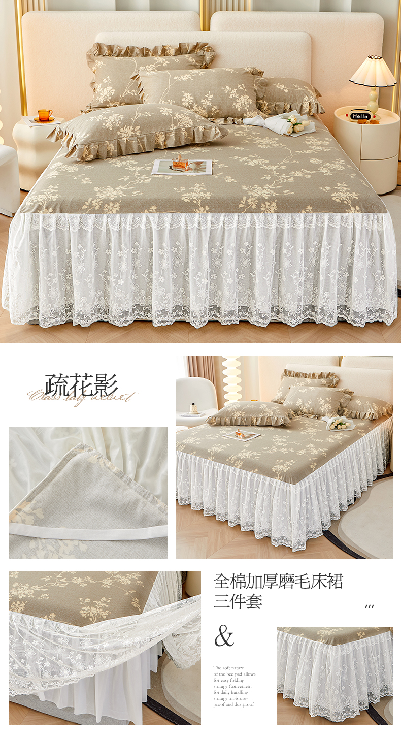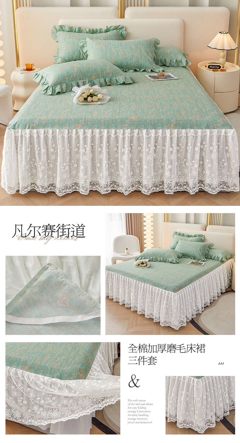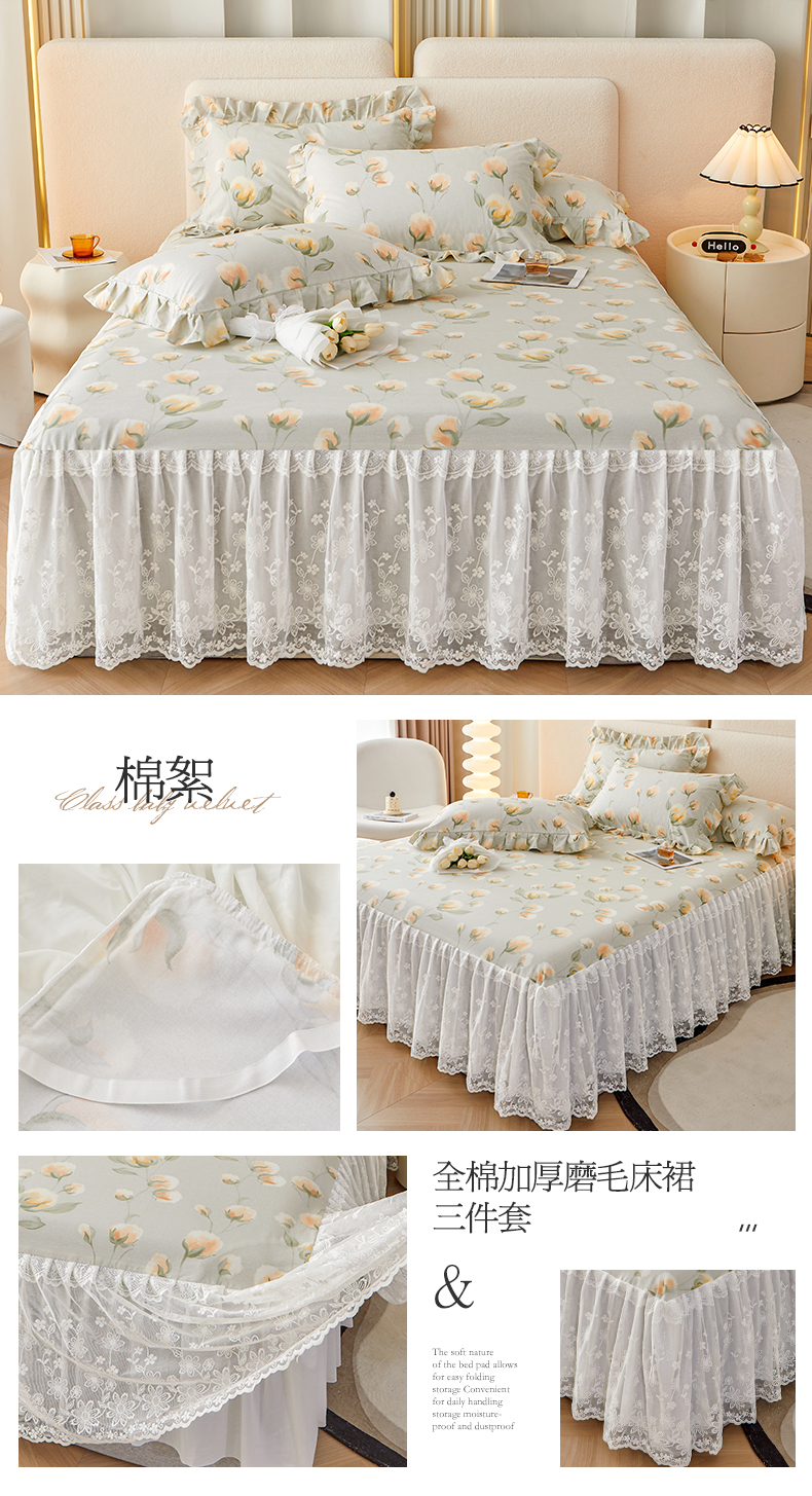 (总)宜凡家纺 2023新款全棉加厚磨印花毛床裙三件套