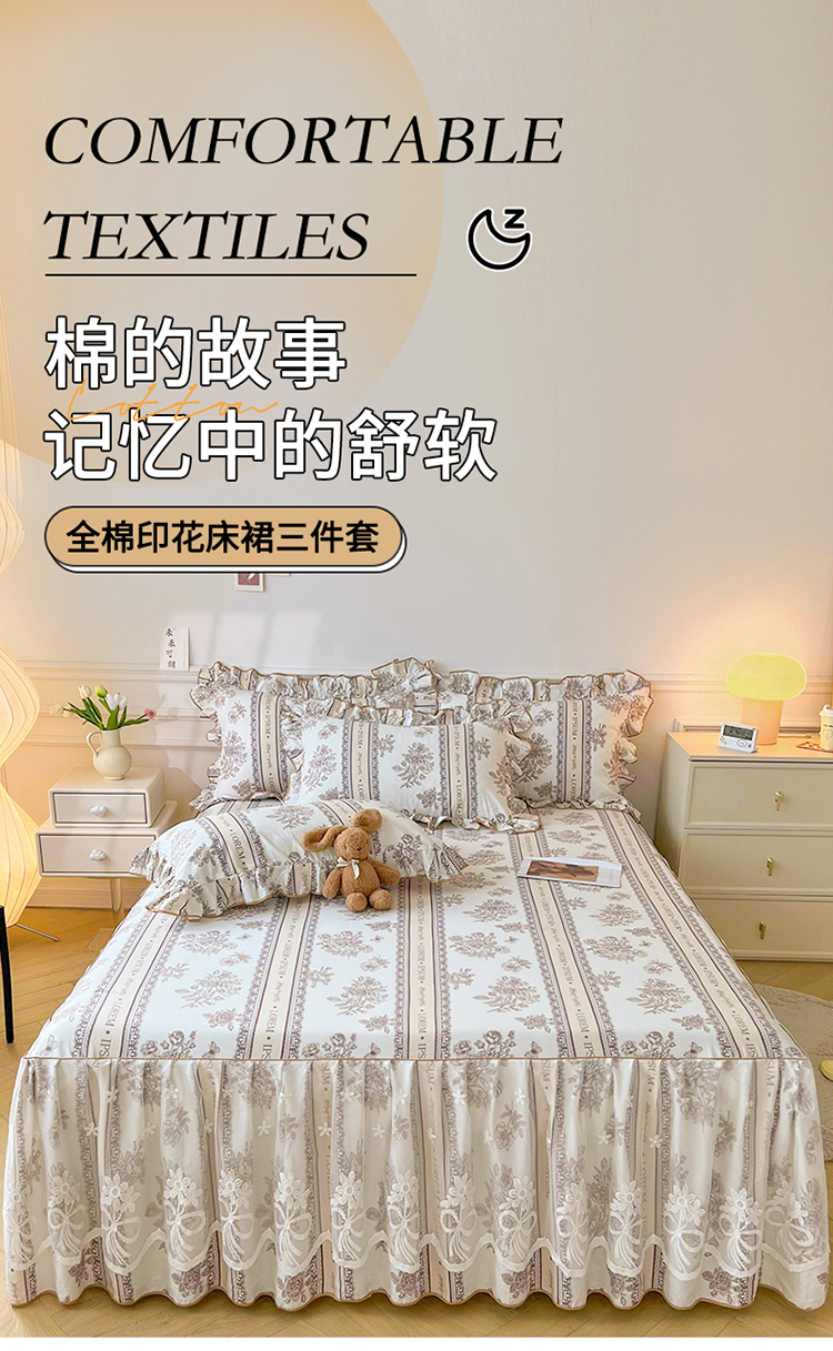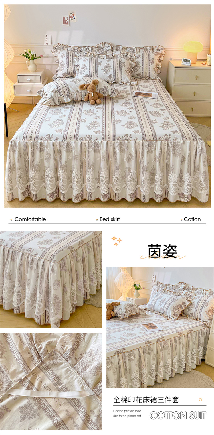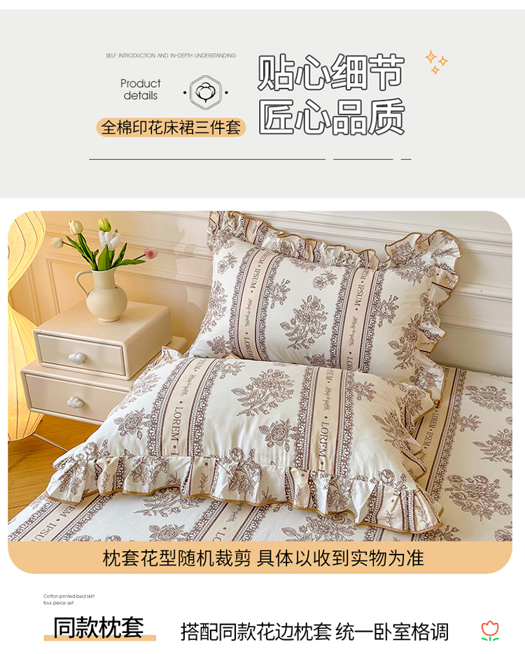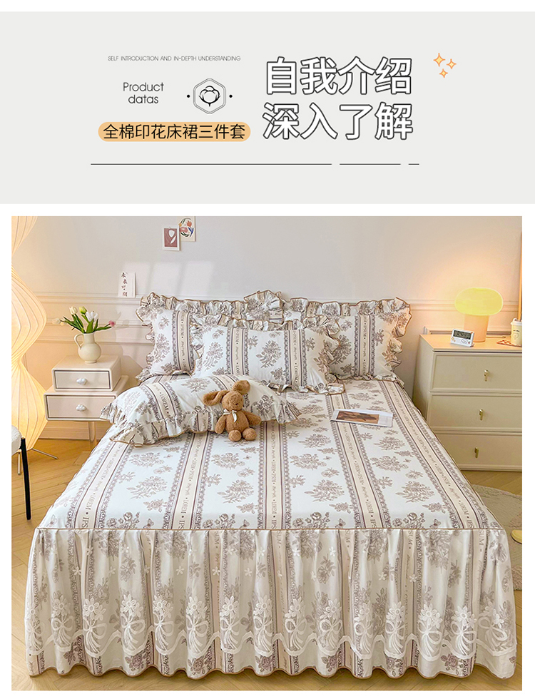 当前位置: 91家纺网 > 商品网购 > 床品套件 > 三件套 > 宜凡家纺 2023新款全棉印花单层床裙三件套 茵姿