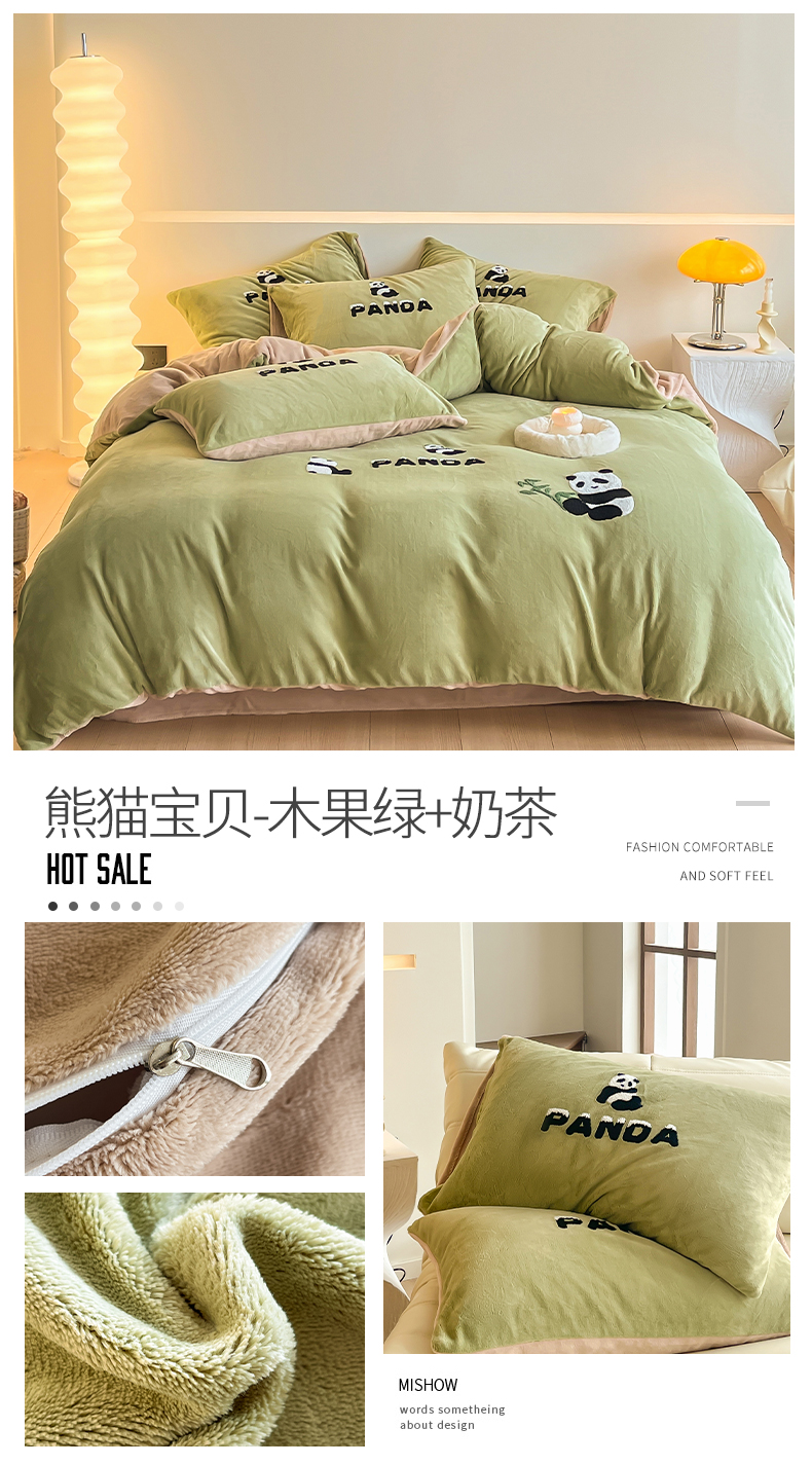 当前位置: 91家纺网 > 商品网购 > 床品套件 > 四件套 > 牛奶绒四件套 > 慕色家纺 2023新款A类牛奶绒毛巾绣四件套 熊猫宝贝绒系列 熊猫宝贝-木果绿+奶茶