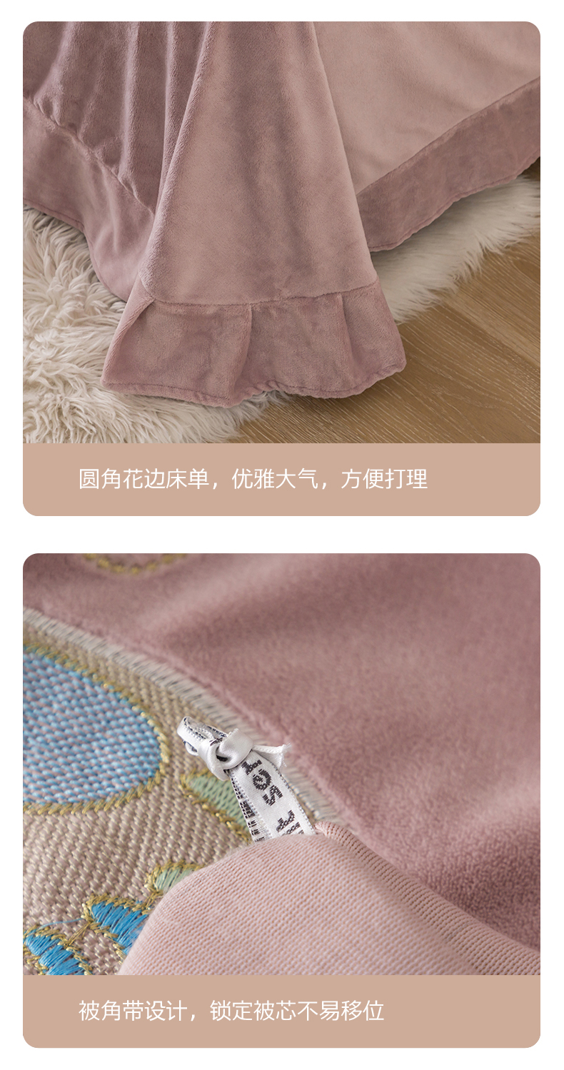 (总)找底底家纺 2025新款花边9-10斤牛奶绒床盖款四件套,花妖,梨花落,小樱桃,紫蔻
