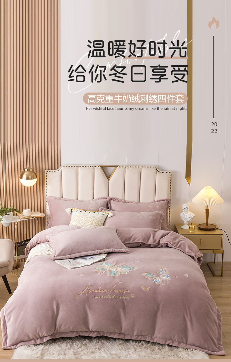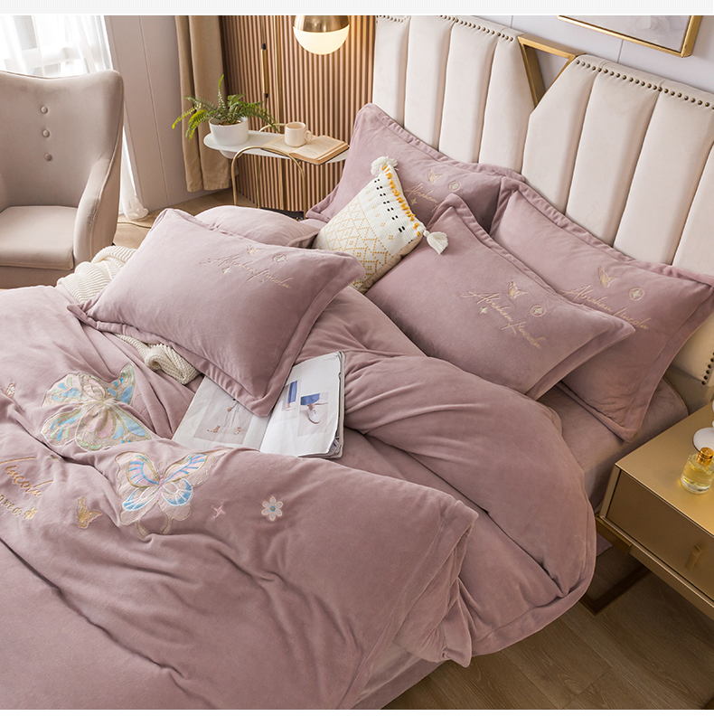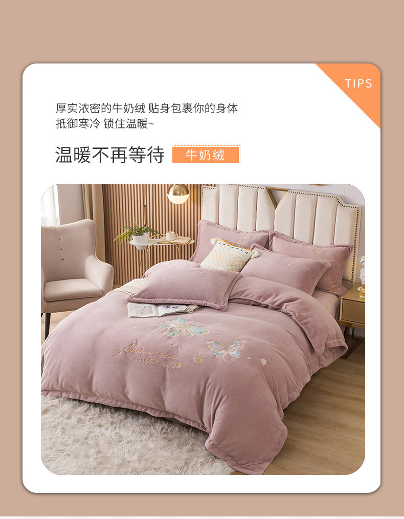 (总)找底底家纺 2023款220克全消光重工刺绣纯色牛奶绒四件套-蝶舞花开,蝶舞花开-白,蝶舞花开-豆沙,蝶舞花开-粉,蝶舞花开-桔红,蝶舞花开-蓝,蝶舞花开-墨绿,蝶舞花开-浅灰,蝶舞花开-深灰,蝶舞花开-紫