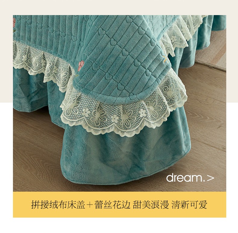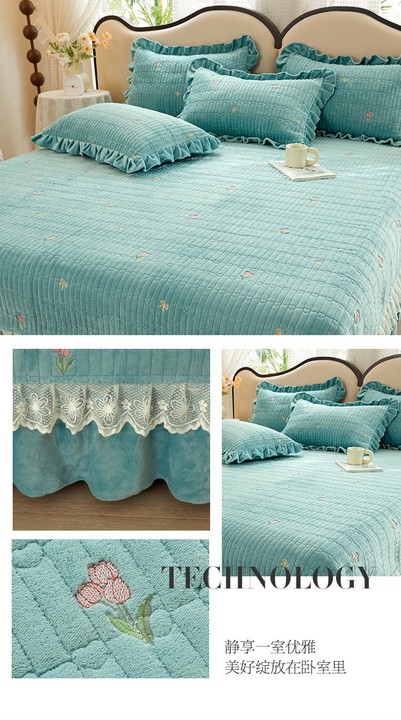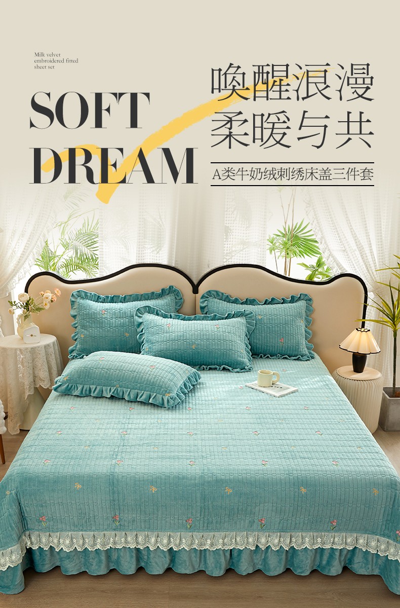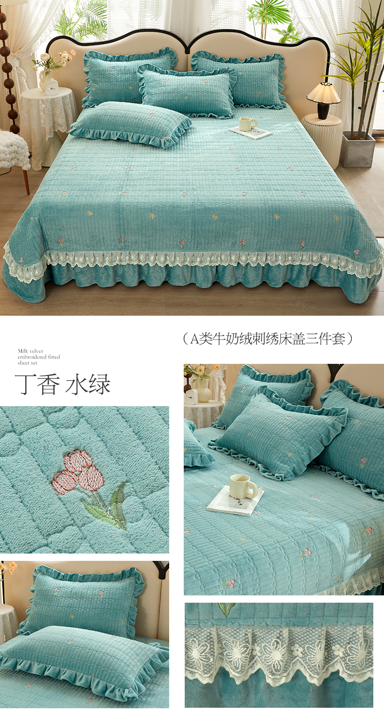 宜凡 2023新款牛奶绒夹棉绗缝绣花床盖三件套 丁香-水绿
