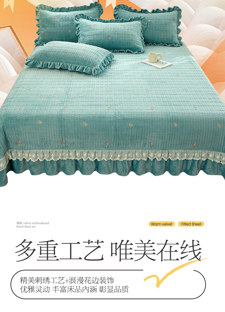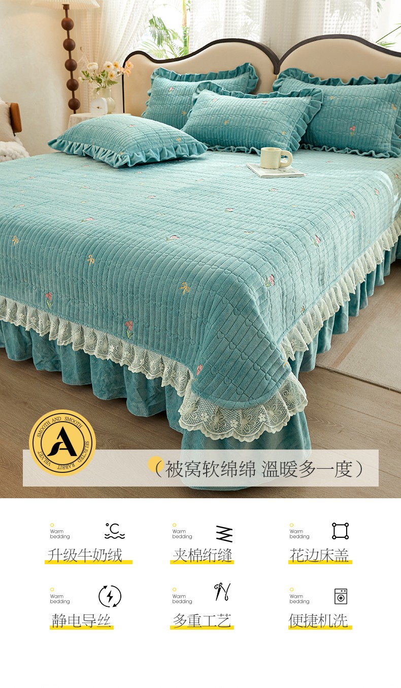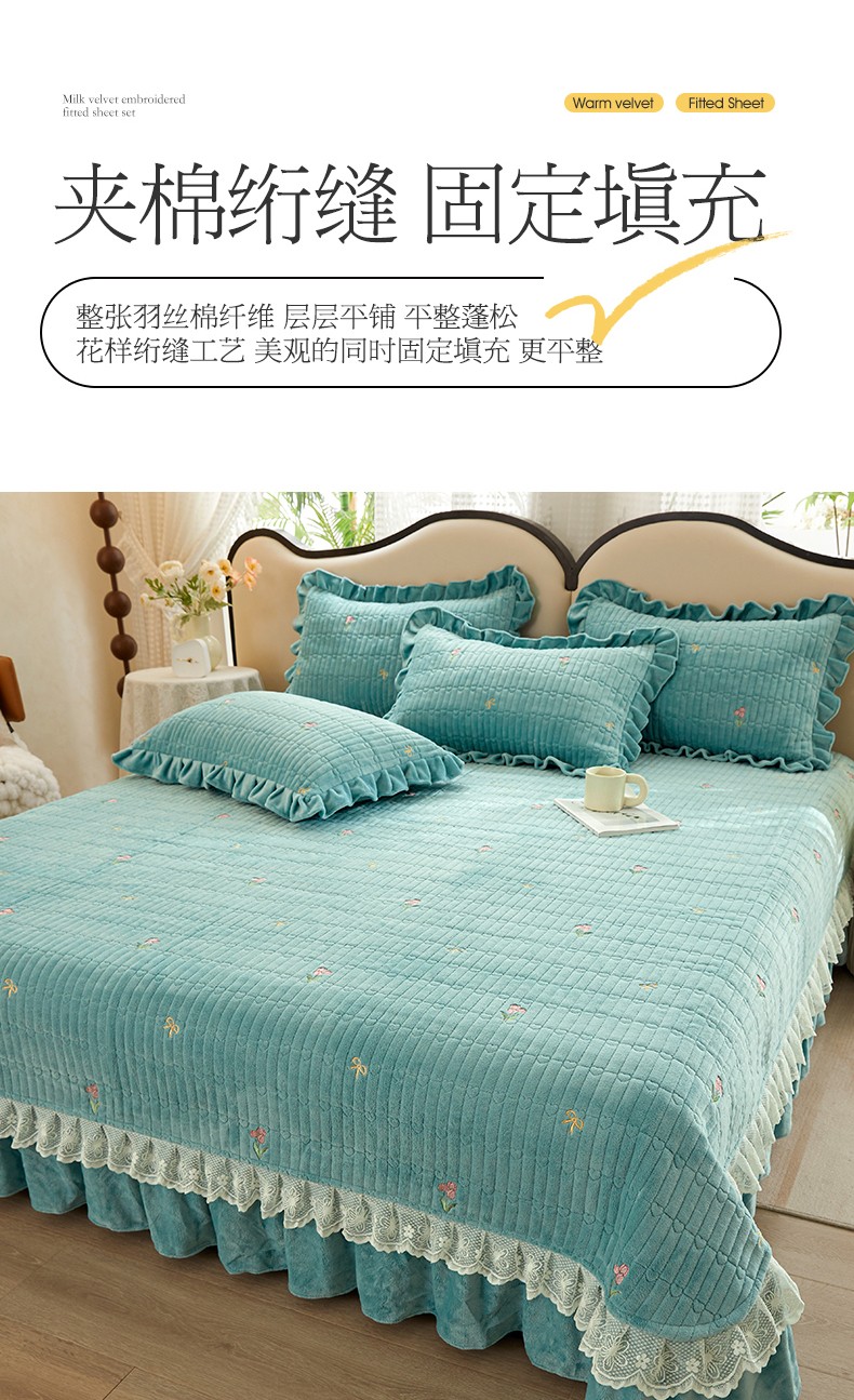 商品名称:宜凡 2023新款牛奶绒夹棉绗缝绣花床盖三件套 丁香-水绿