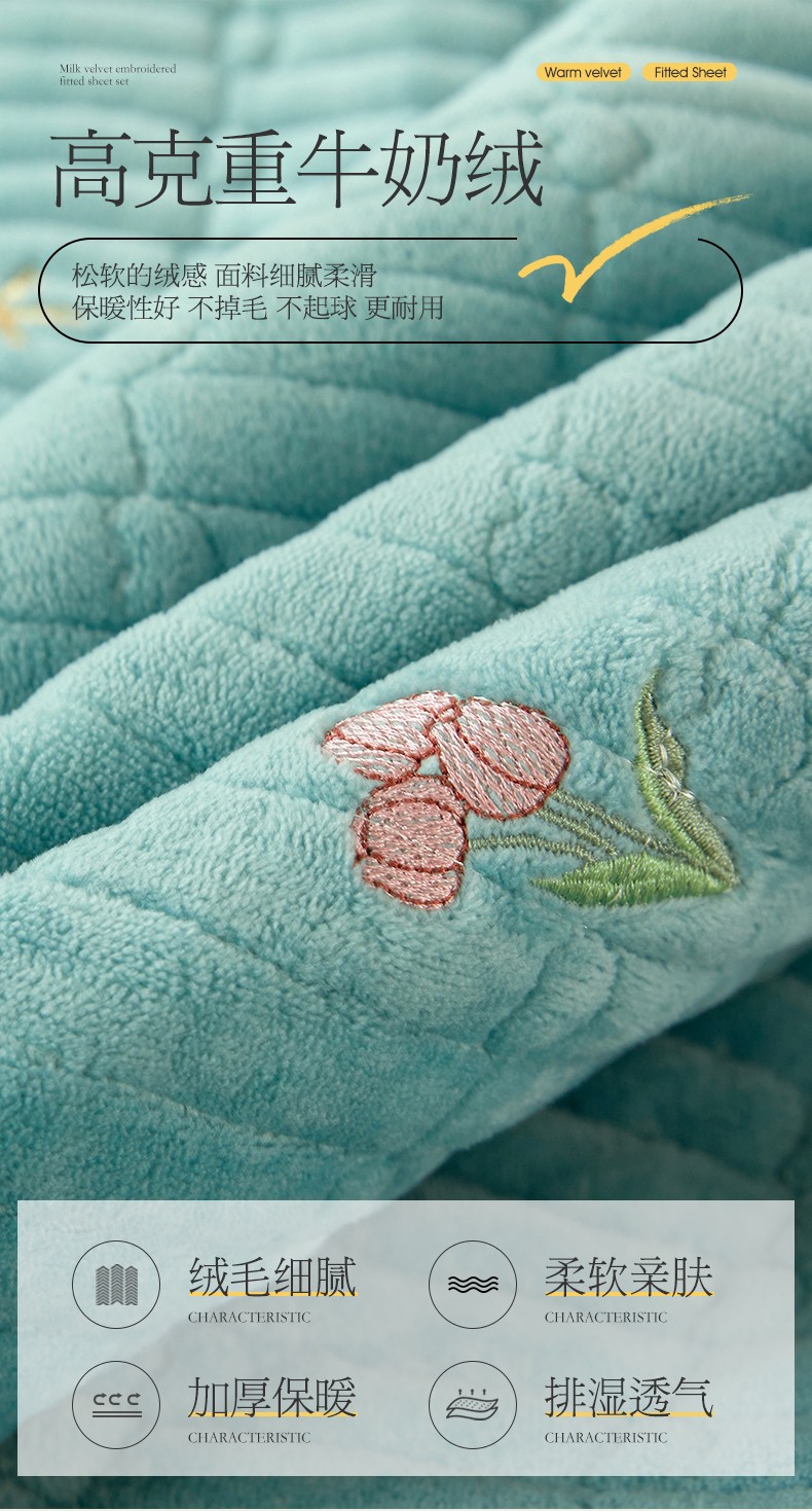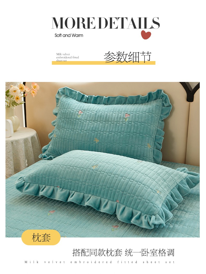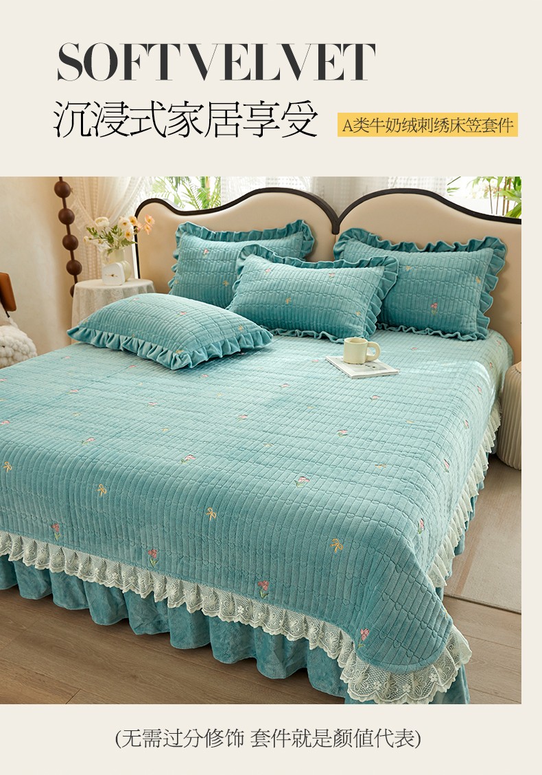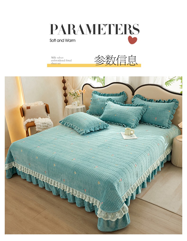 商品名称:宜凡 2023新款牛奶绒夹棉绗缝绣花床盖三件套 丁香-水绿
