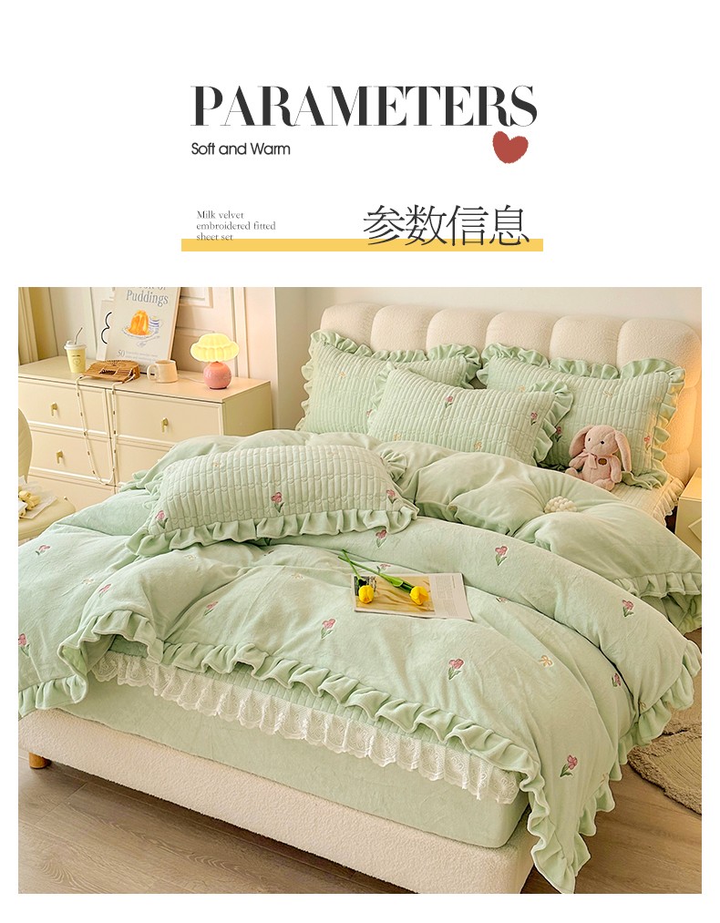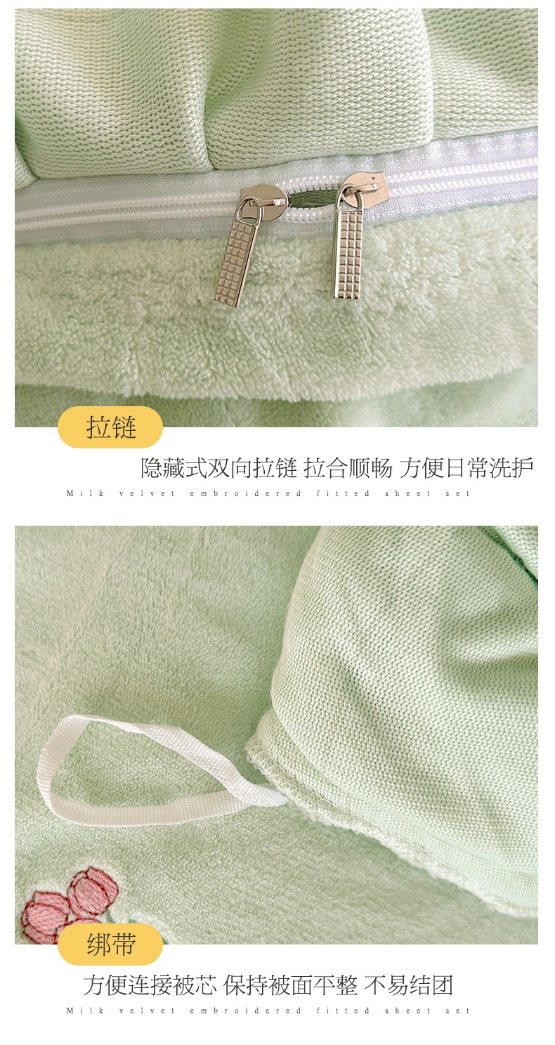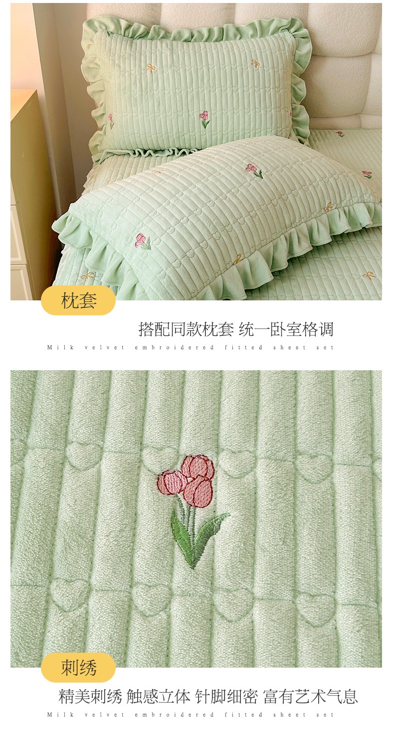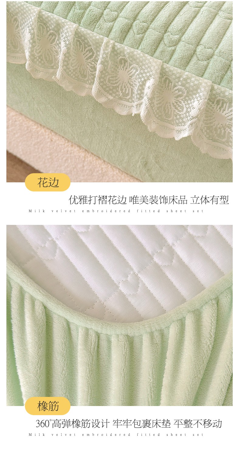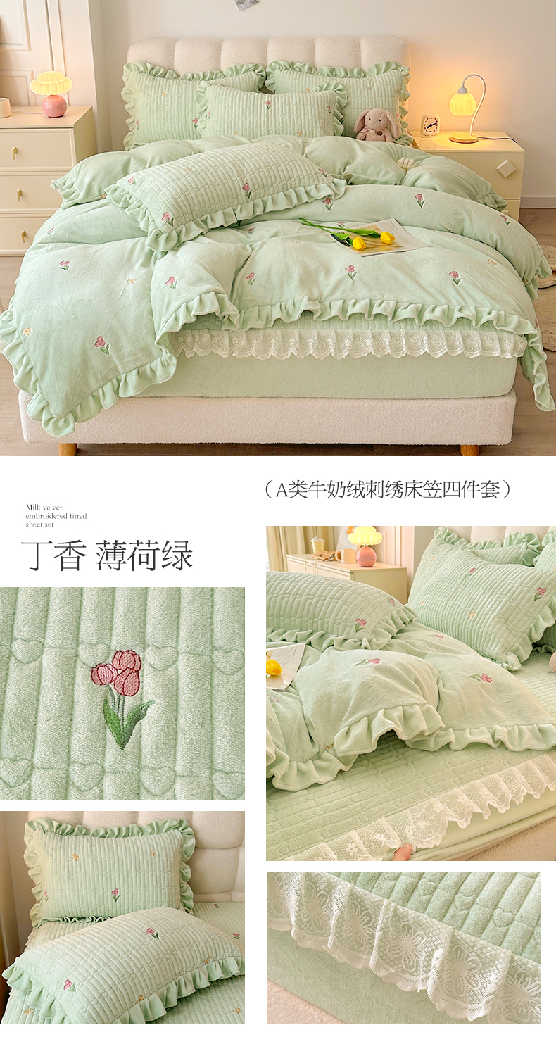 商品名称:宜凡 2023新款牛奶绒夹棉绗缝绣花床笠四件套 丁香-薄荷绿