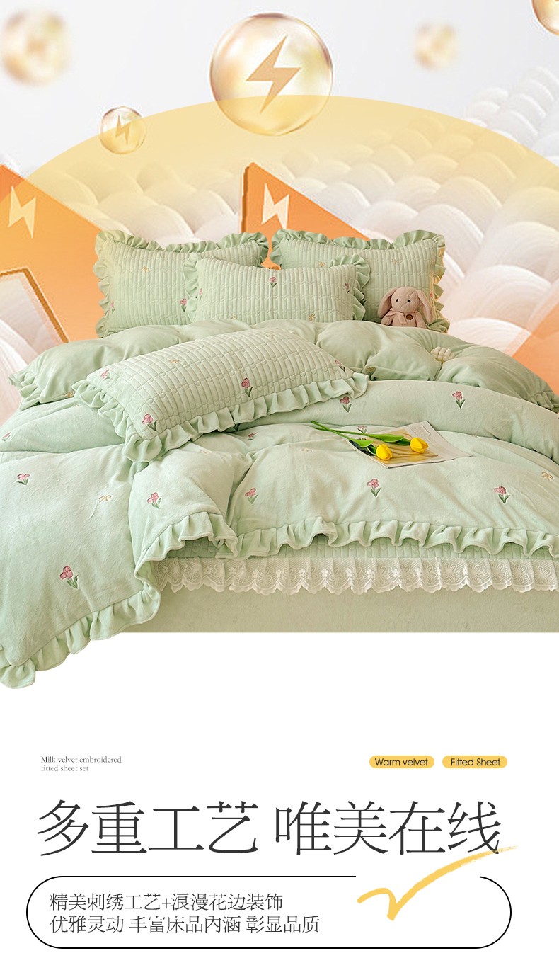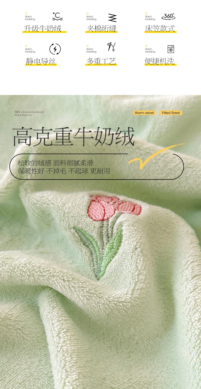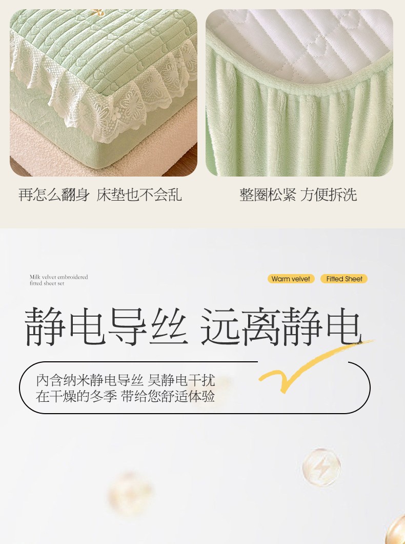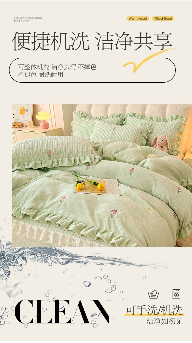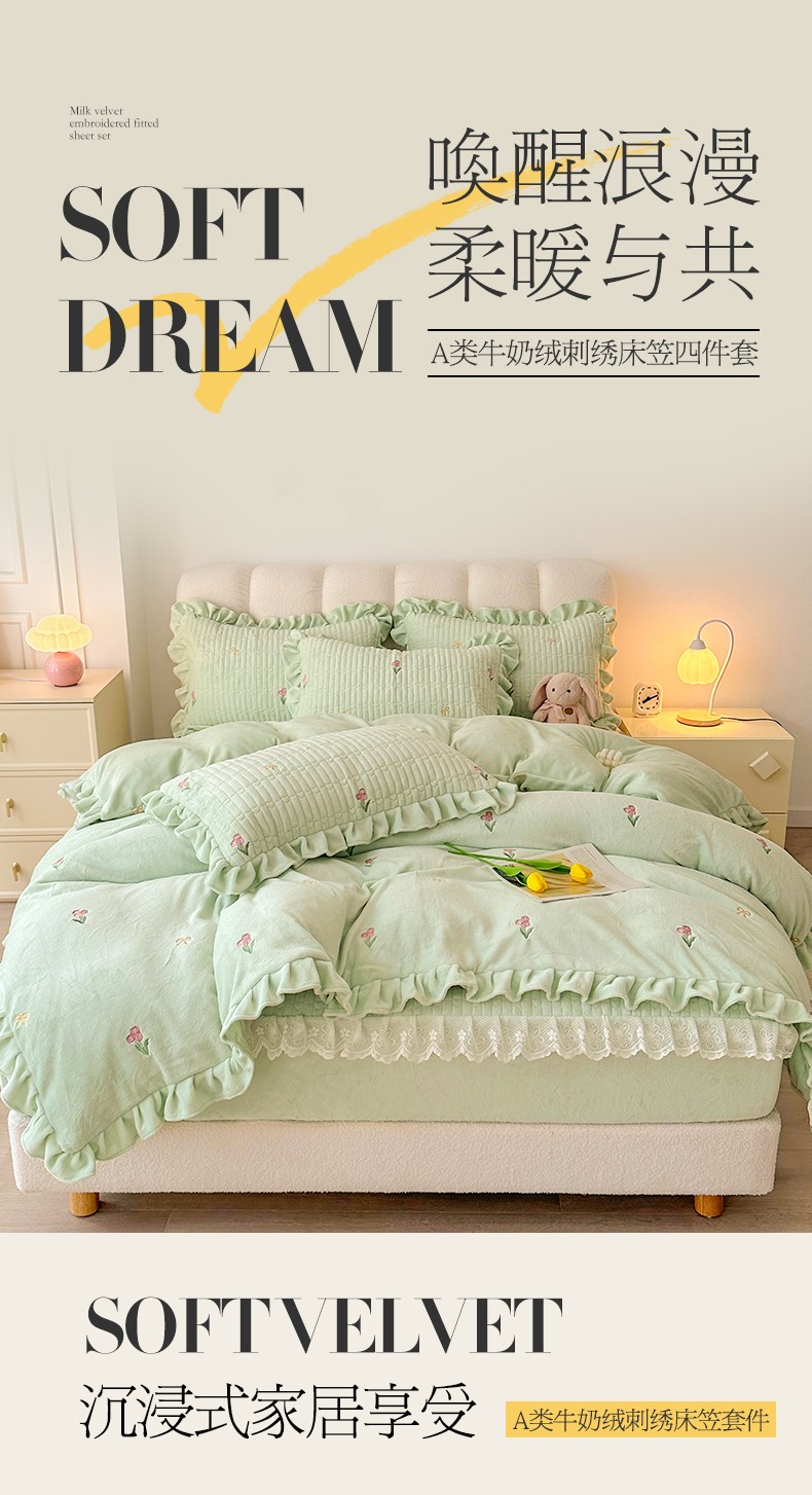 商品名称:宜凡 2023新款牛奶绒夹棉绗缝绣花床笠四件套 丁香-薄荷绿