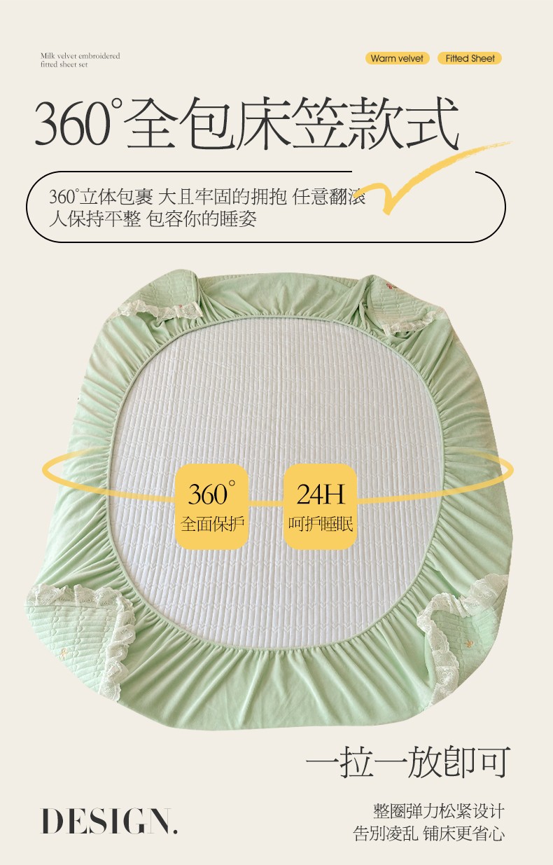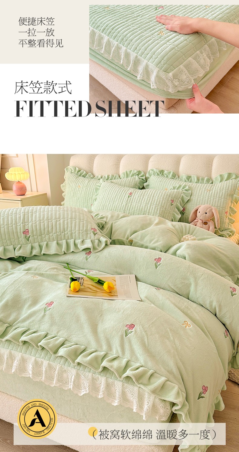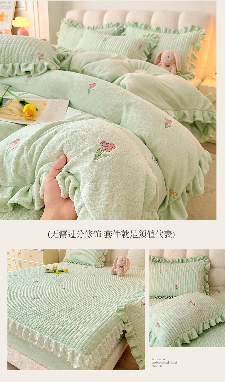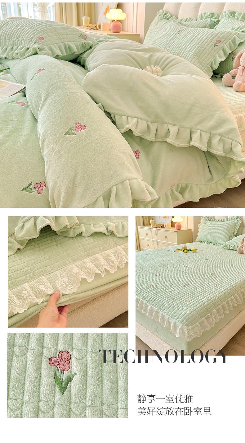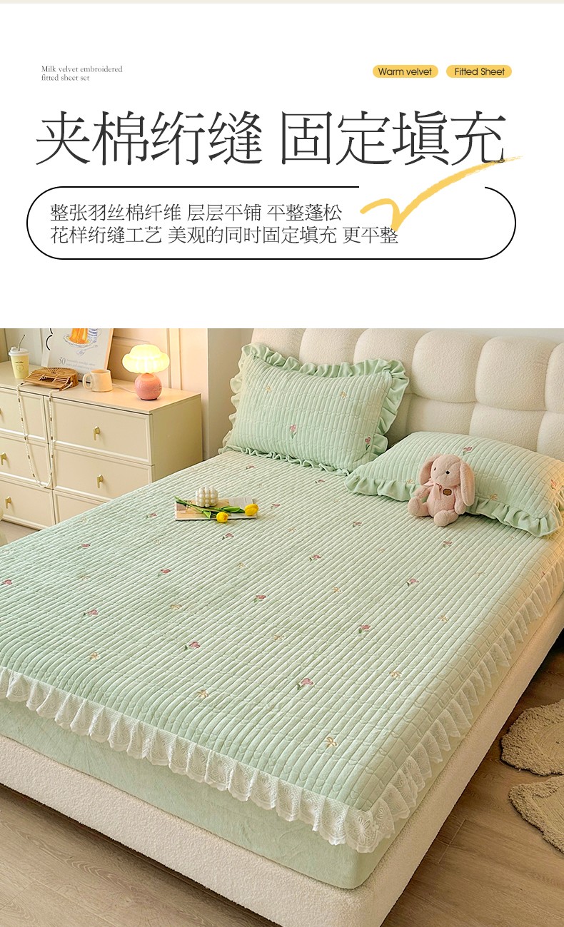 宜凡 2023新款牛奶绒夹棉绗缝绣花床笠四件套 丁香-薄荷绿