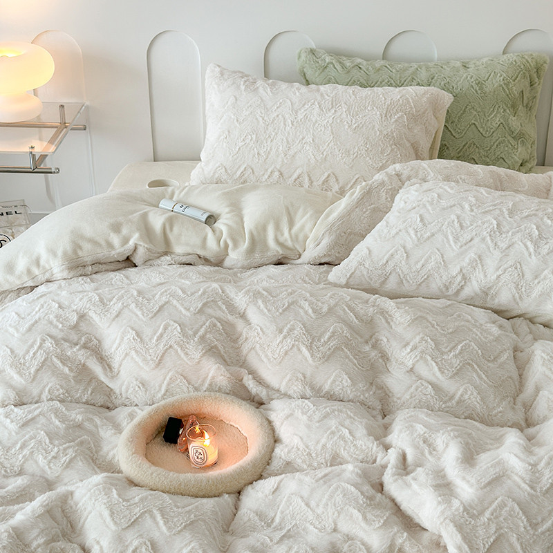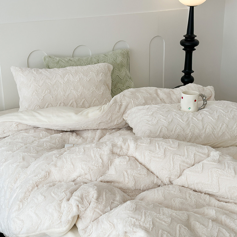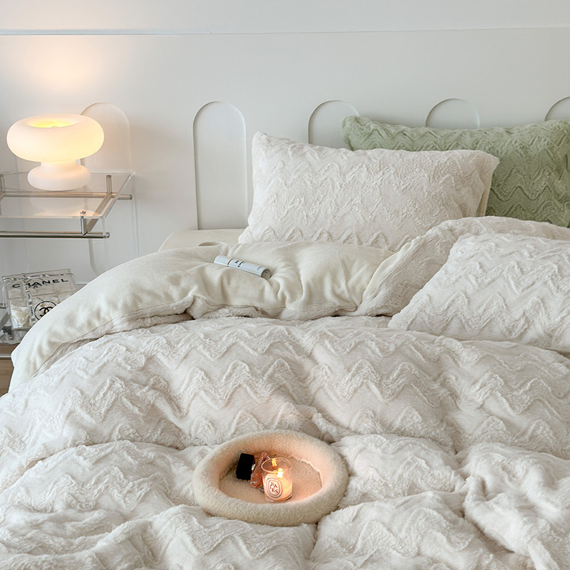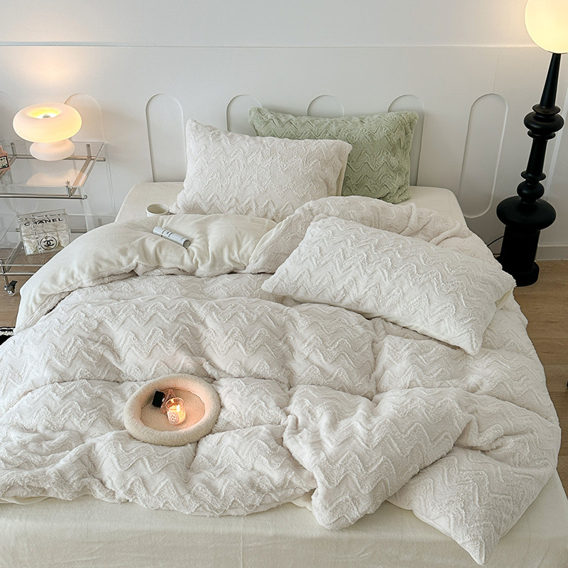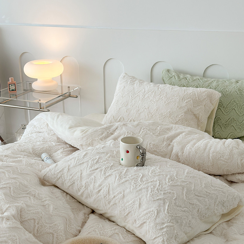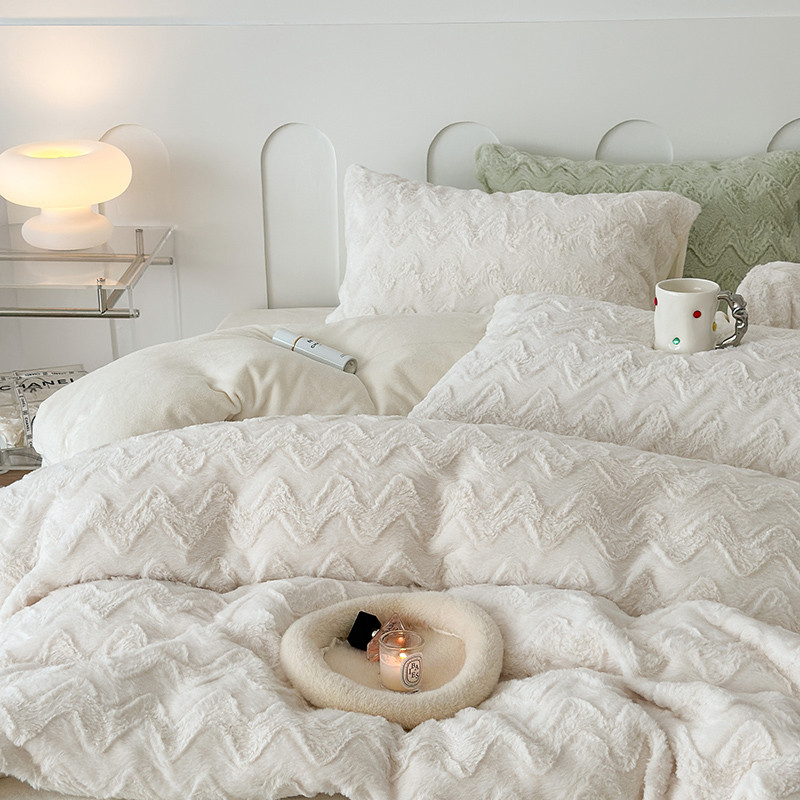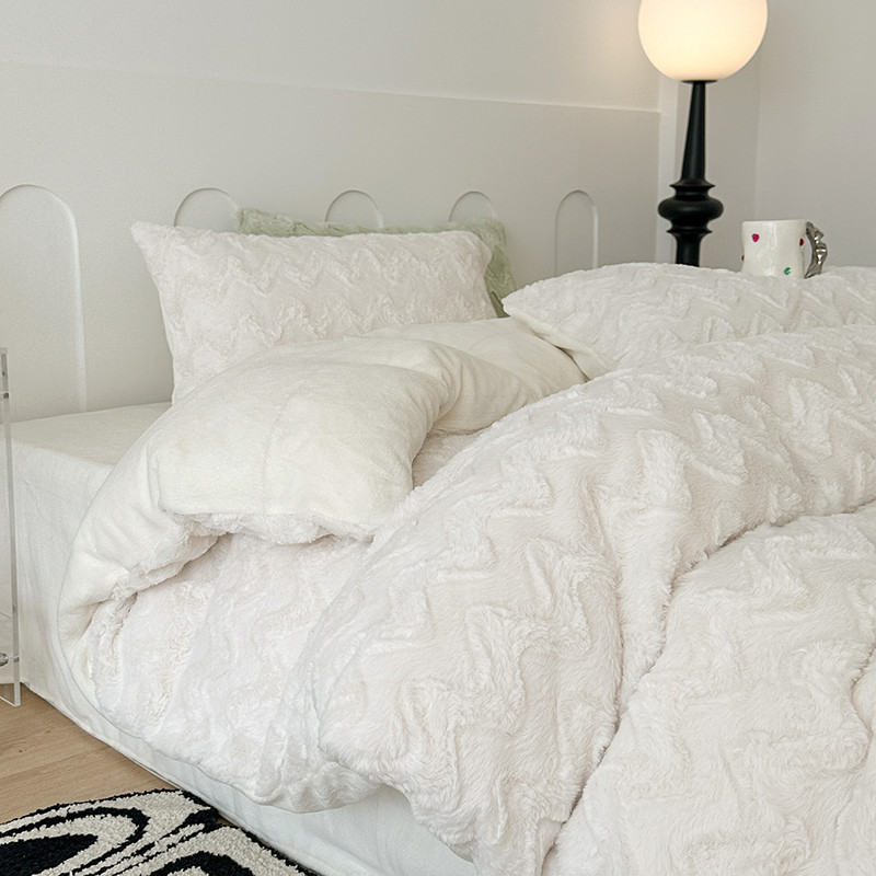 昔可家纺 2023新款ins风纯色兔兔绒兔毛四件套 奶白波纹