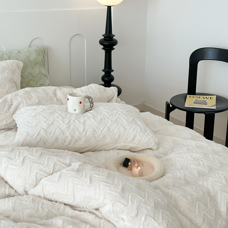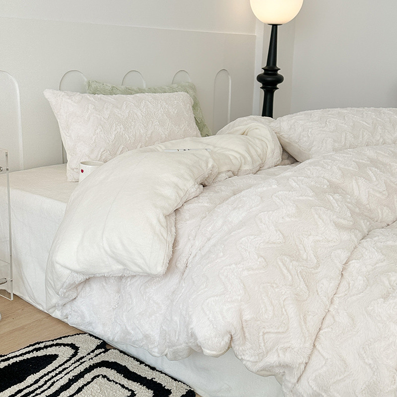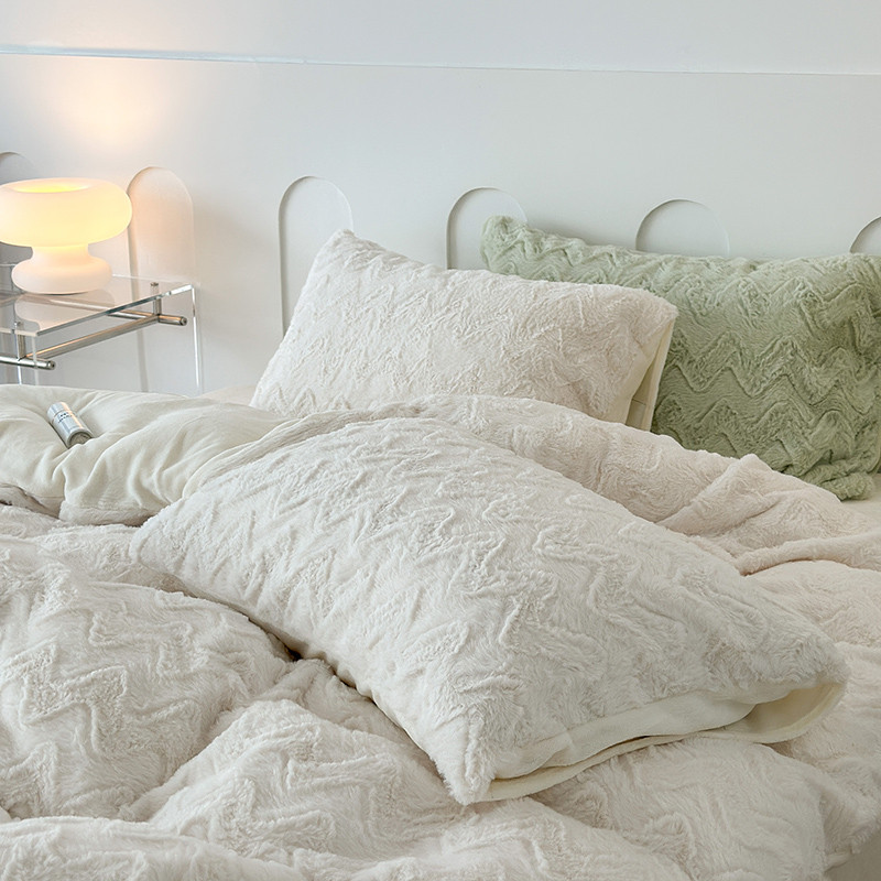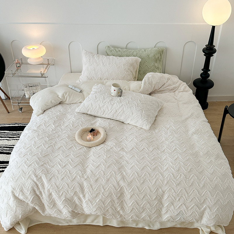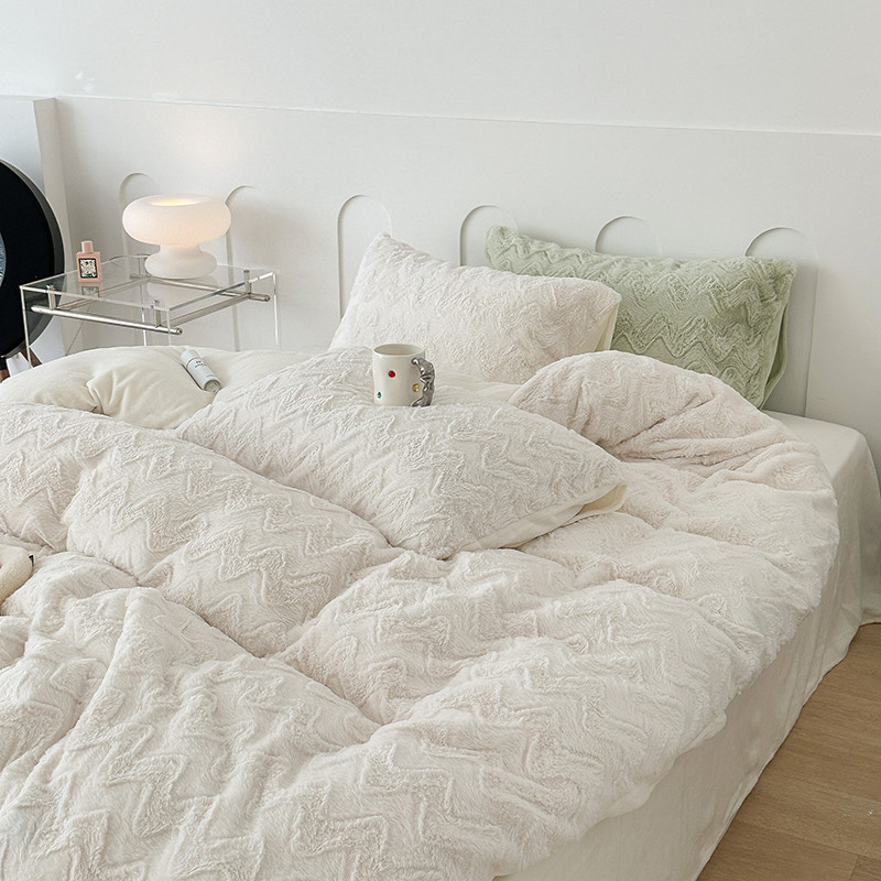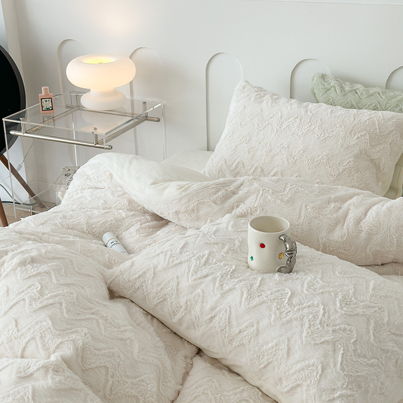 昔可家纺 2023新款ins风纯色兔兔绒兔毛四件套 奶白波纹