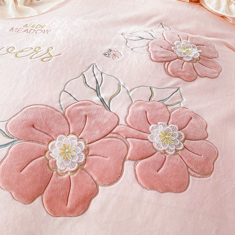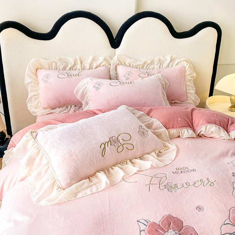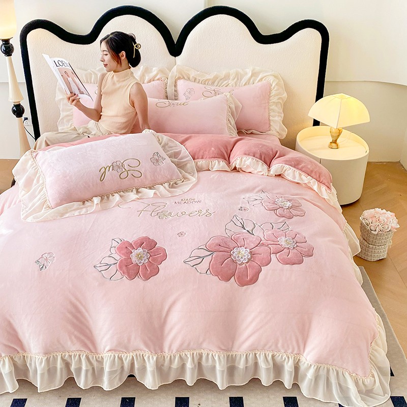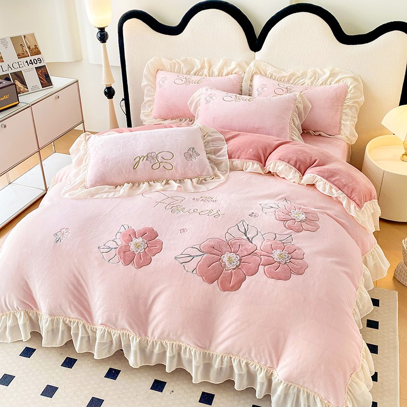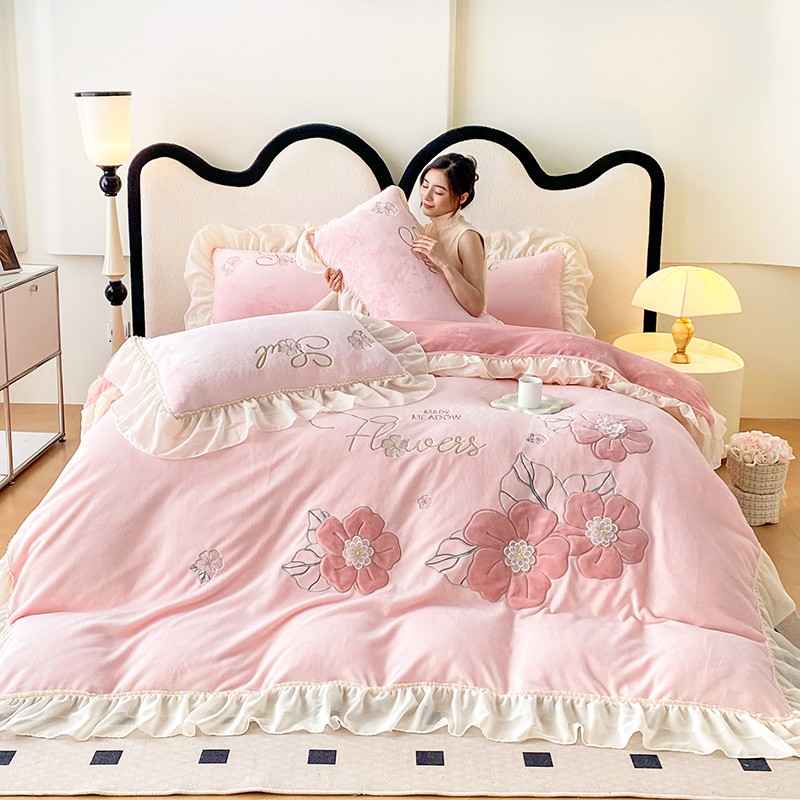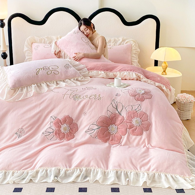 苏米娜9.5斤韩版雪纺花边公主粉绒牛奶绒拼接贴布绣四件套法式婴儿绒