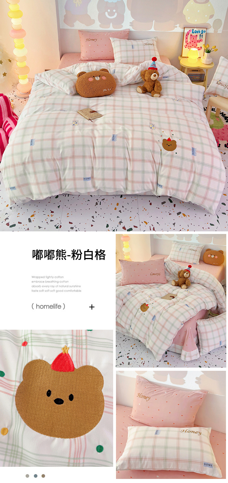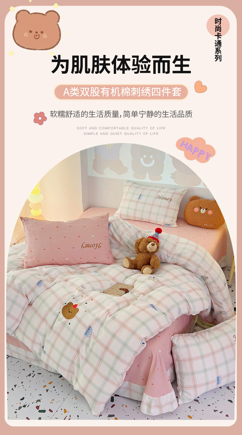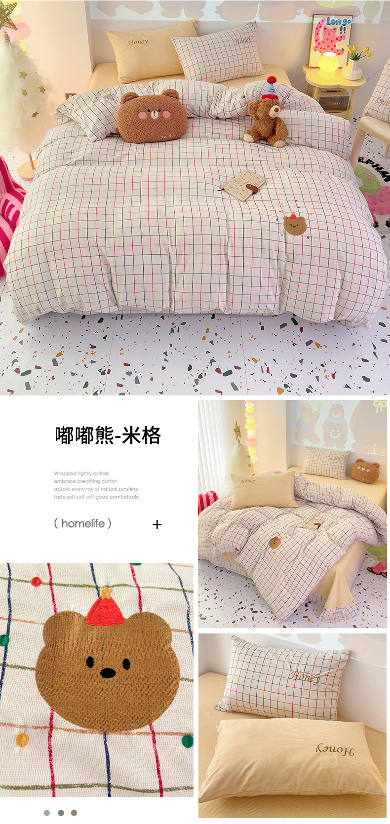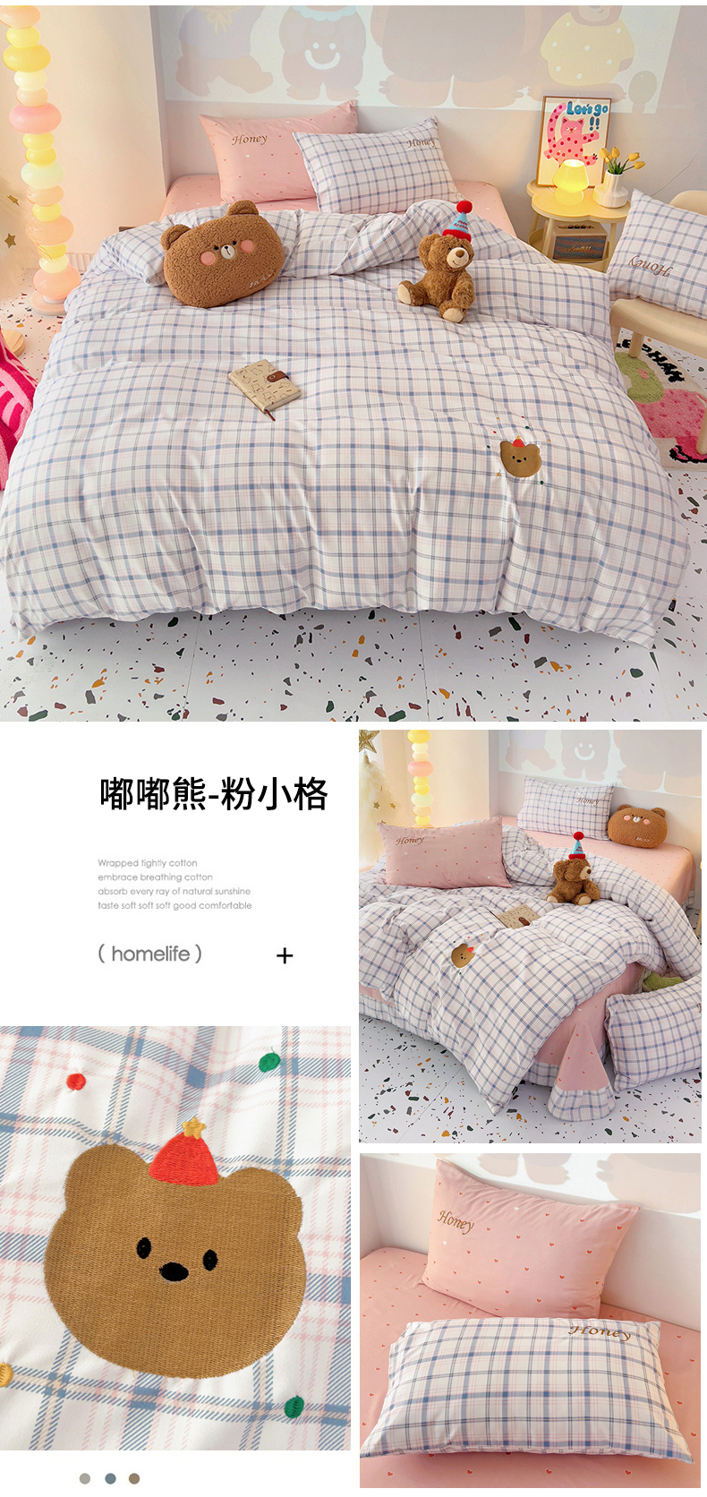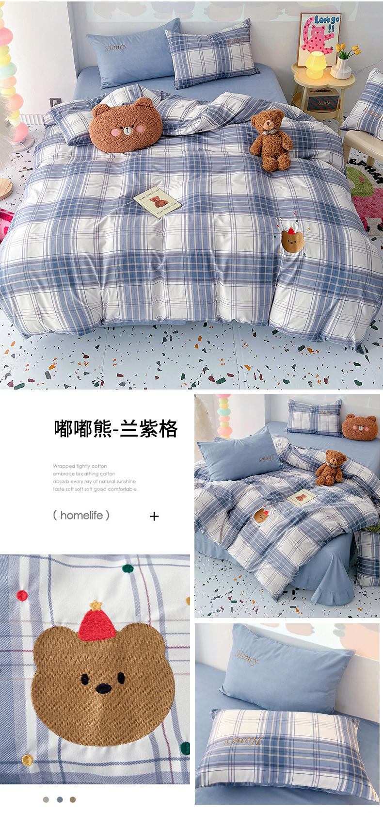 (总)庭笙 新款A类双股有机棉卡通刺绣时尚纯色格子四件套-嘟嘟熊系列