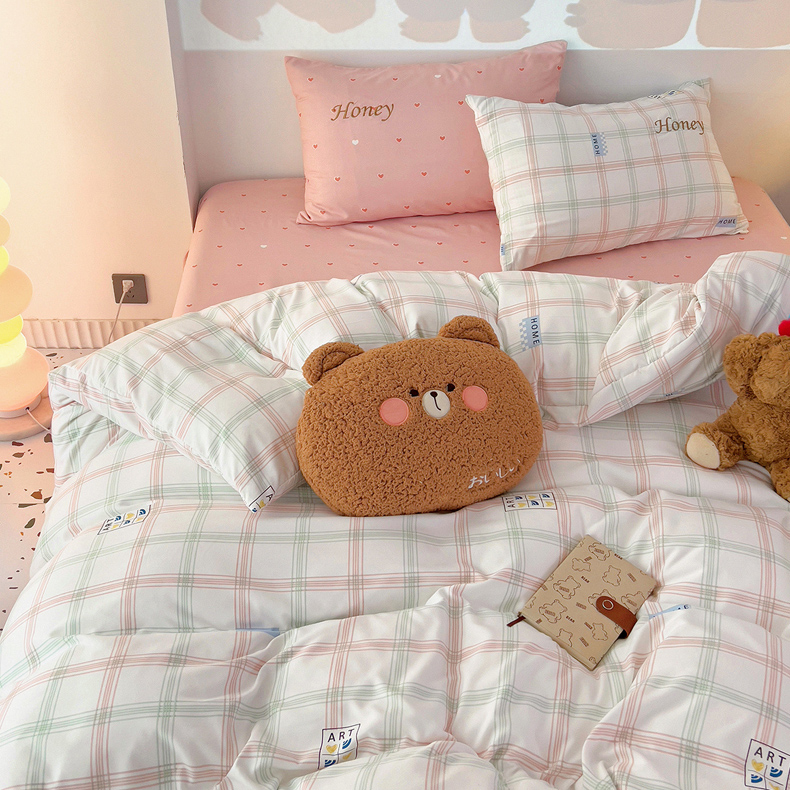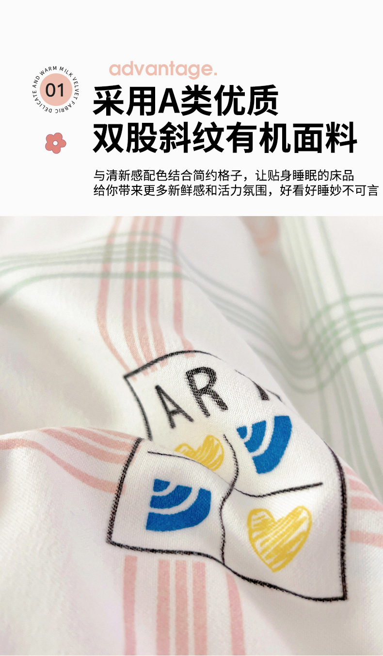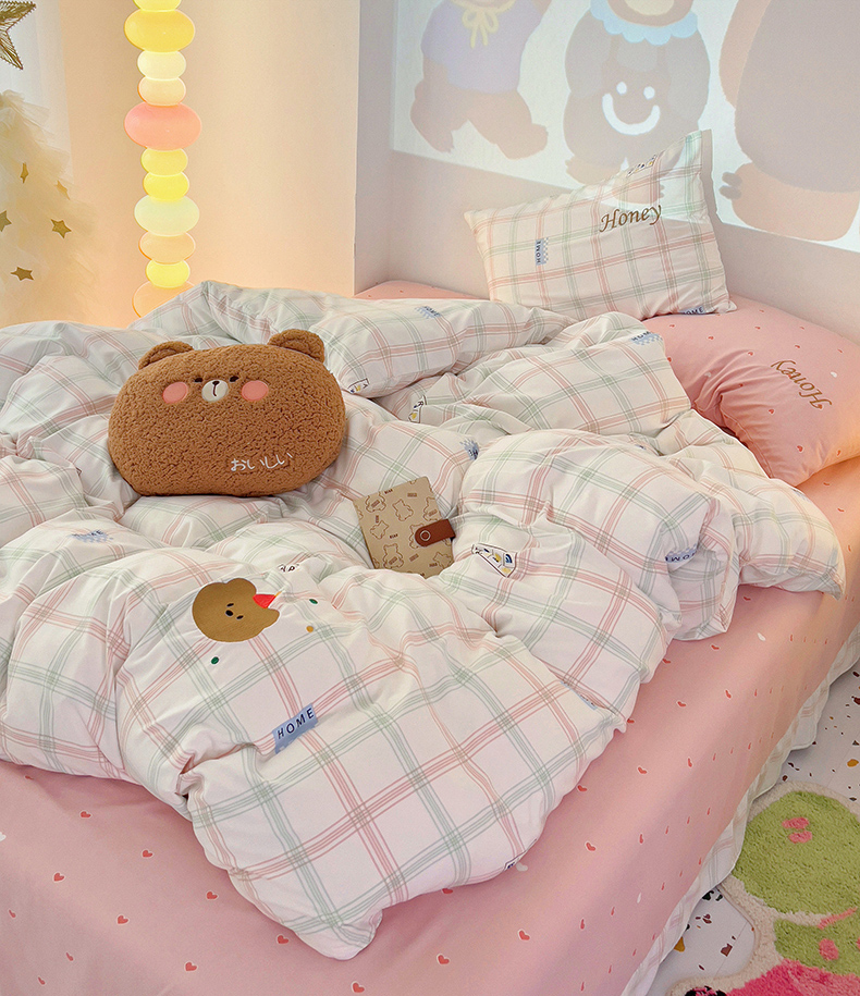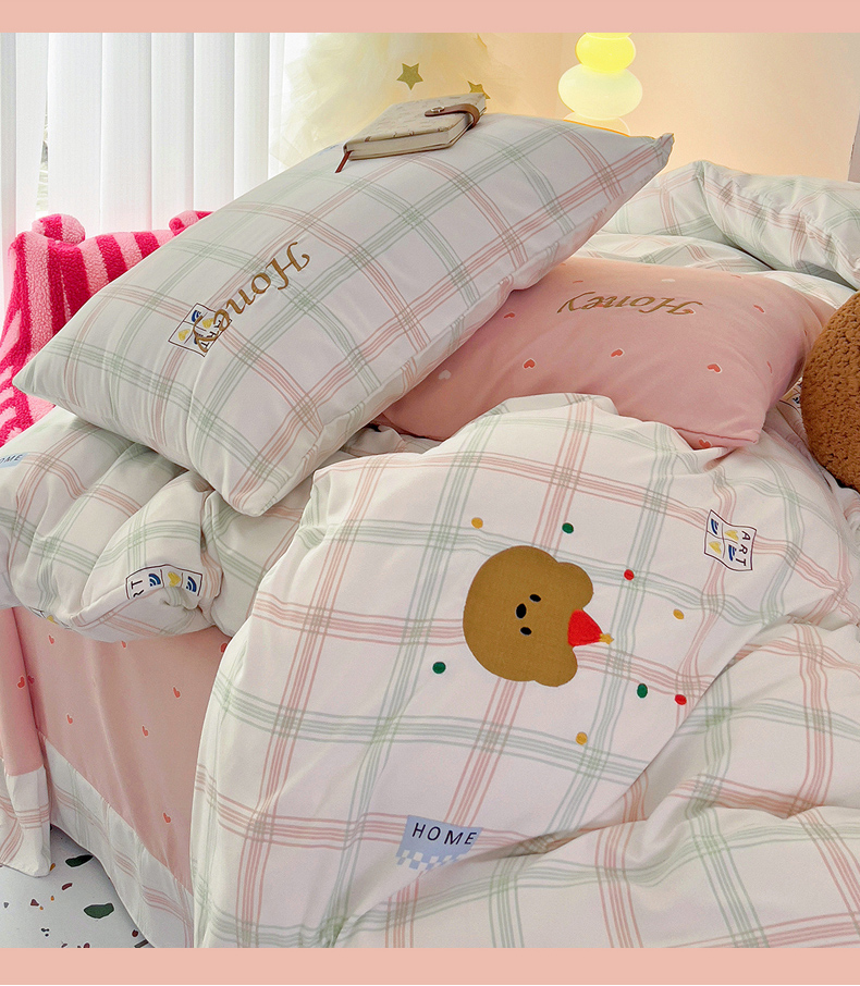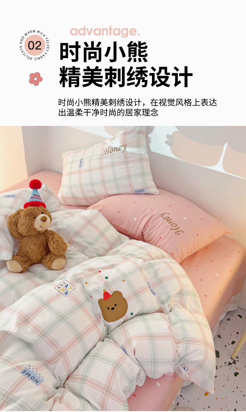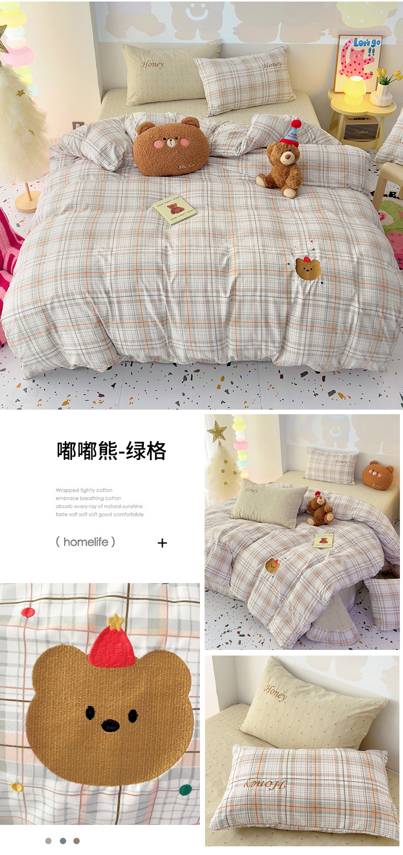 (总)庭笙 新款A类双股有机棉卡通刺绣时尚纯色格子四件套-嘟嘟熊系列