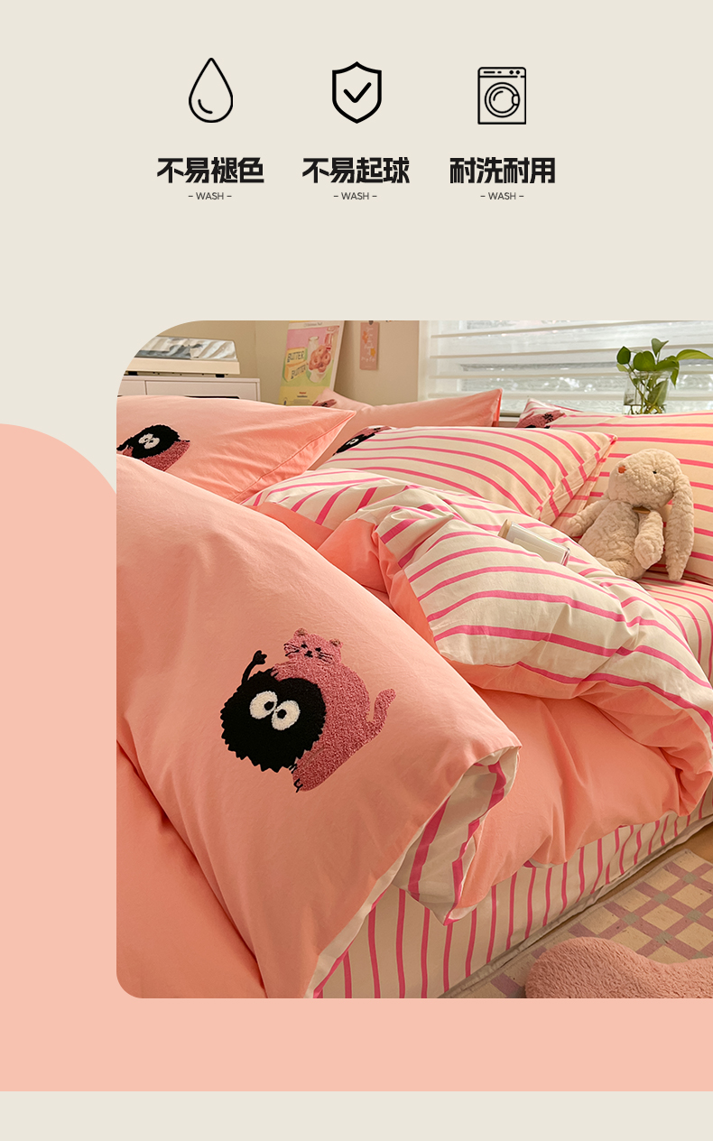 雅居纺家纺 2024新款全棉水洗棉绣花四件套 猫咪萌仔