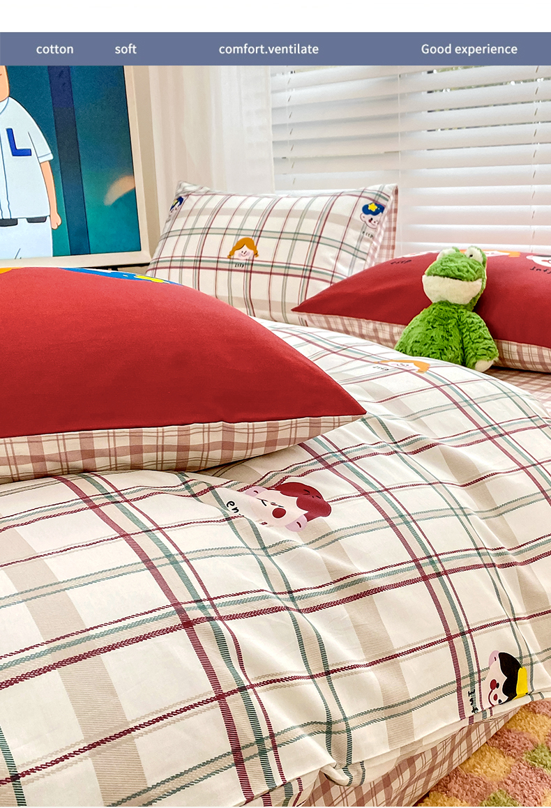 (总)花漾家居 2025新款无印宿舍简约全棉色织水洗棉毛巾绣四件套,粉咖格,红咖格,红中格,灰咖格,咖中格,蓝咖格,绿咖格