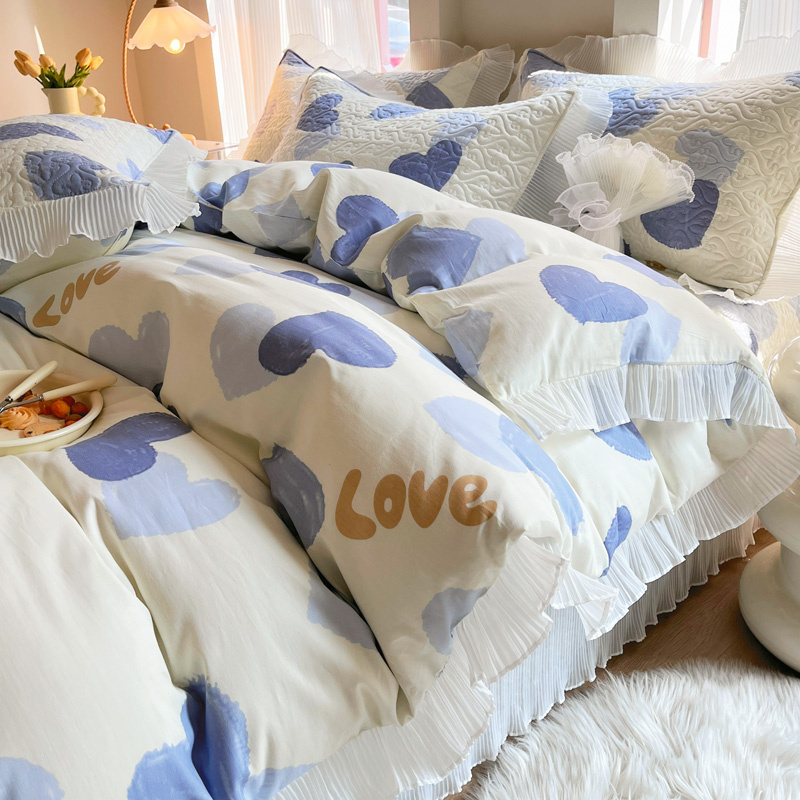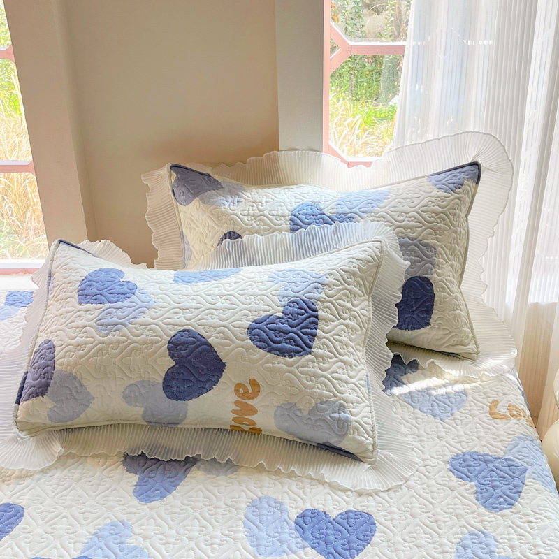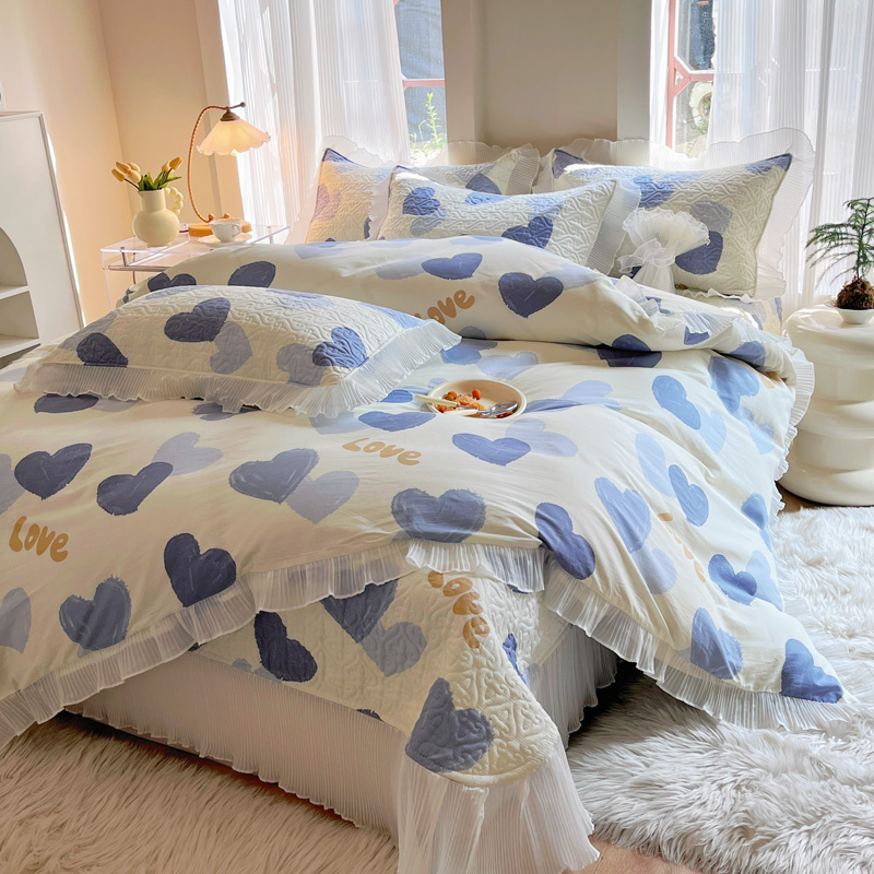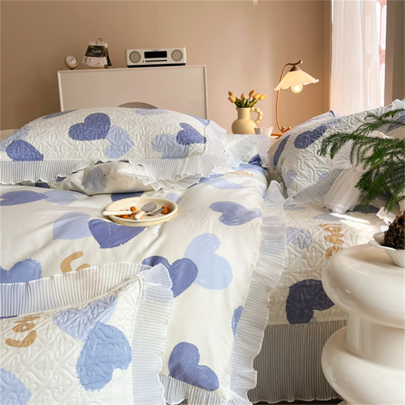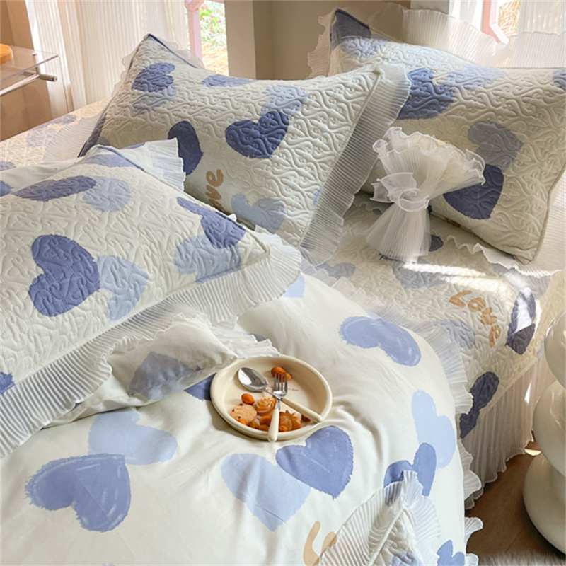 商品名称:添越 2024小清新韩版蕾丝花边纯棉夹棉床盖三件套全棉-怦然心动-蓝
