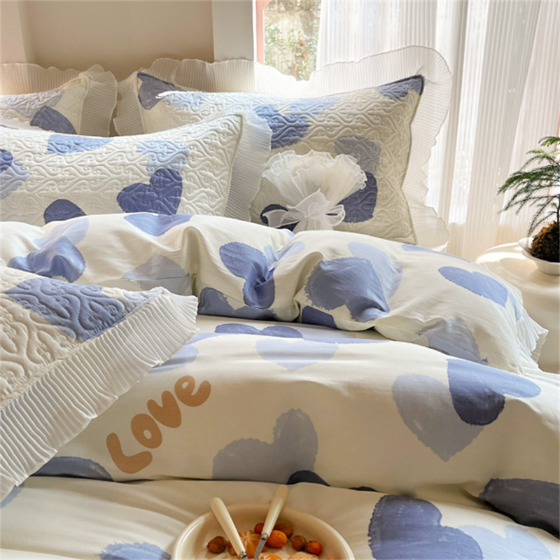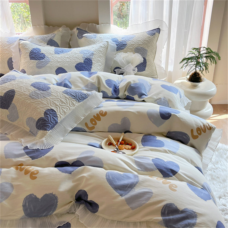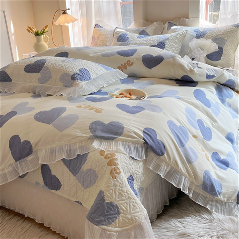 添越 2024小清新韩版蕾丝花边纯棉夹棉床盖三件套全棉-怦然心动-蓝