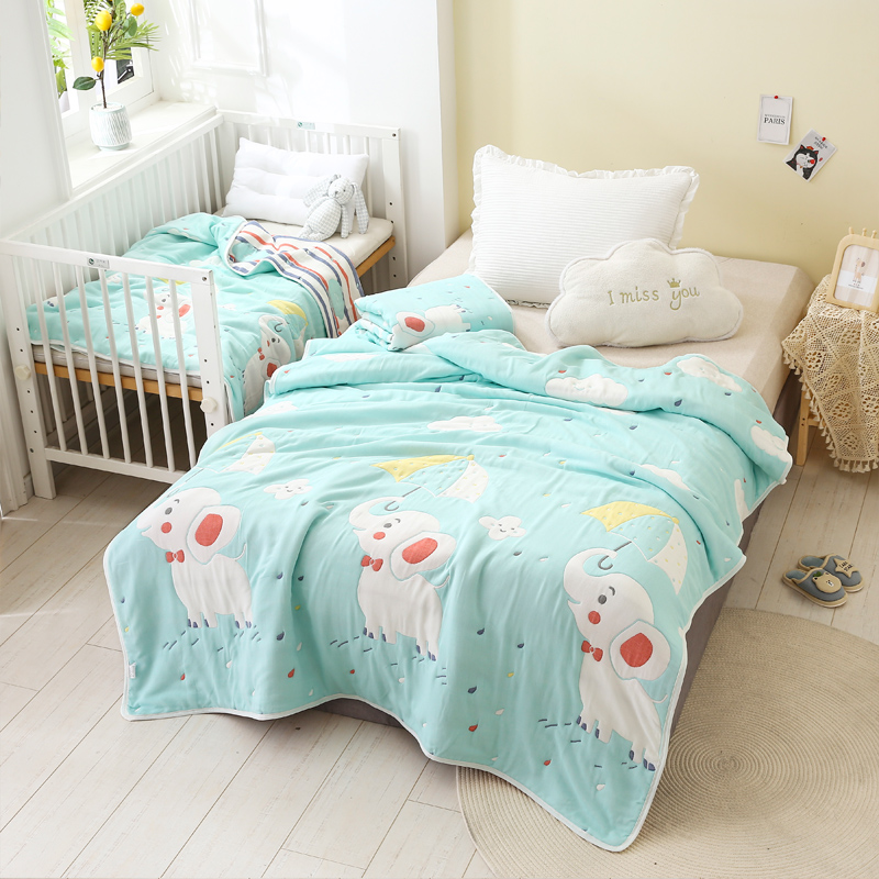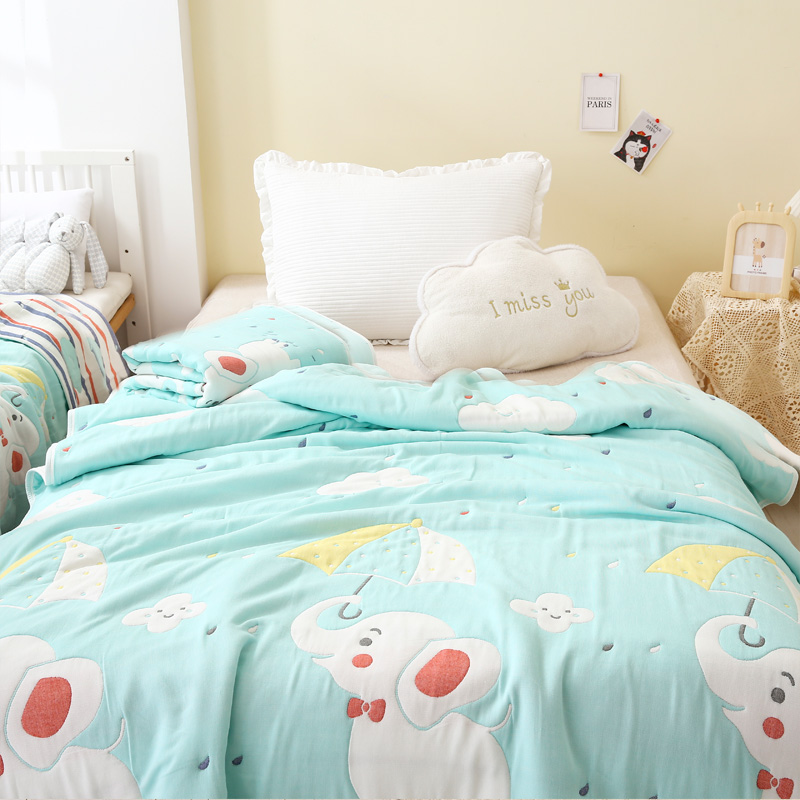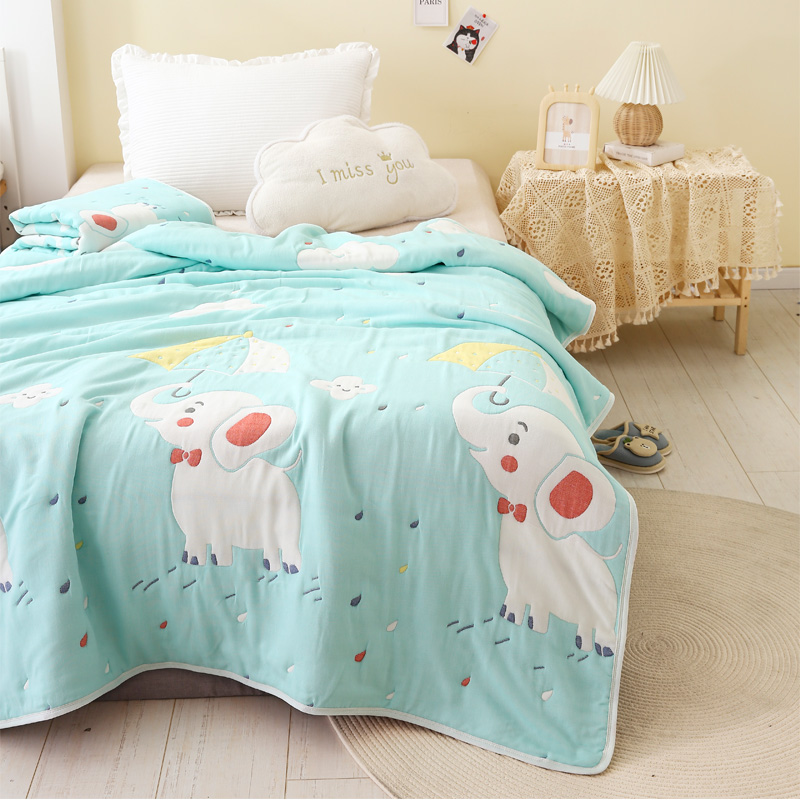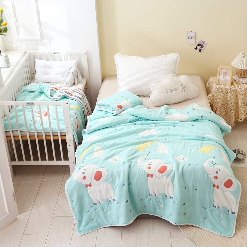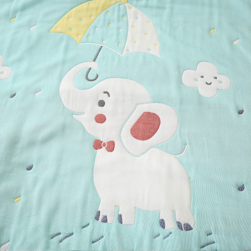朴尔家纺-毛巾被 2024年全棉十层纱布加厚儿童盖被毛巾被 打伞的小象绿