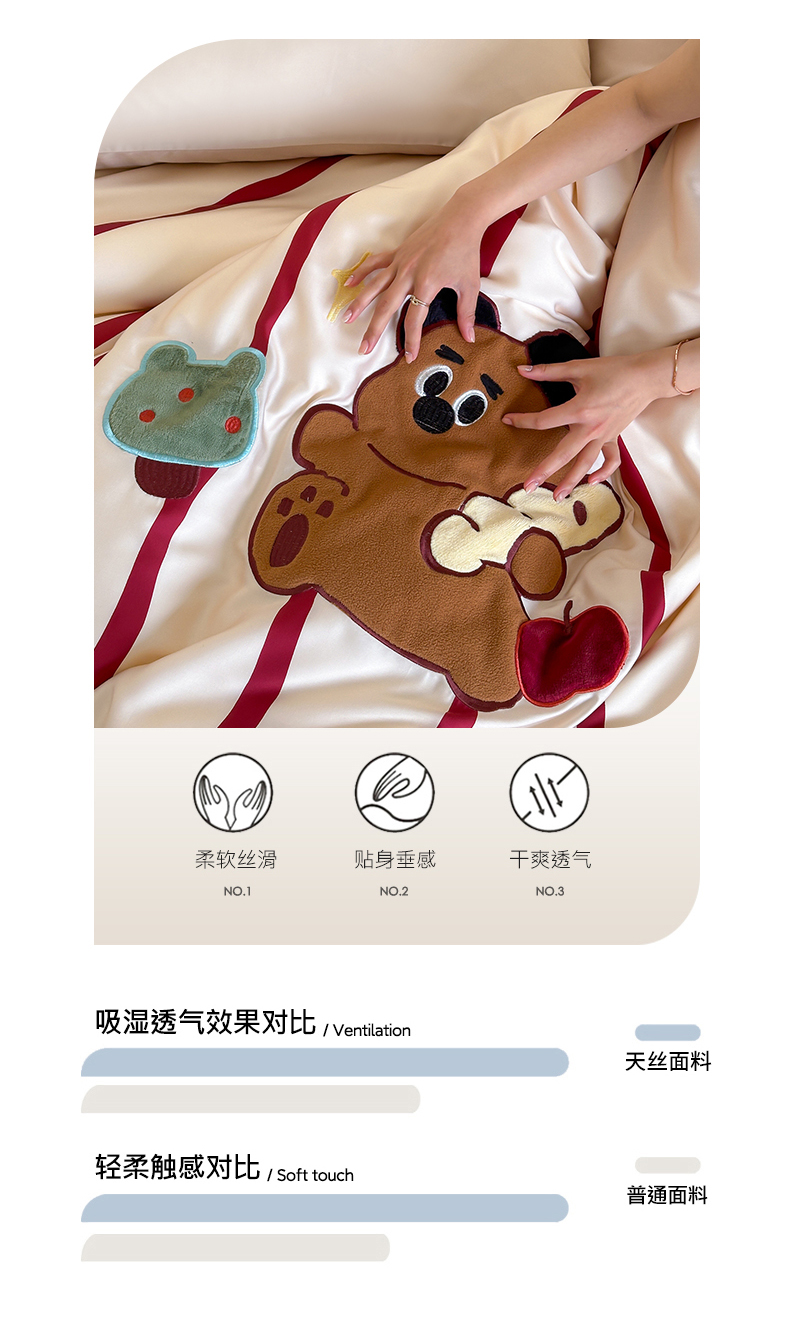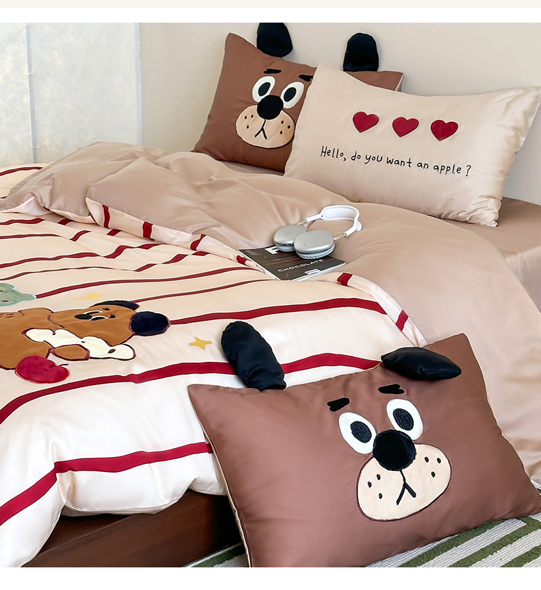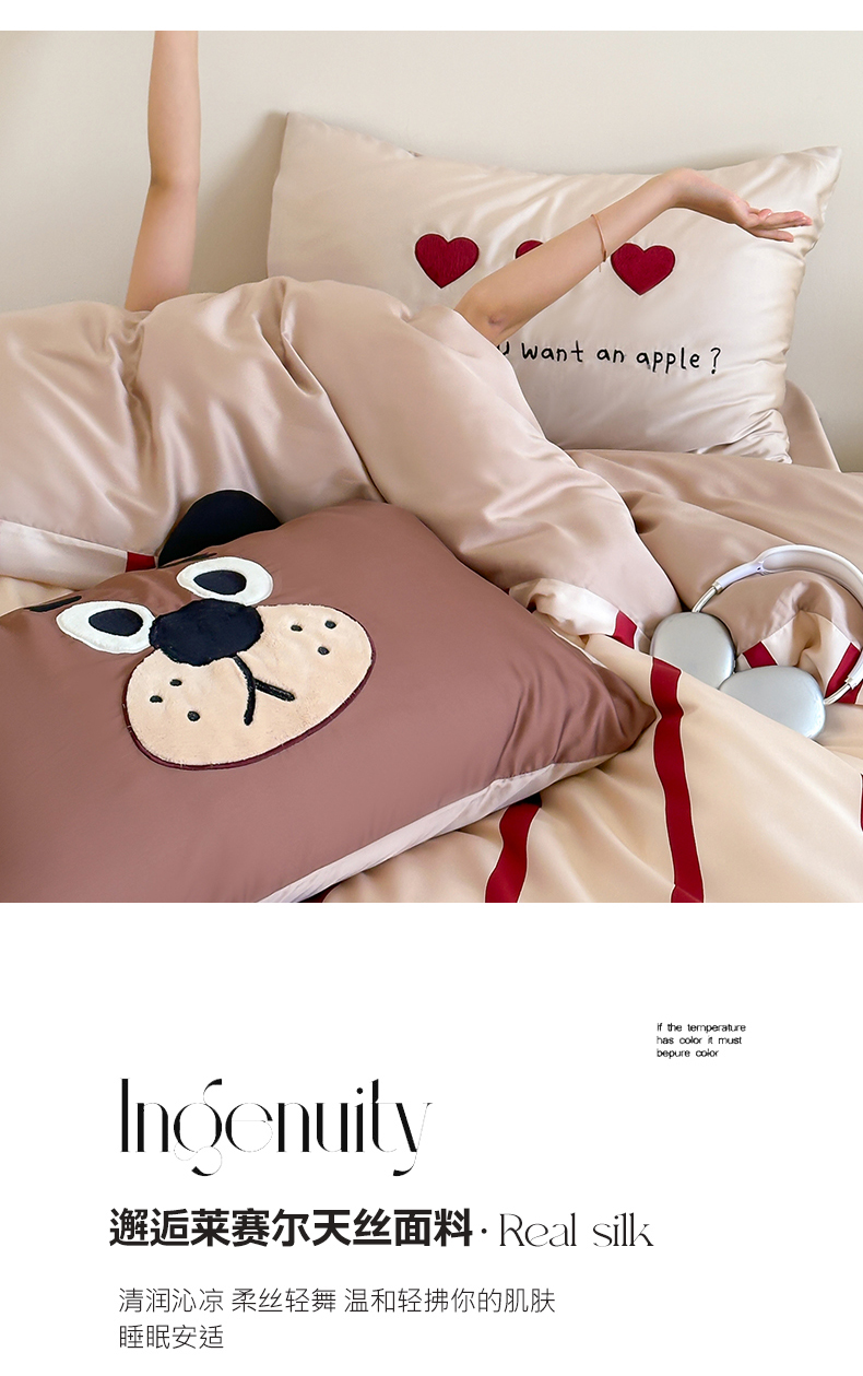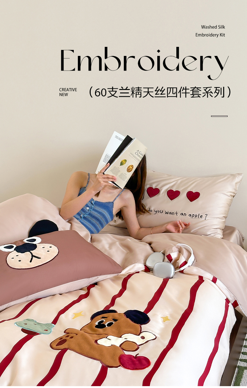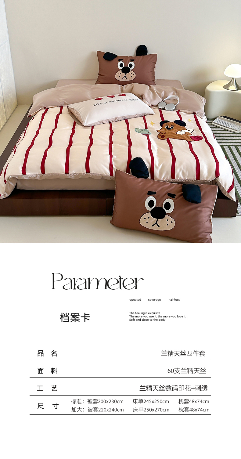 (总)黛舒家居 2024新款60支莱赛尔数码印花卡通刺绣四件套,黑色猫咪,面包熊,小树熊