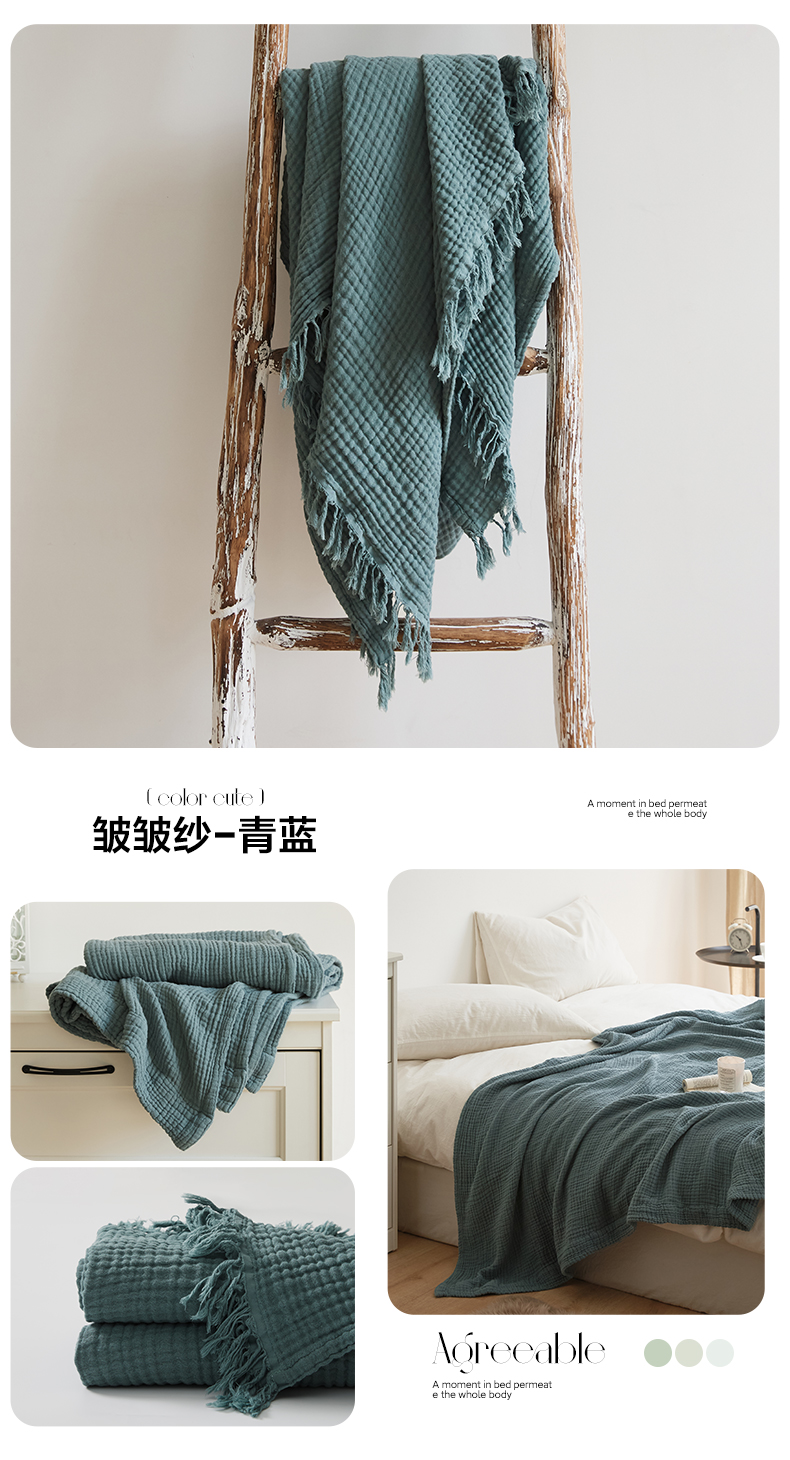 商品名称:EH家居 2024新款纯棉四层皱皱纱毯盖毯休闲毯 流苏款-青蓝