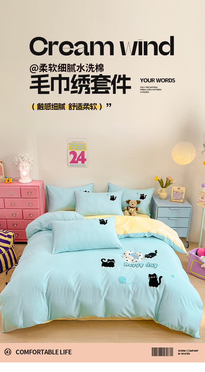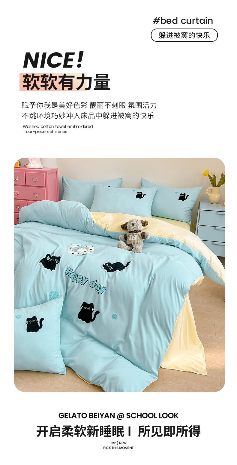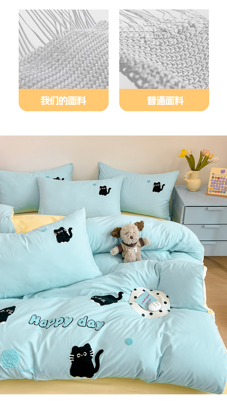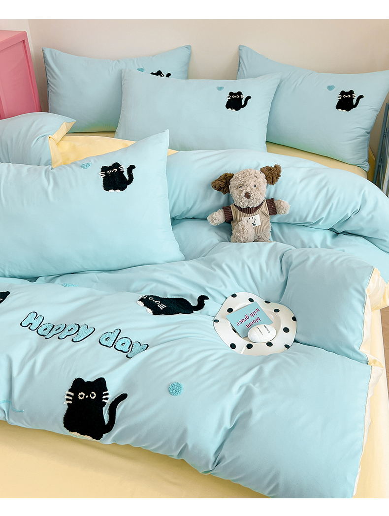 当前位置: 91家纺网 > 商品网购 > 床品套件 > 四件套 > 水洗棉四件套 > 我心家纺 2024新款水洗棉毛巾绣四件套-小黑猫 小黑猫-蓝黄