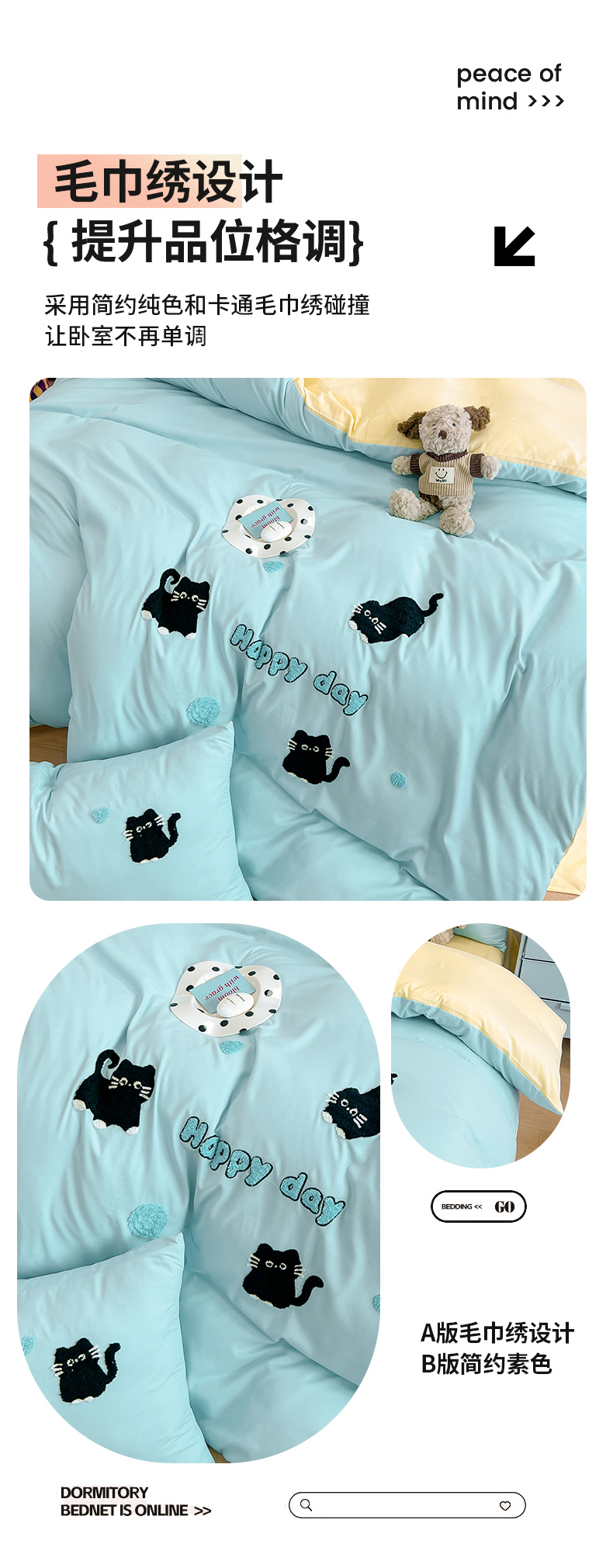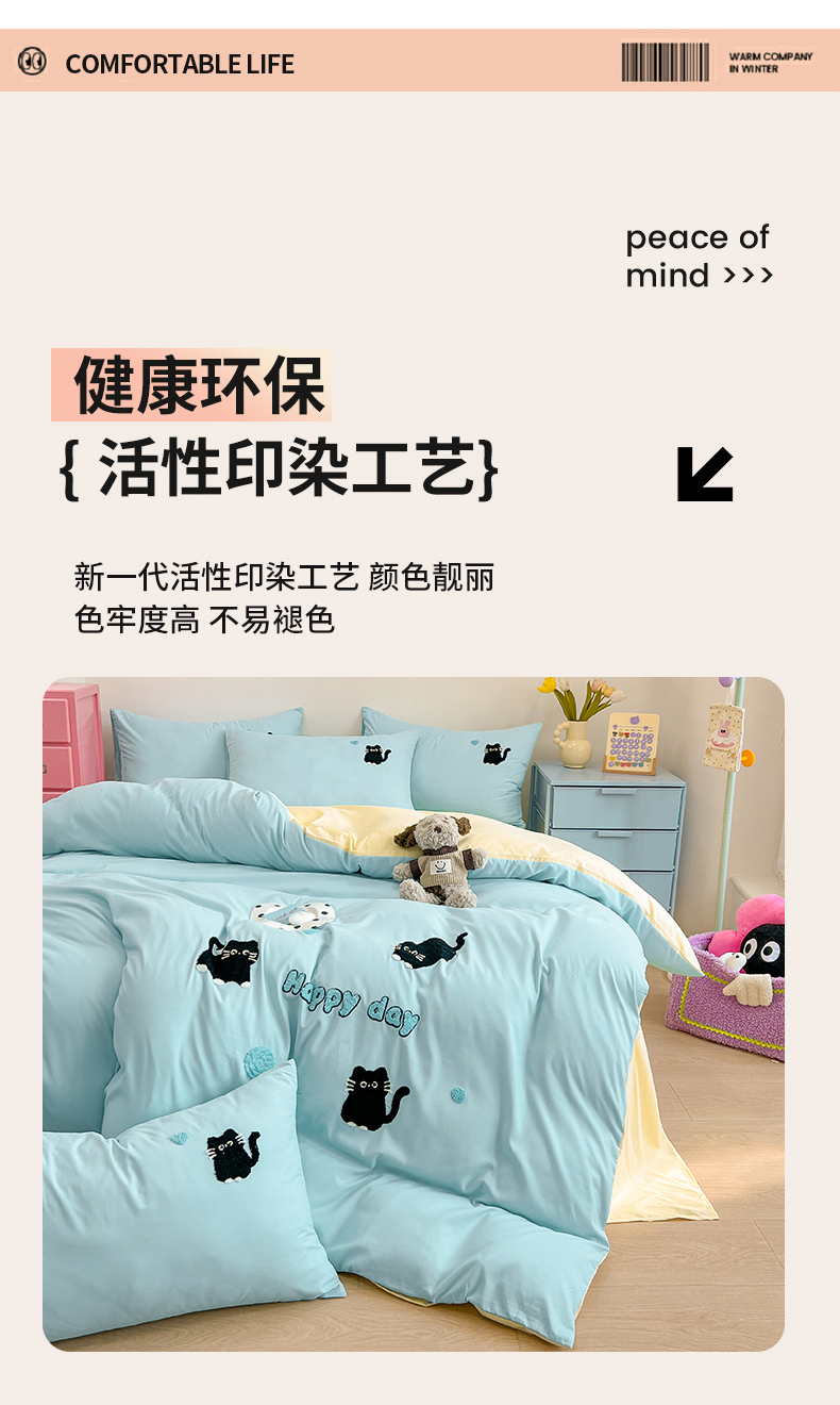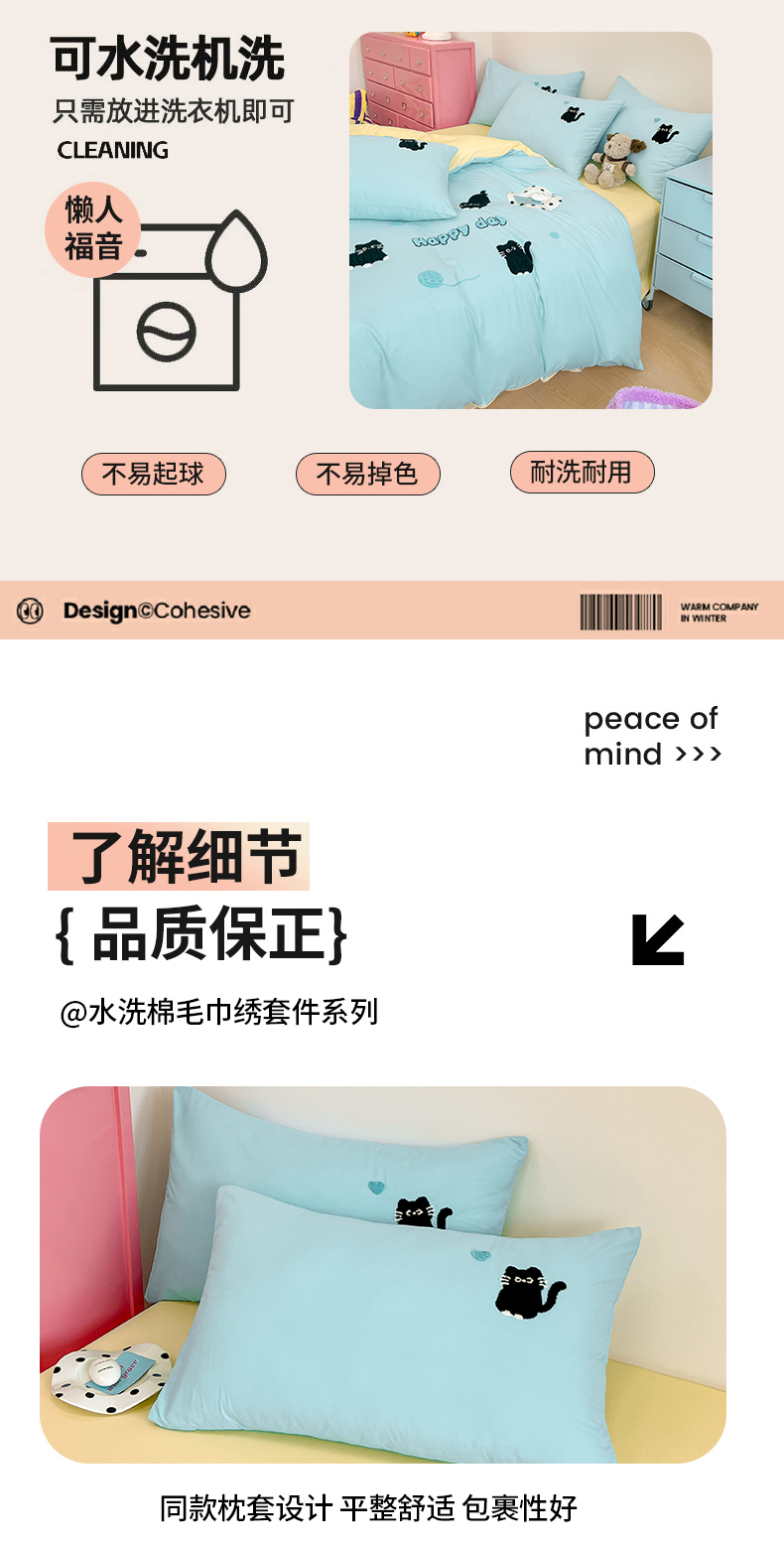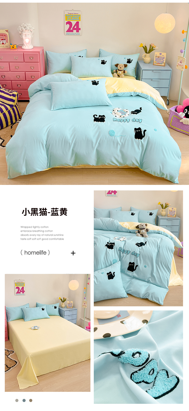 当前位置: 91家纺网 > 商品网购 > 床品套件 > 四件套 > 水洗棉四件套 > 我心家纺 2024新款水洗棉毛巾绣四件套-小黑猫 小黑猫-蓝黄