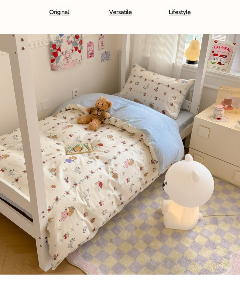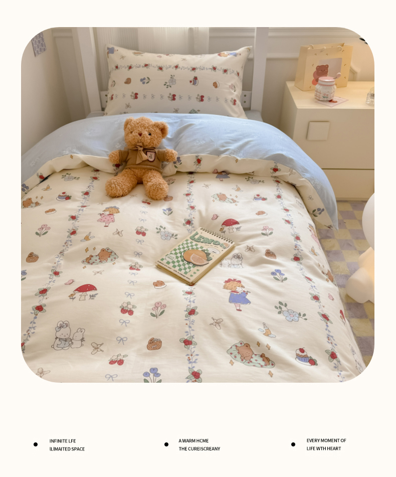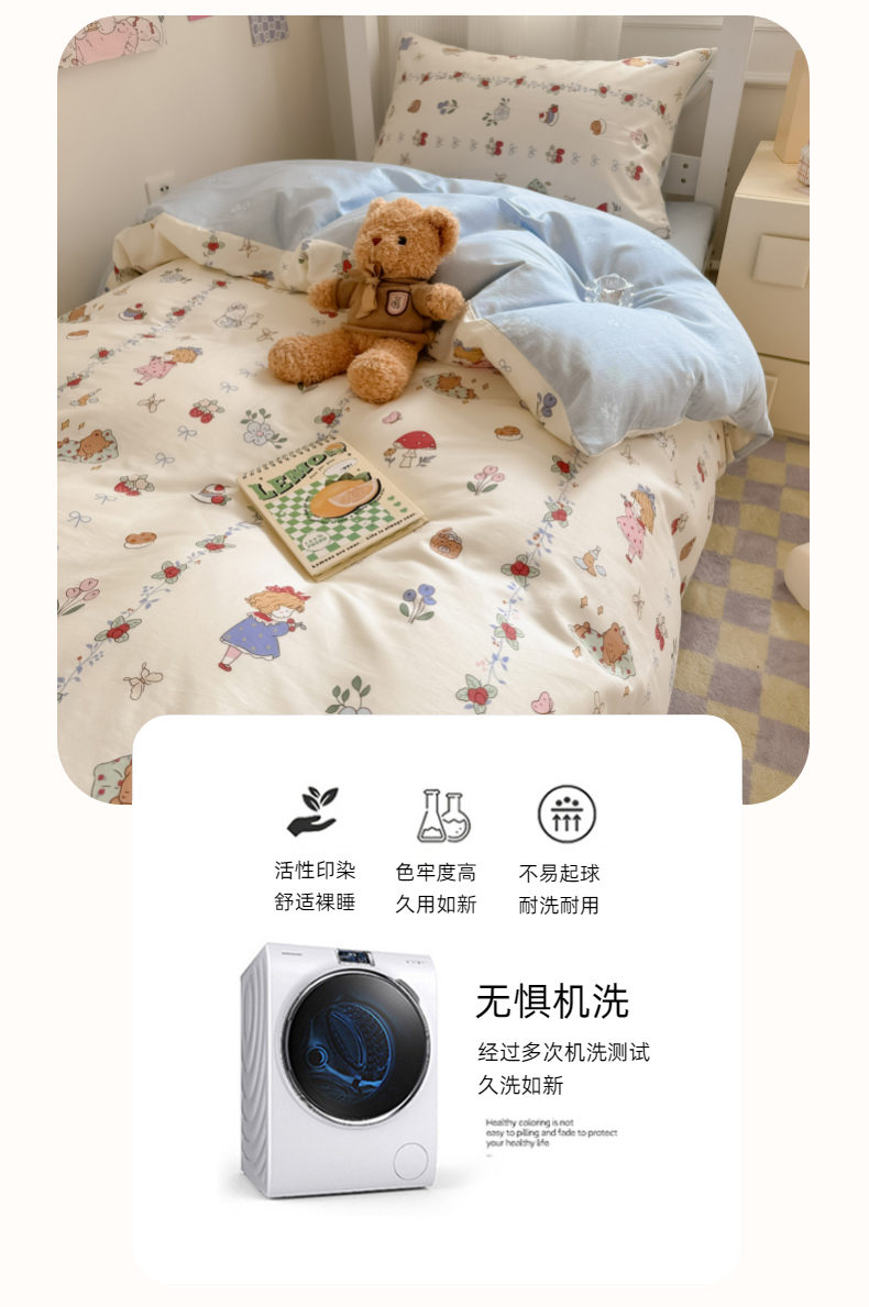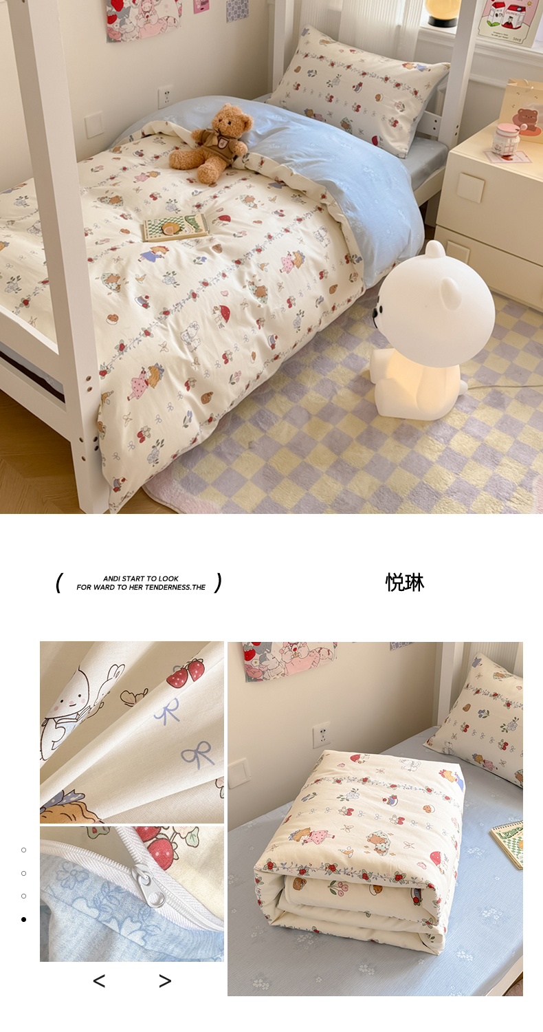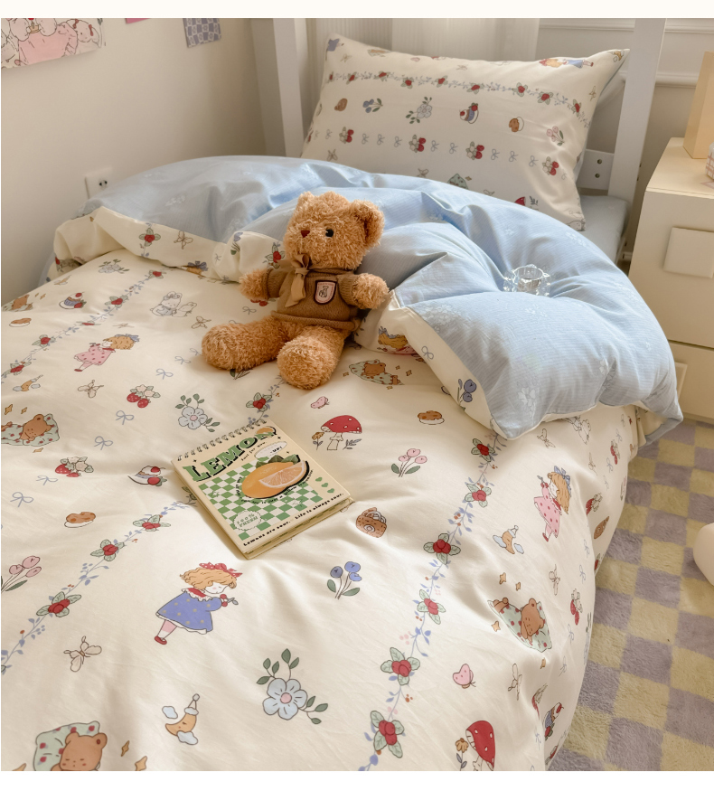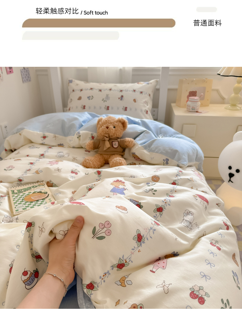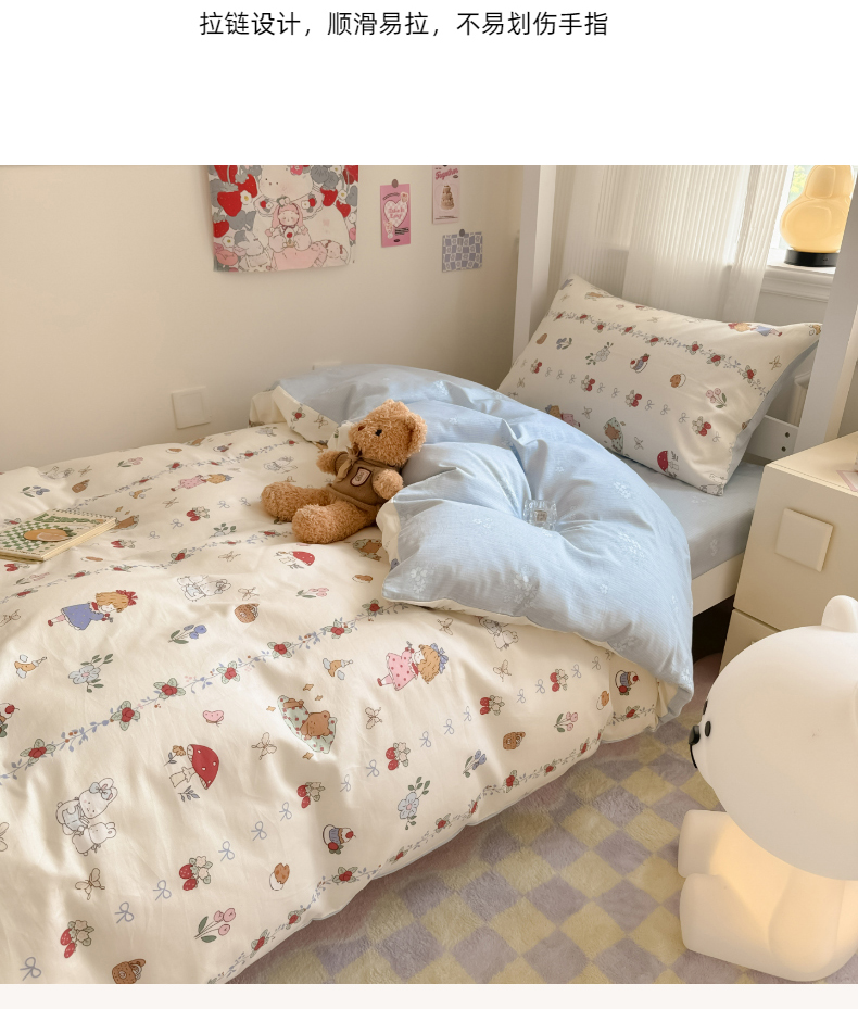 简宜2023新款13070纯棉全棉40支斜纹卡通小清新学生三件套四件套,花园兔,紫葡仙子,倩影粉,hello 萌熊,嘟嘟小车,简笔画,开心小黄鸭,梦幻城堡,浓情爱意