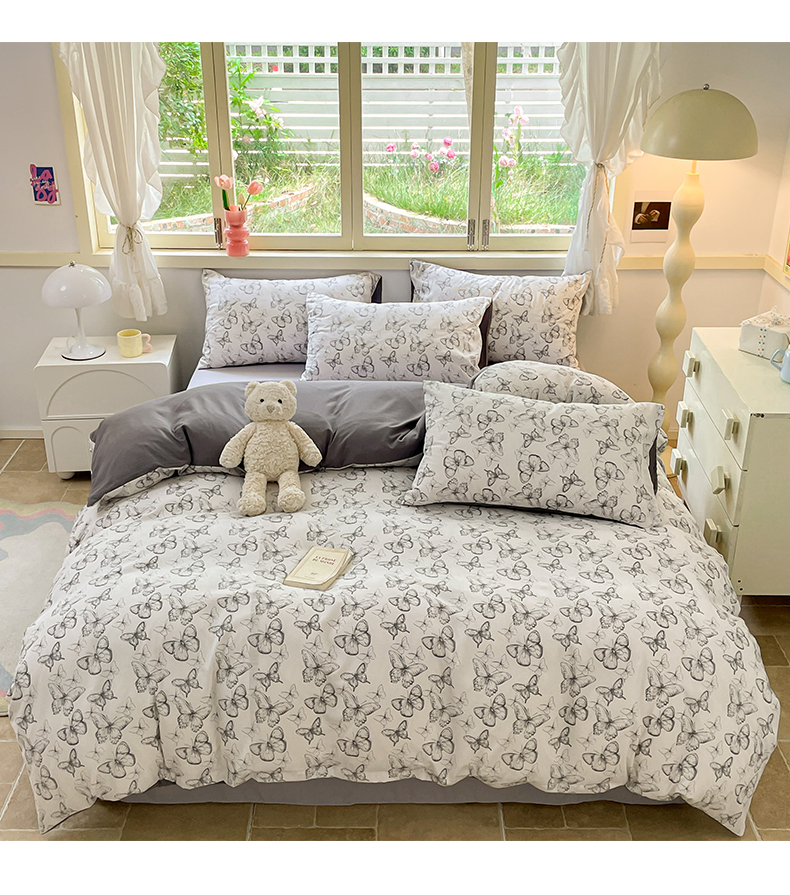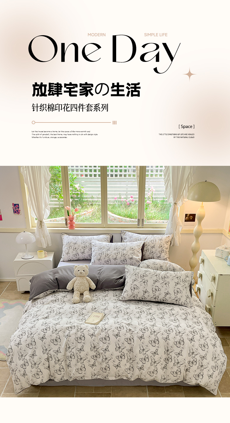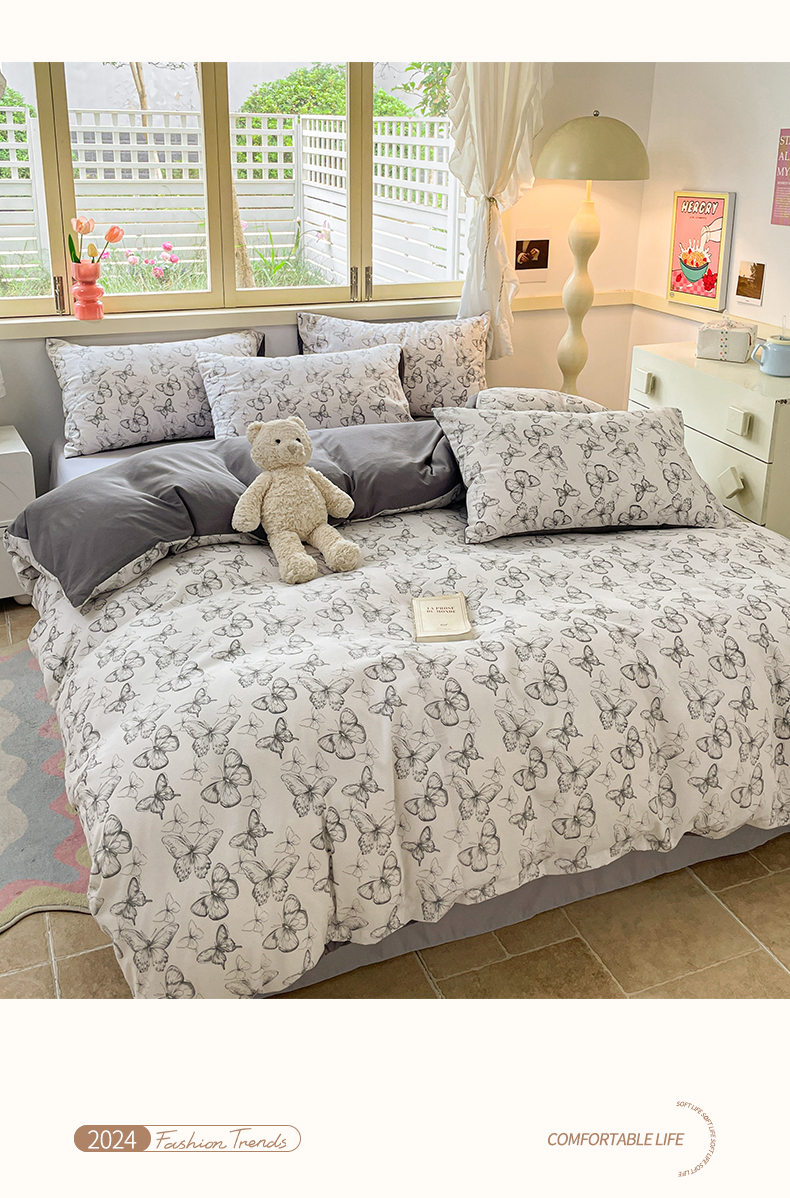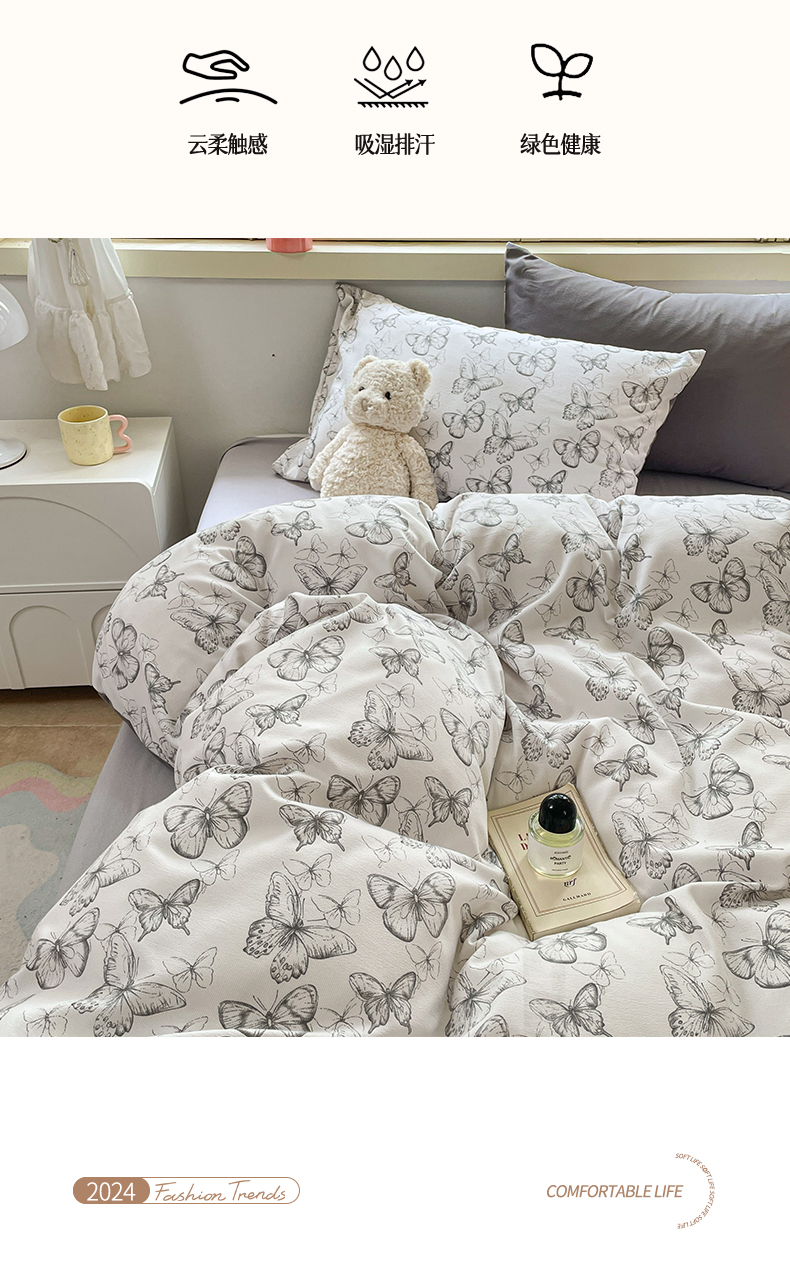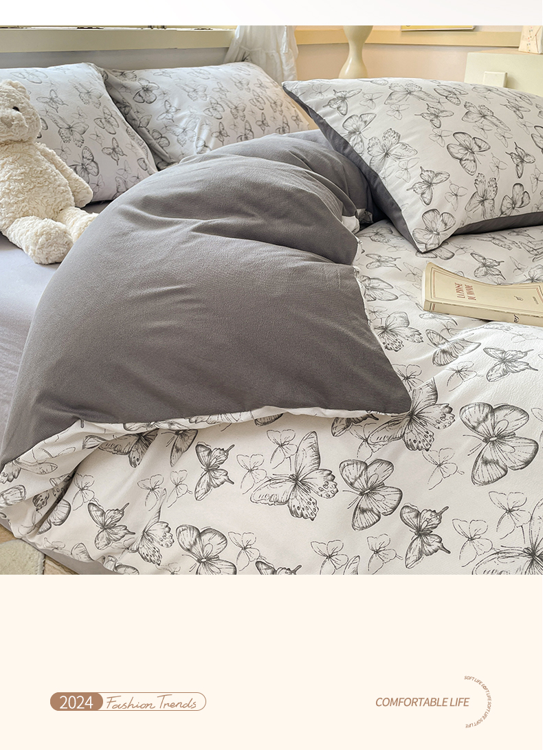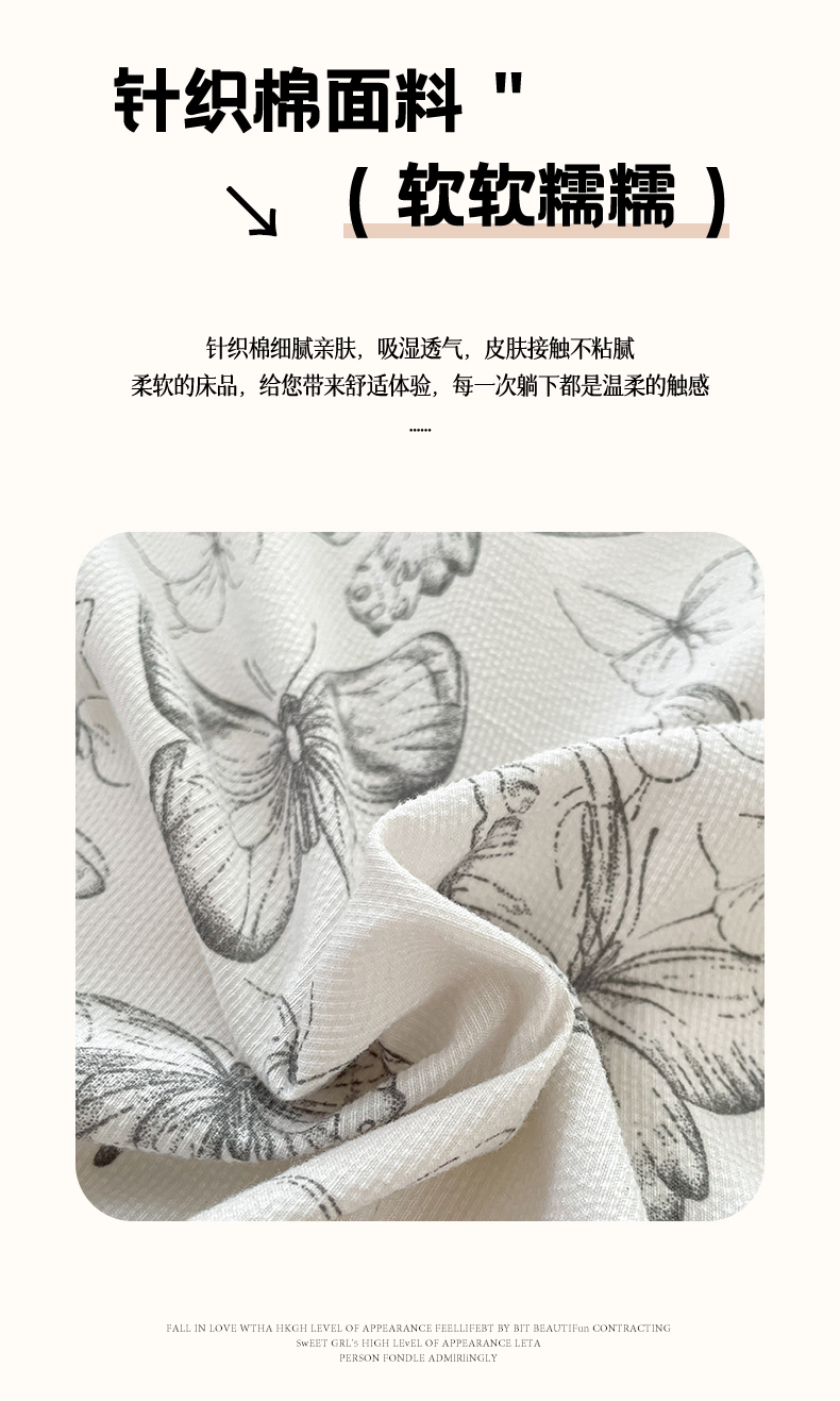 当前位置: 91家纺网 > 商品网购 > 床品套件 > 四件套 > 全棉普通四件套 > 玉海棠 2024新款AB版软糯针织棉印花四件套 梦蝶-