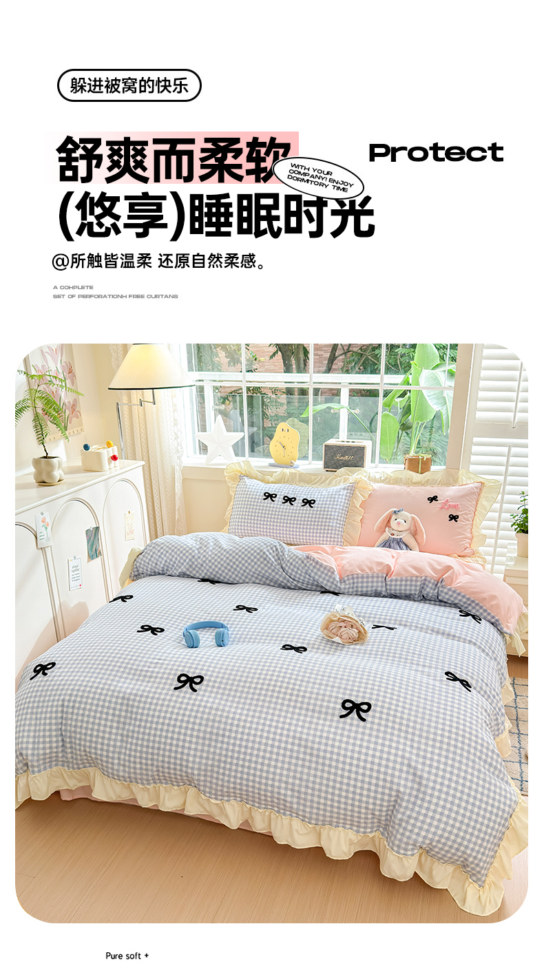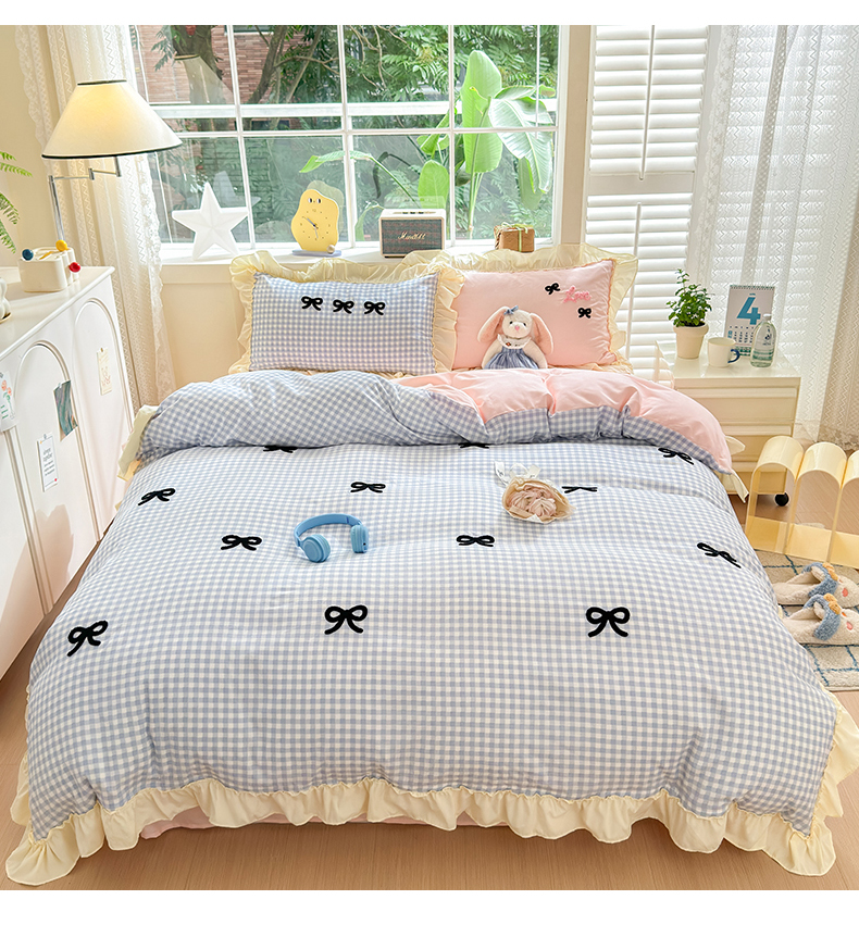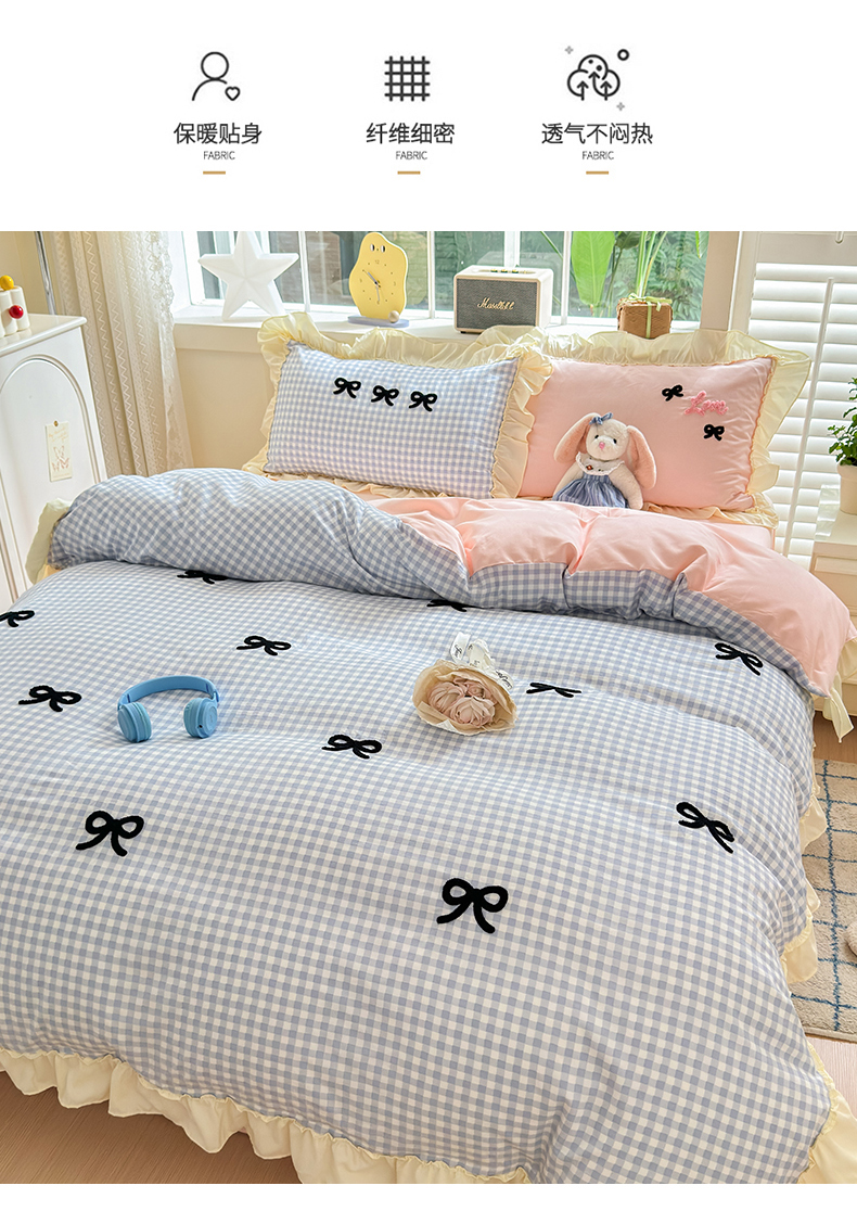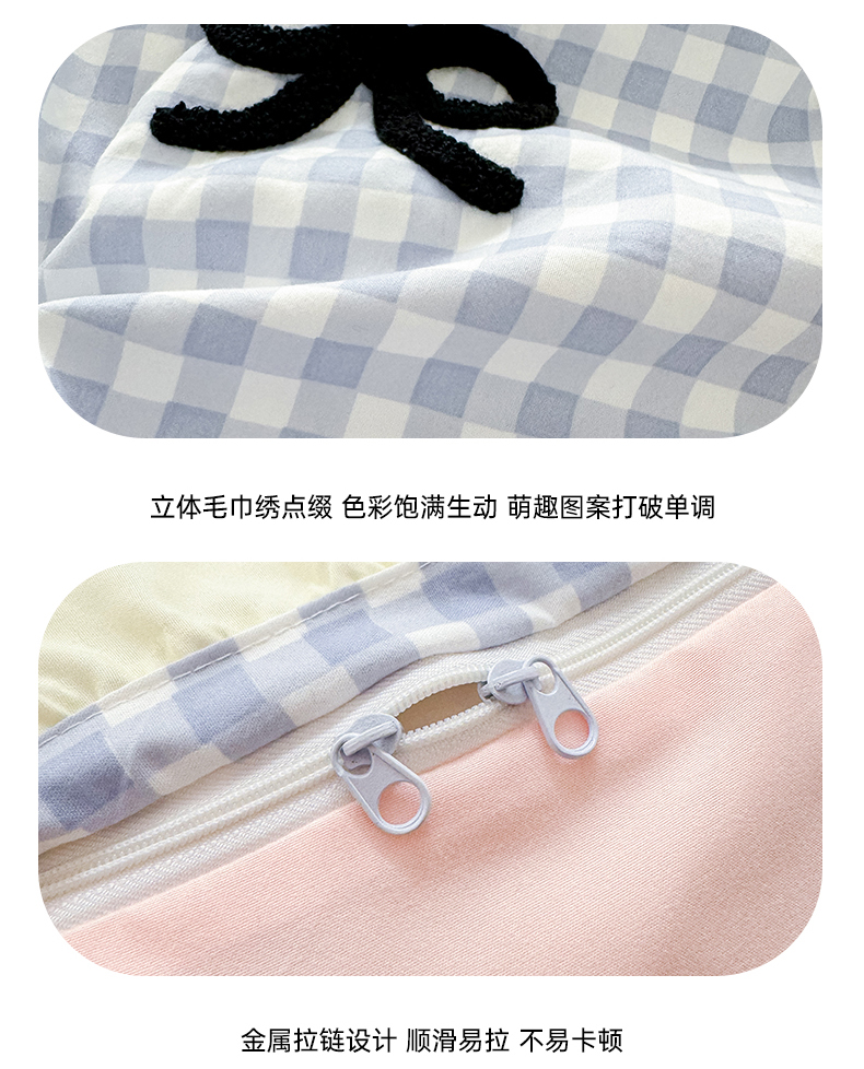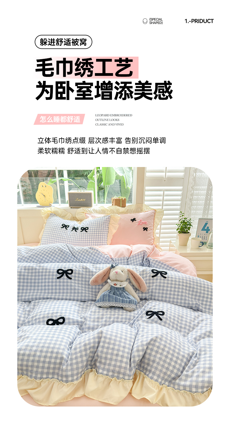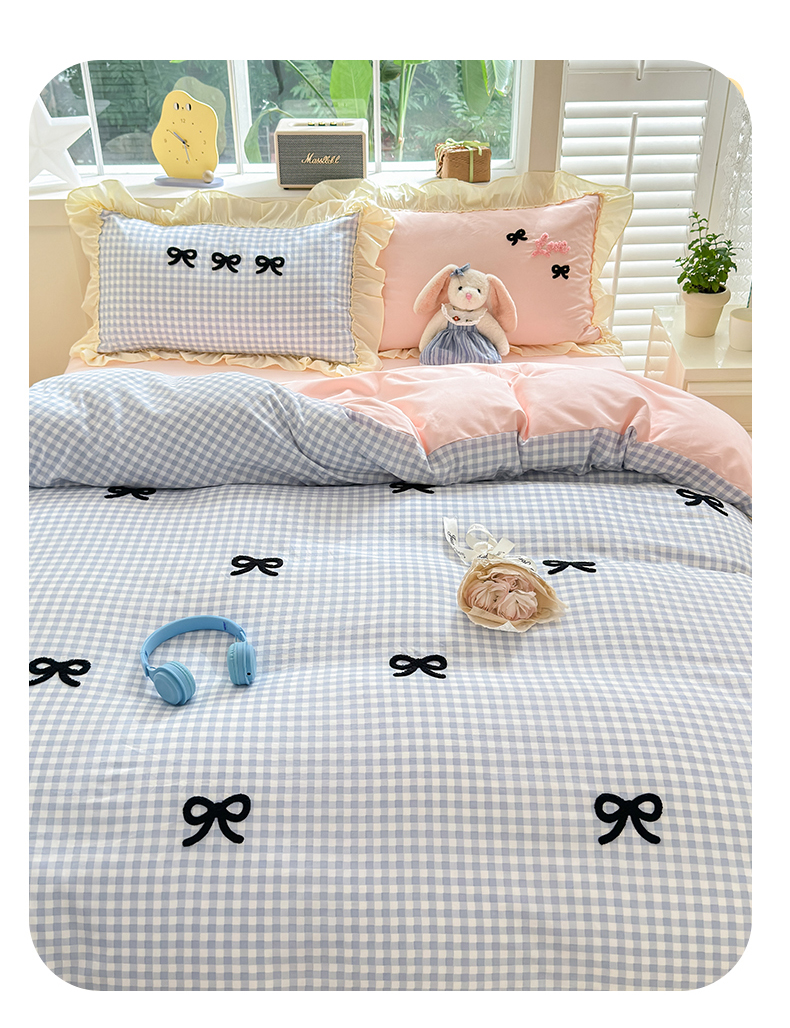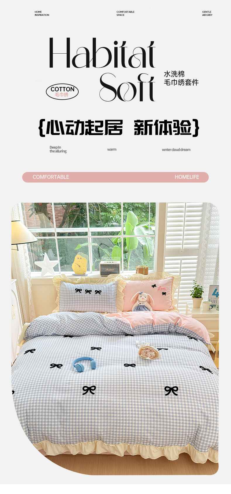 当前位置: 91家纺网 > 商品网购 > 床品套件 > 四件套 > 水洗棉四件套 > 我心 2024新款水洗棉毛巾绣四件套-蝴蝶结 黑蝴蝶结-蓝格粉