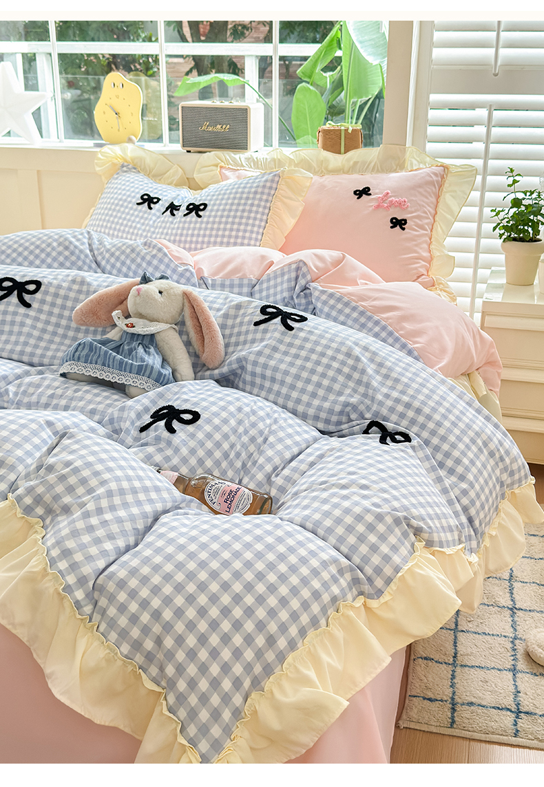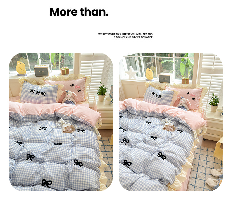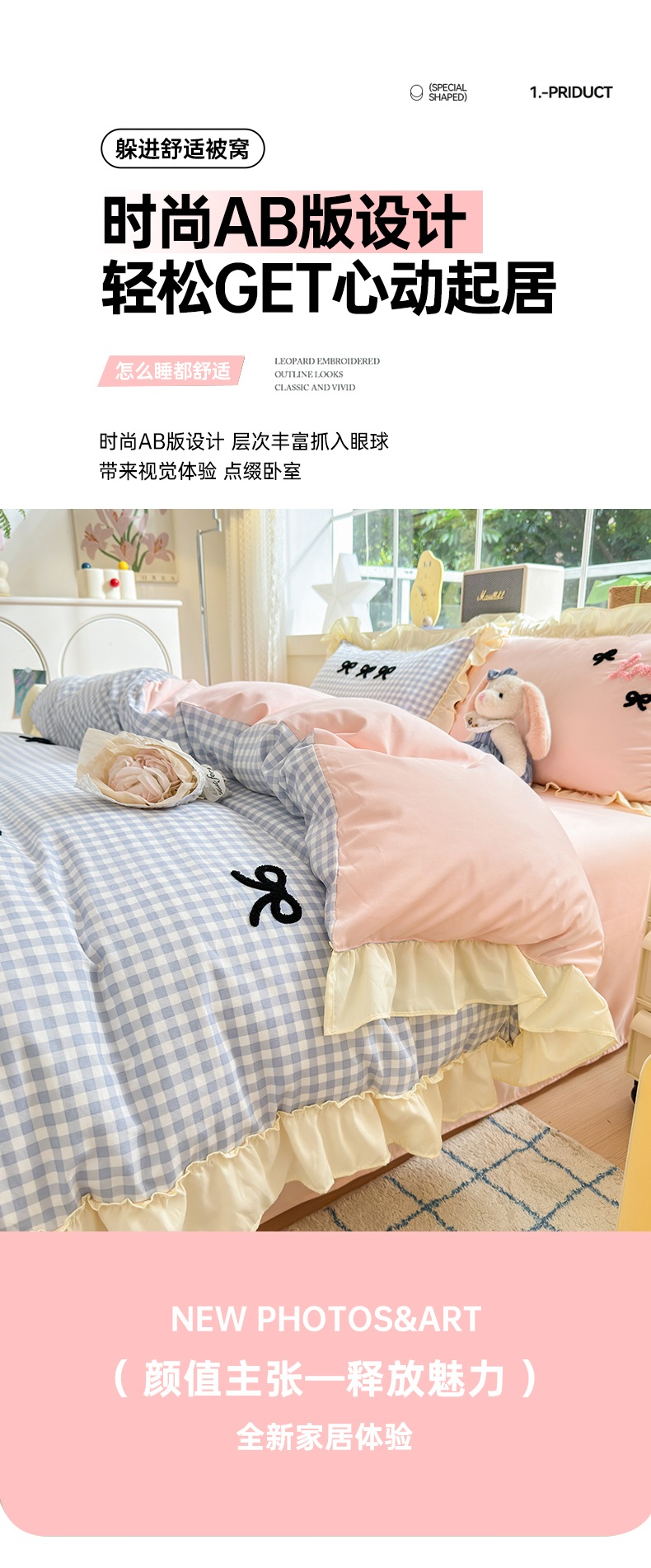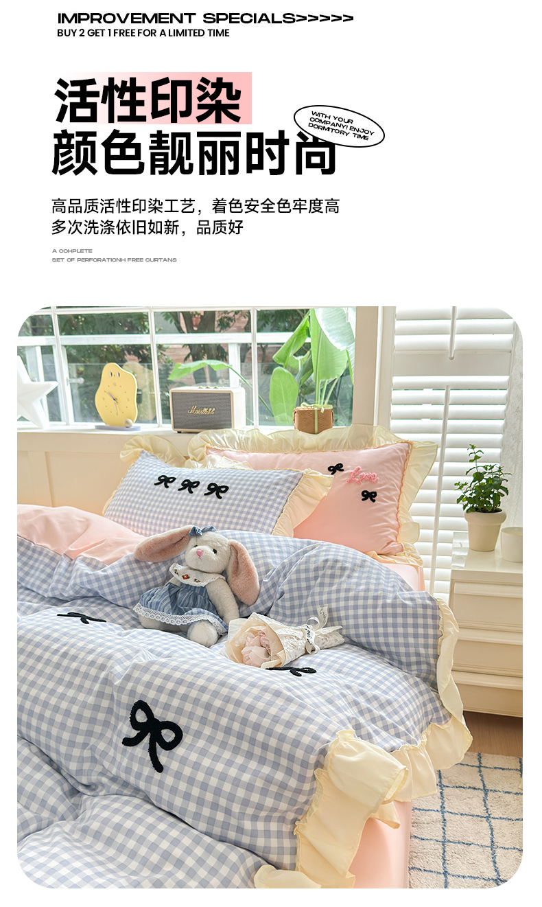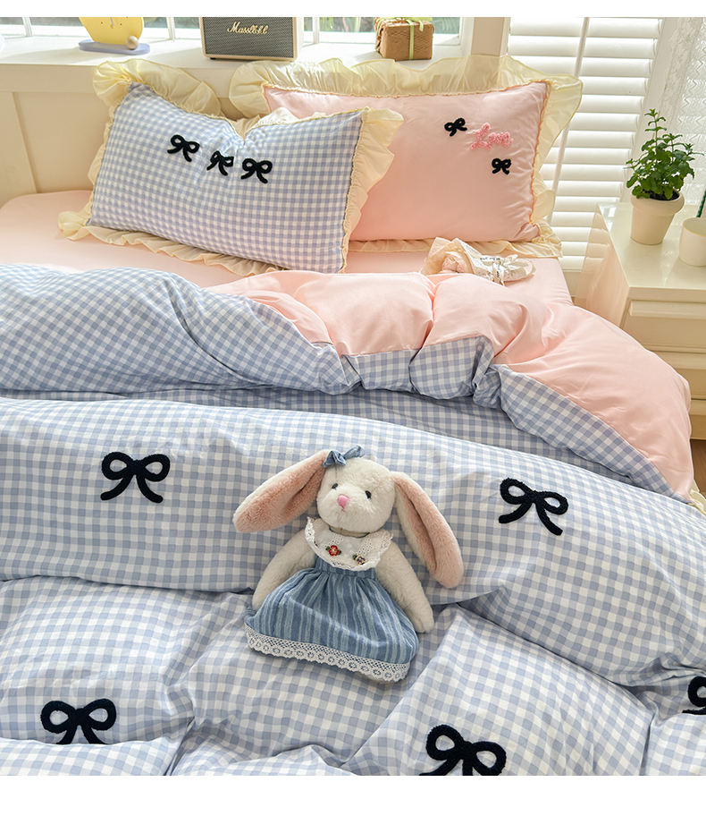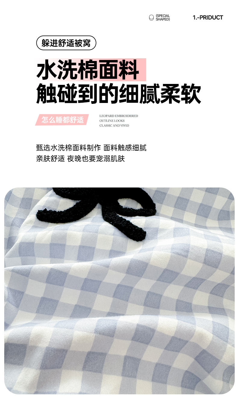 当前位置: 91家纺网 > 商品网购 > 床品套件 > 四件套 > 水洗棉四件套 > 我心 2024新款水洗棉毛巾绣四件套-蝴蝶结 黑蝴蝶结-蓝格粉