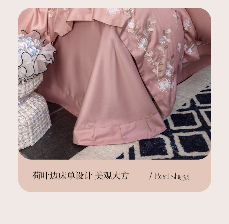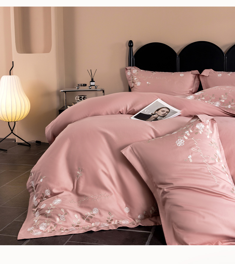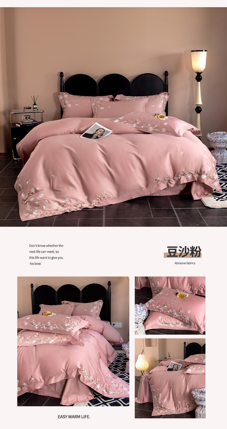 心悦家纺 2024新款高支高密120支长绒棉刺绣四件套 豆沙粉