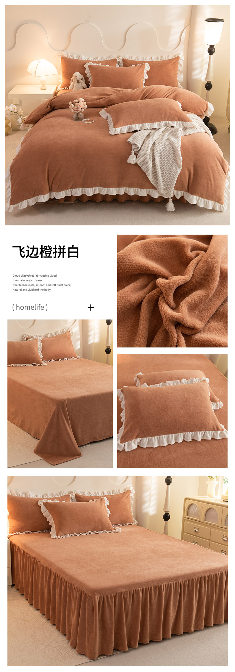 当前位置: 91家纺网 > 商品网购 > 床品套件 > 四件套 > 牛奶绒四件套 > 恩和家纺 2024新款高克重200g牛奶绒飞边款四件套 飞边橙拼白