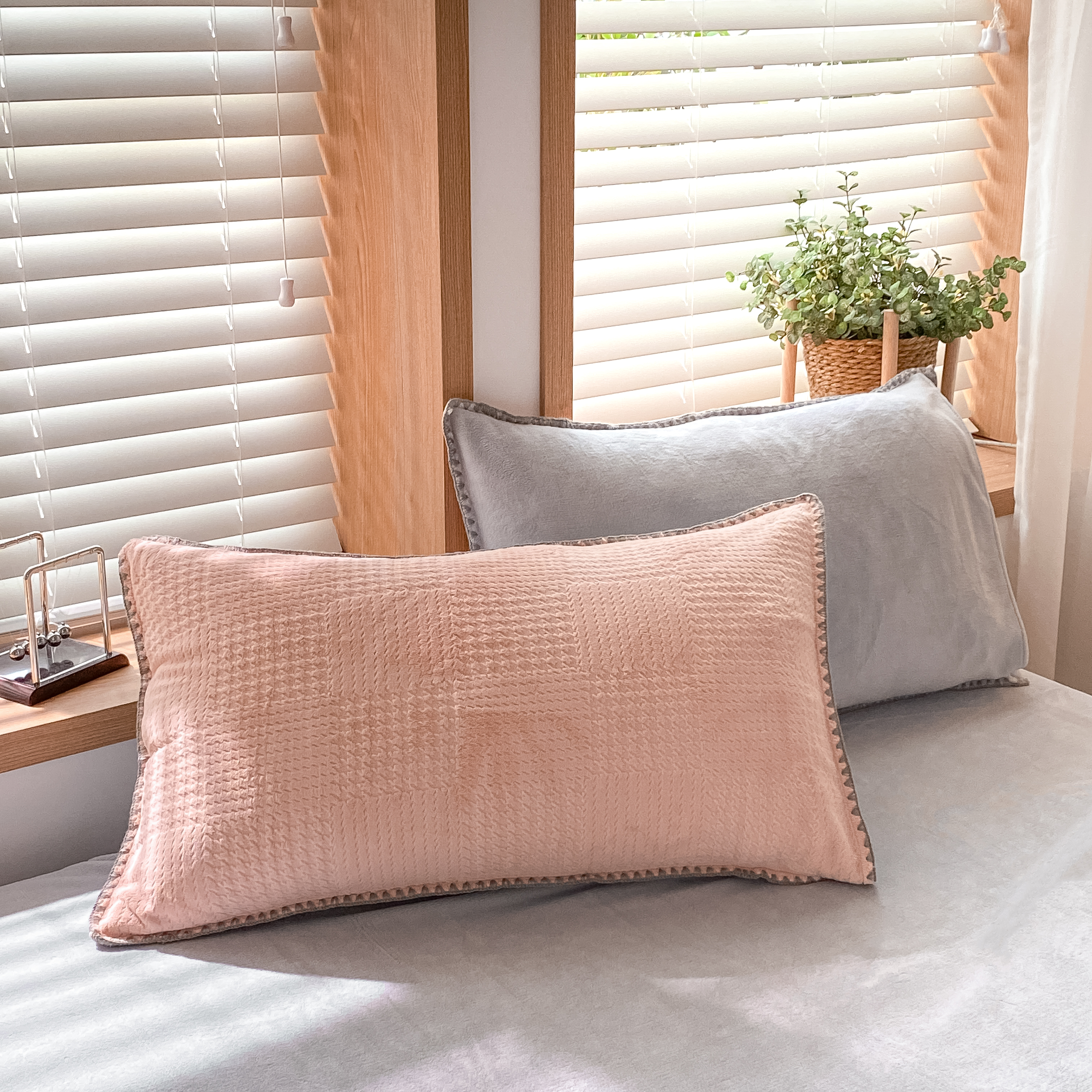 商品名称:桃子家居 2024新款A类无印ins华夫格提花烂花雕花剪花三角贝壳边工艺加厚牛奶绒枕套 绒华夫格-豆粉