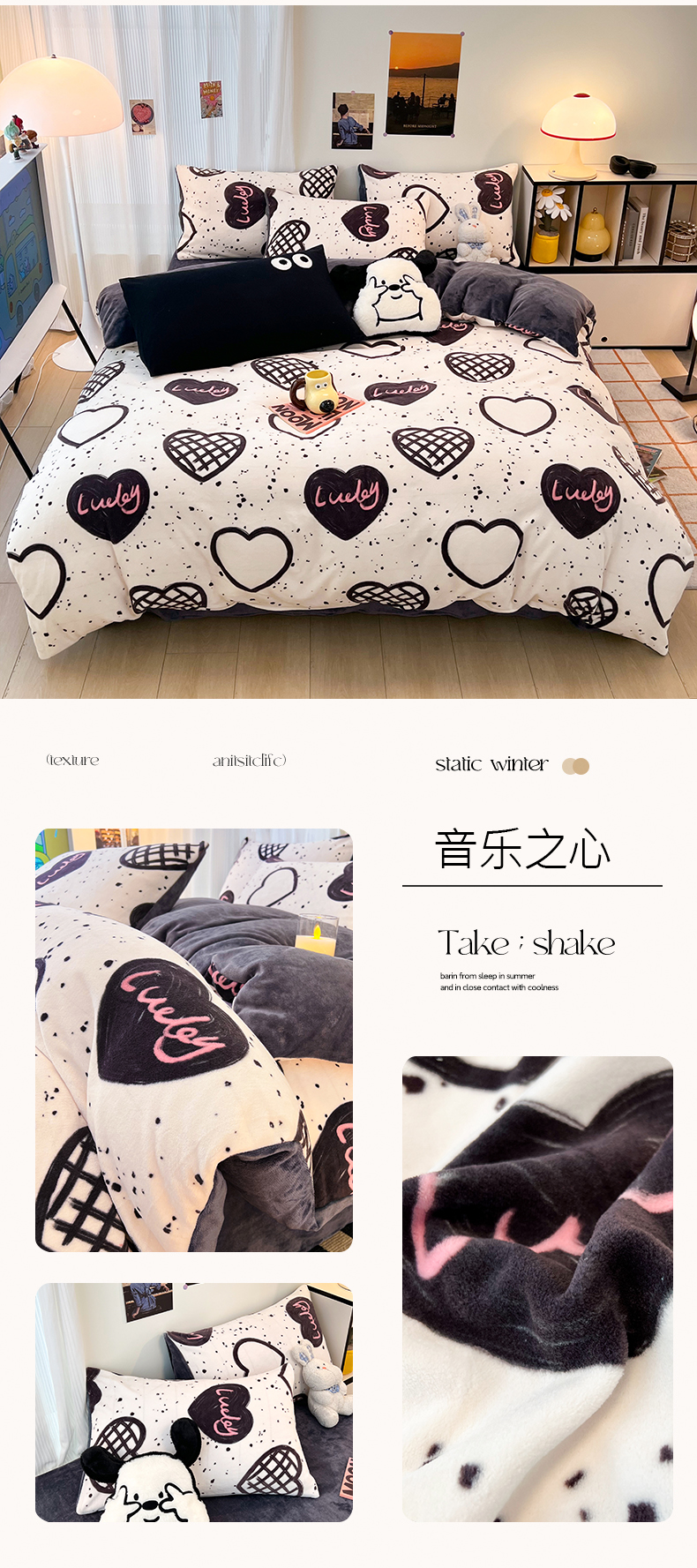 2024新款原创小清新牛奶绒印花四件套 音乐之心