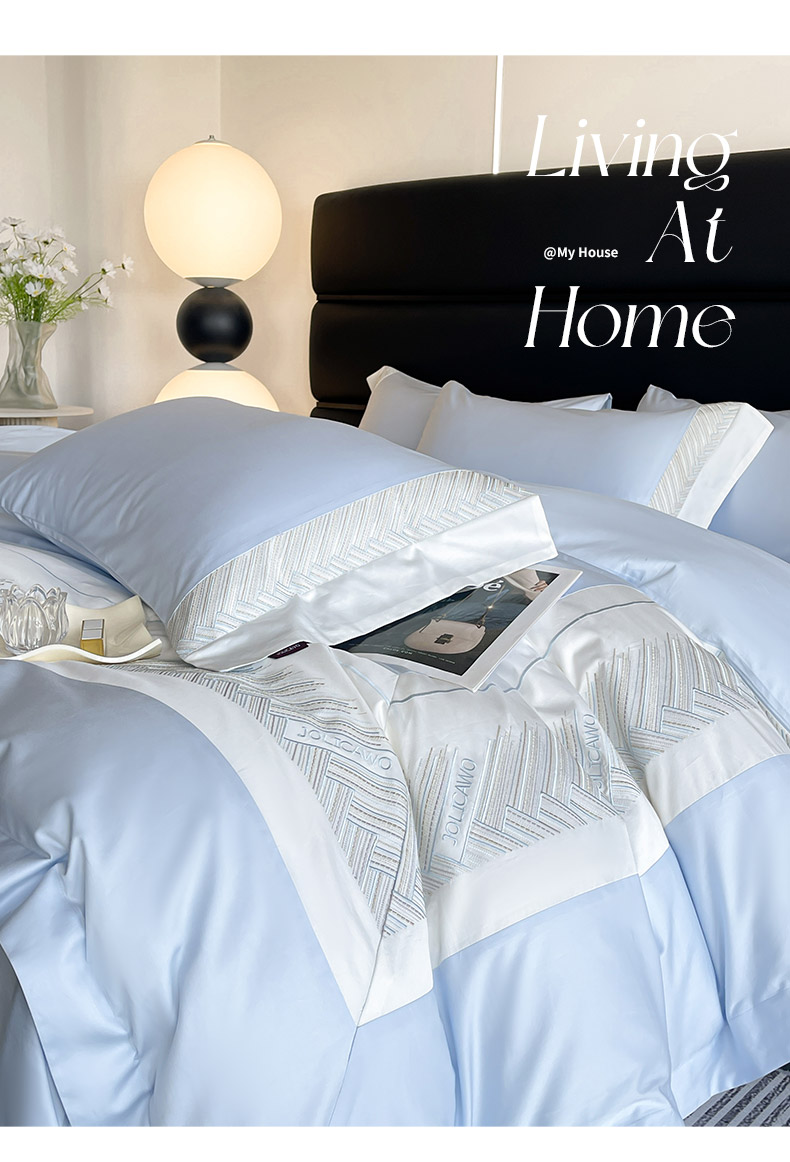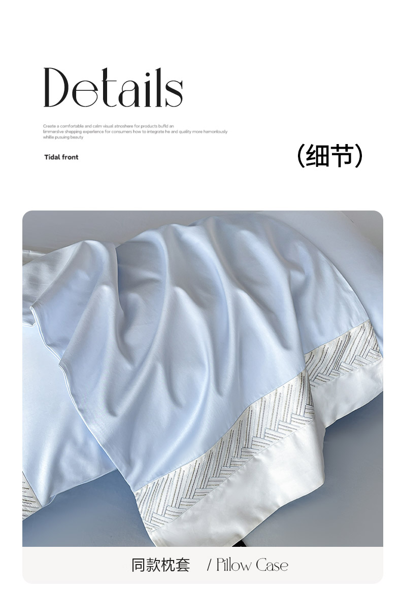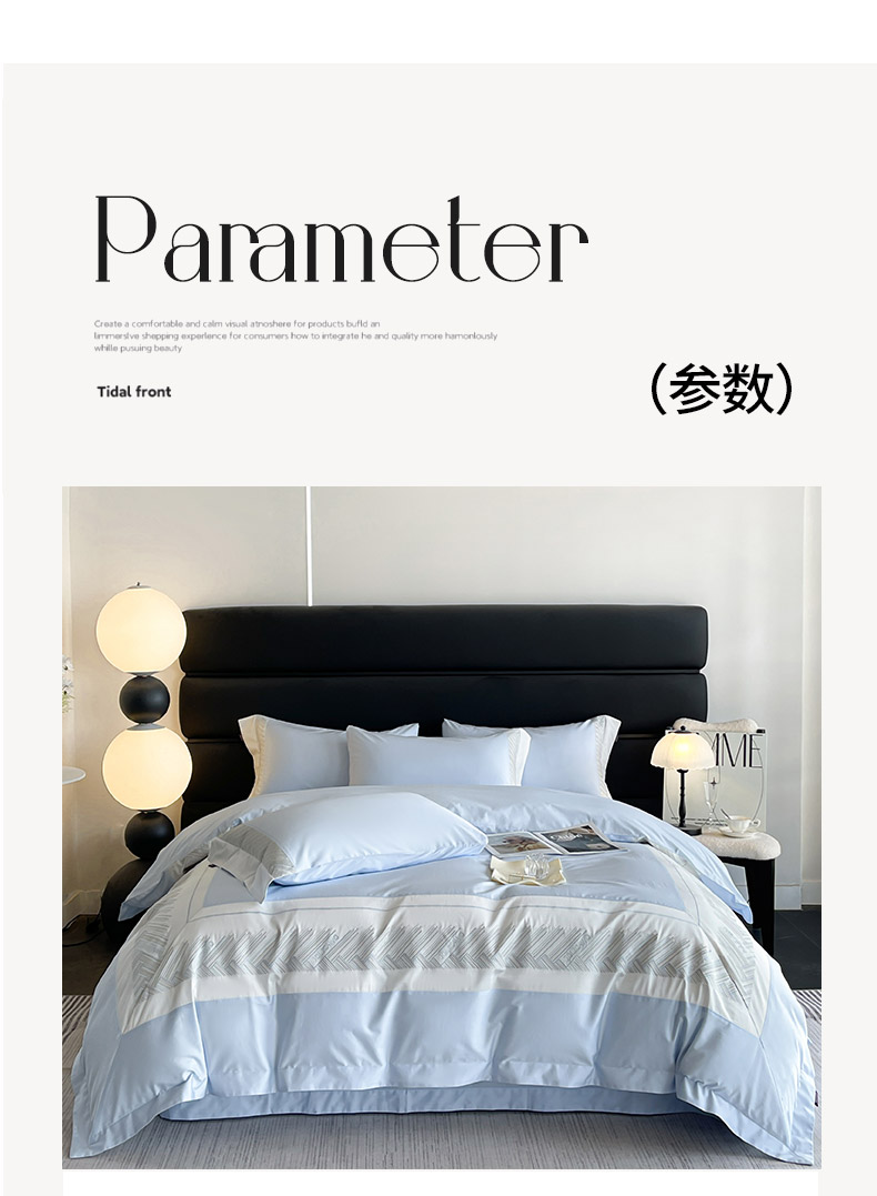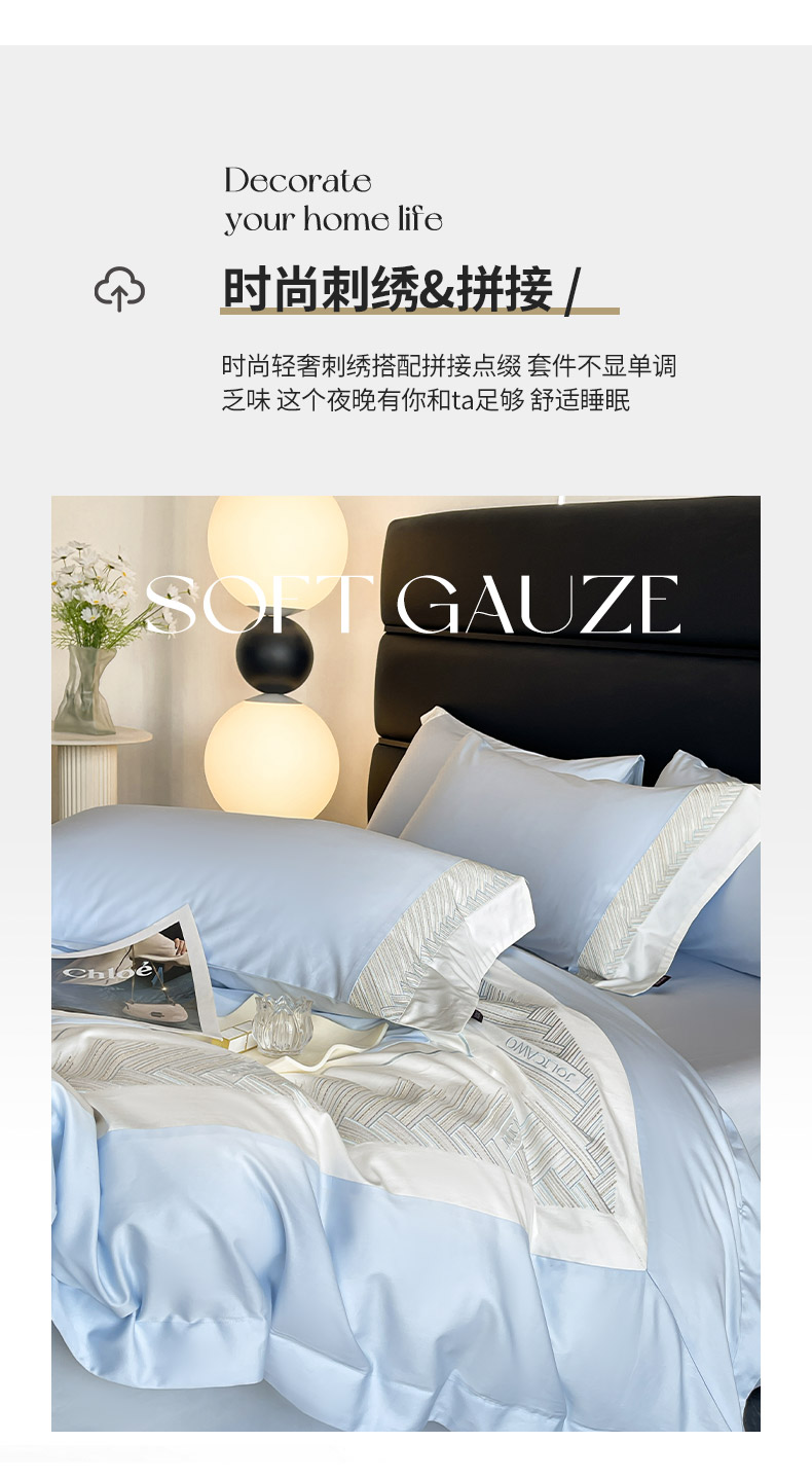 商品名称: 【A类母婴级】100支长绒棉四件套全棉纯棉重工高端刺绣拼接被套简约床单床笠款床上用品 澜梦-沁水蓝