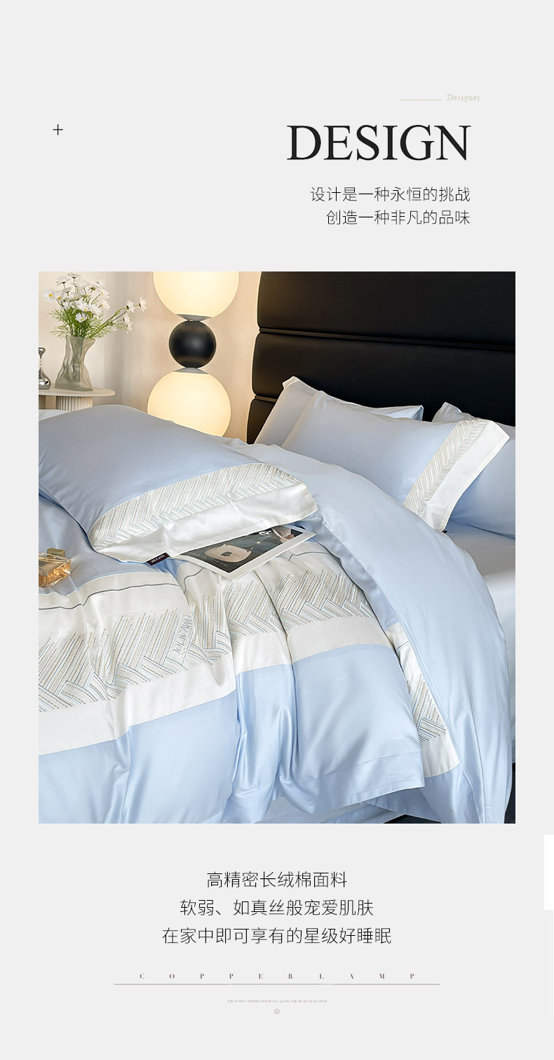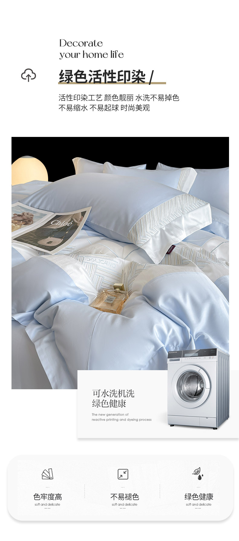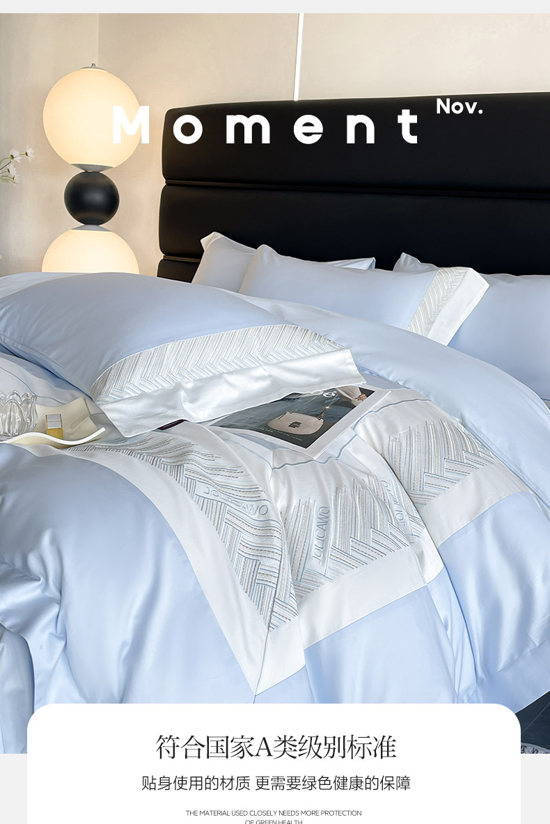 商品名称: 【A类母婴级】100支长绒棉四件套全棉纯棉重工高端刺绣拼接被套简约床单床笠款床上用品 澜梦-沁水蓝