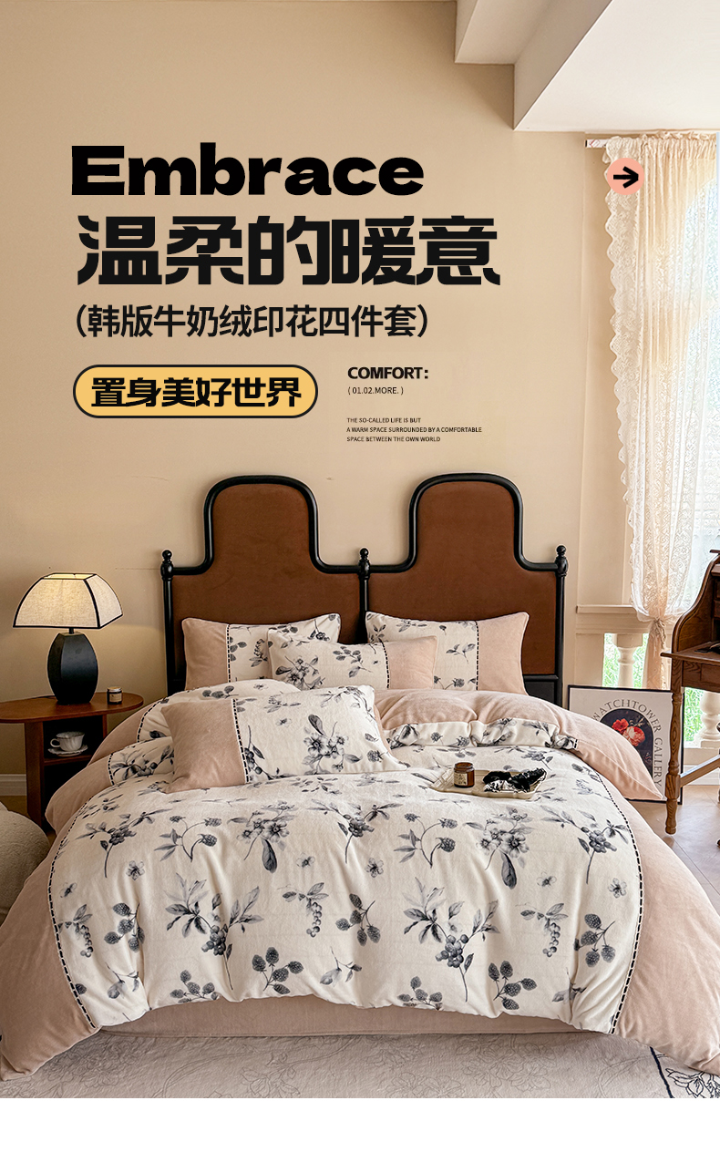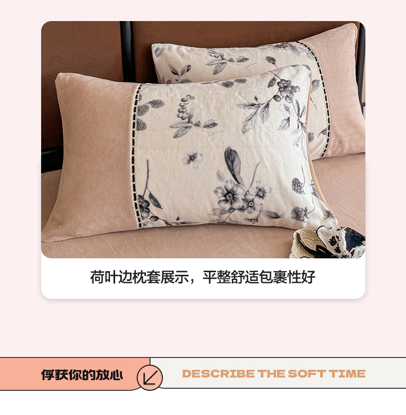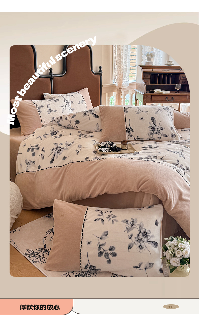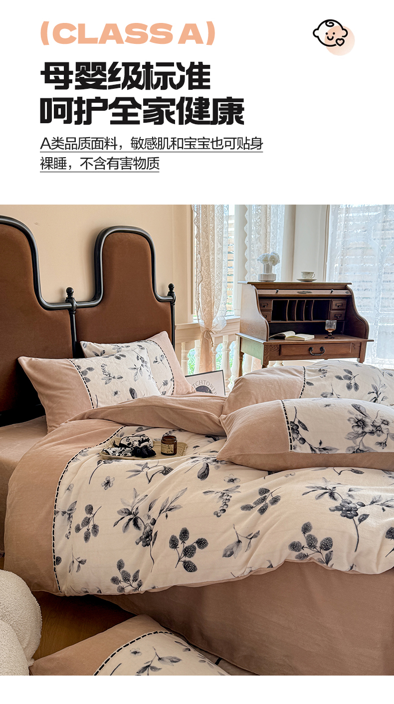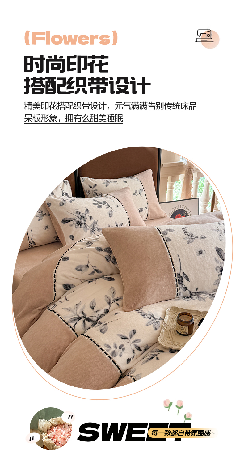 2024新款牛奶绒韩版数码印花四件套-朝花夕拾系列 朝花夕拾-咖