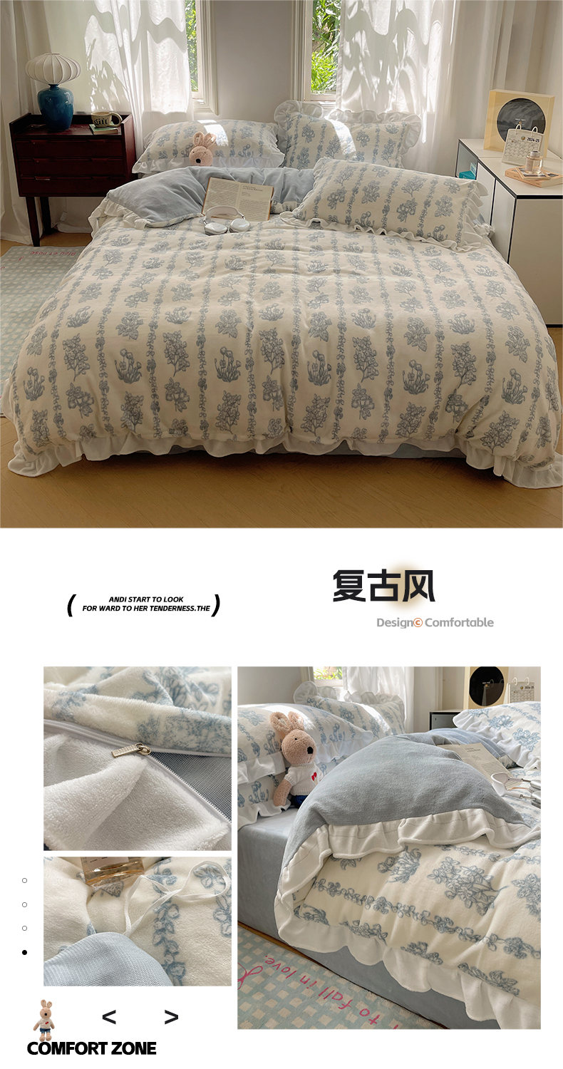 商品名称:美乐迪家纺 2024新款花边牛奶绒印花四件套 复古风