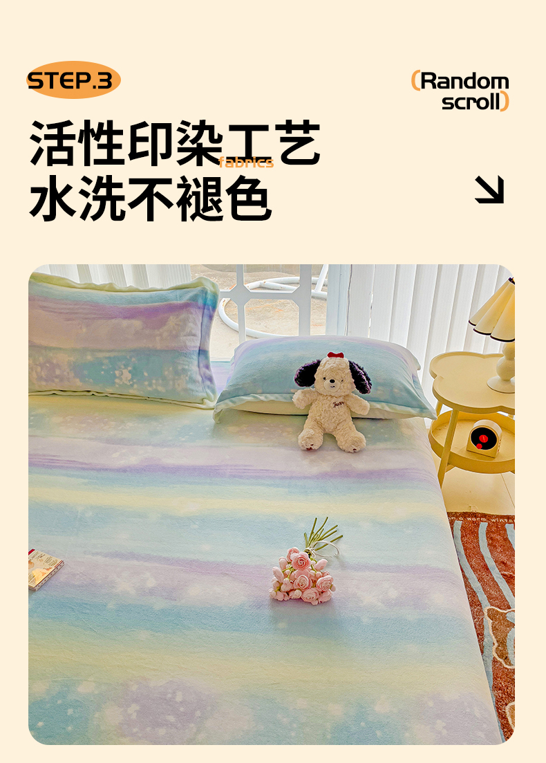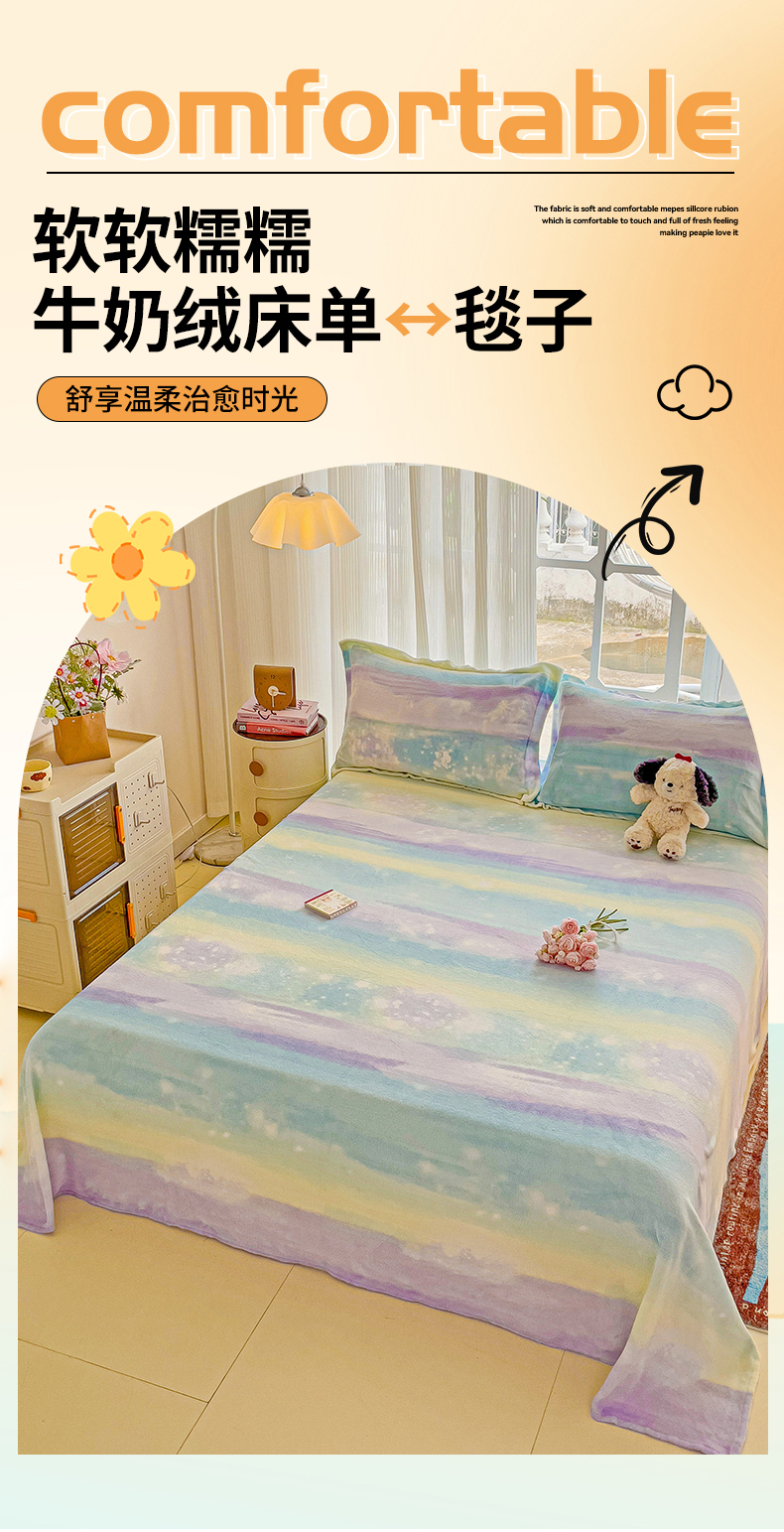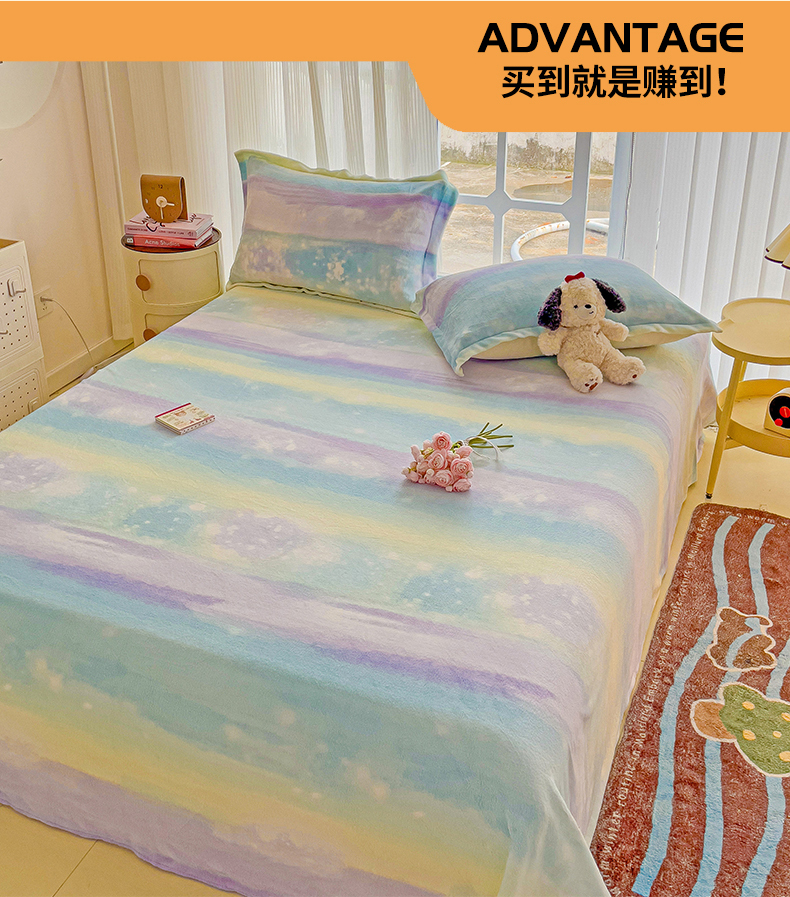 • 91家纺网 家纺一手货源 找家纺 名兮家居 2024新款时尚卡通风高克重牛奶绒床单-盖毯 彩色的梦
