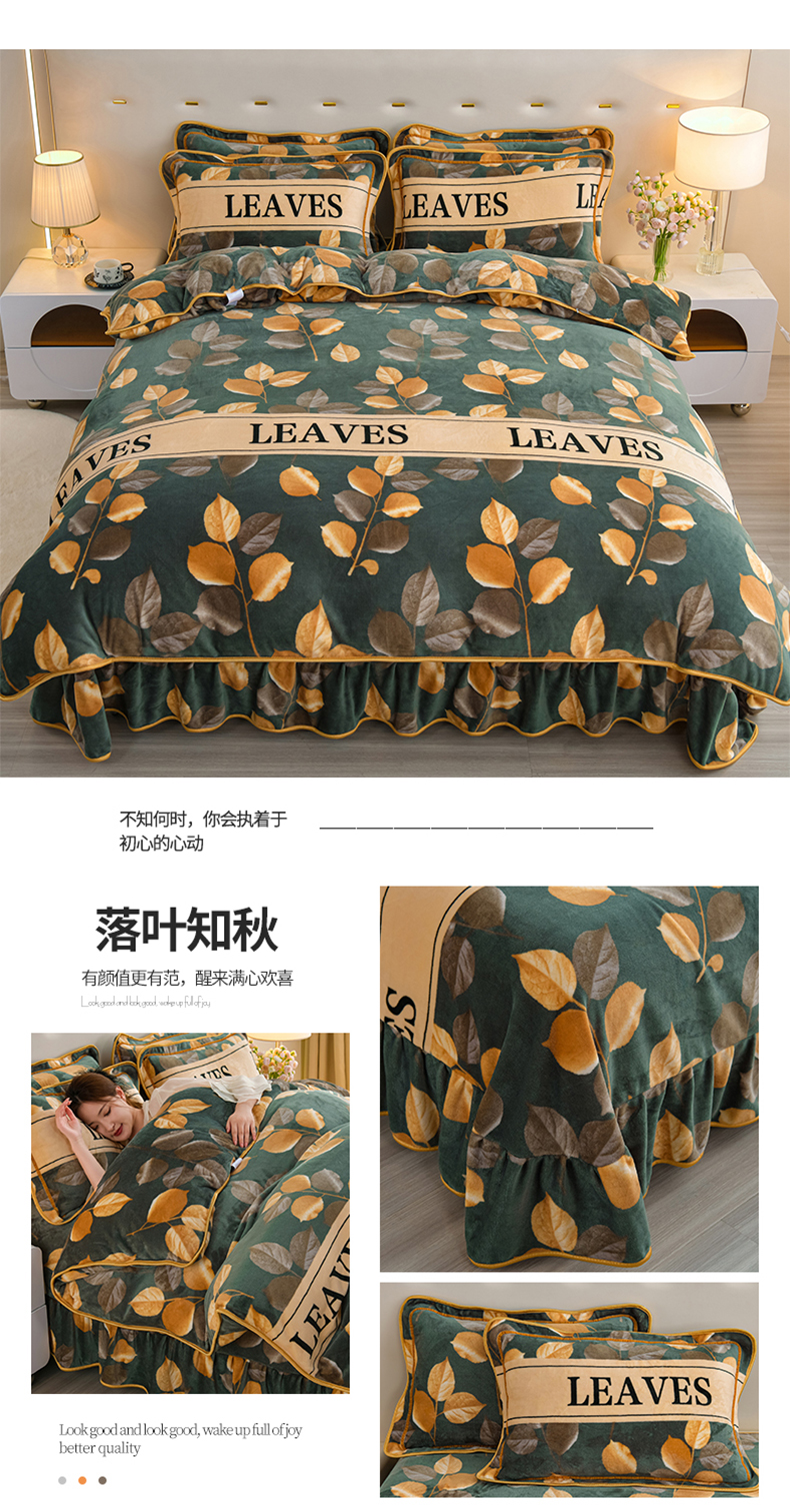 当前位置: 91家纺网 > 商品网购 > 床品套件 > 四件套 > 牛奶绒四件套 > 阿亮家居 2024新款8.5斤保暖牛奶绒金貂绒床裙款四件套 落叶知秋