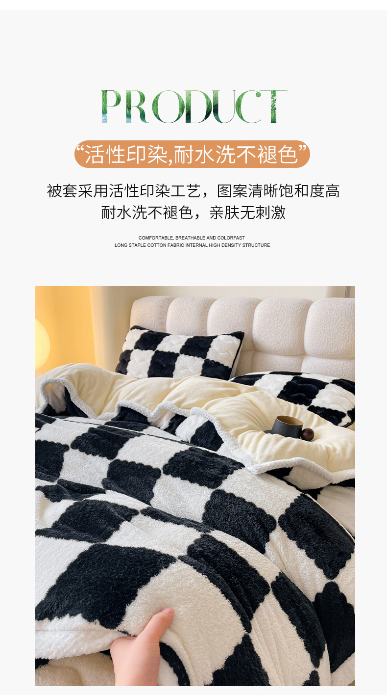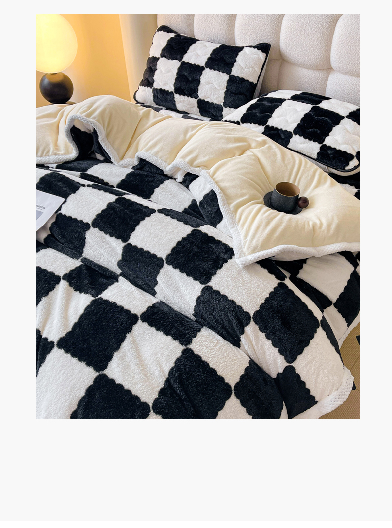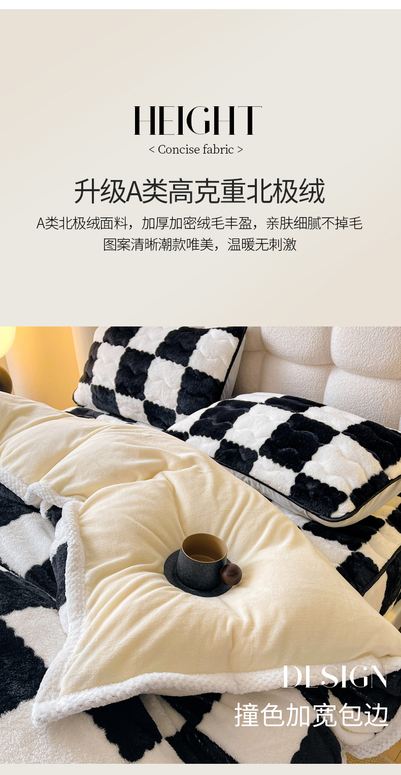 商品名称:2024新款A类北极绒格子-条纹系列宽包边加厚被套(暖光图) 棋盘格-黑白