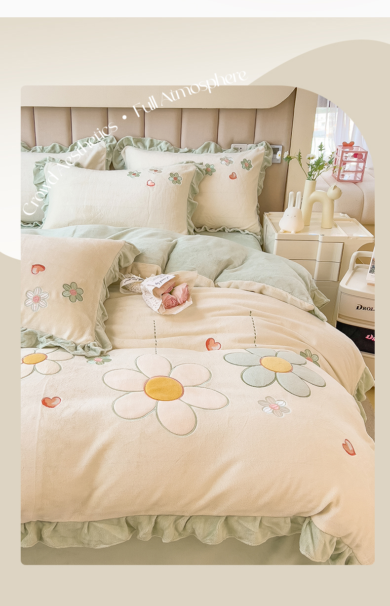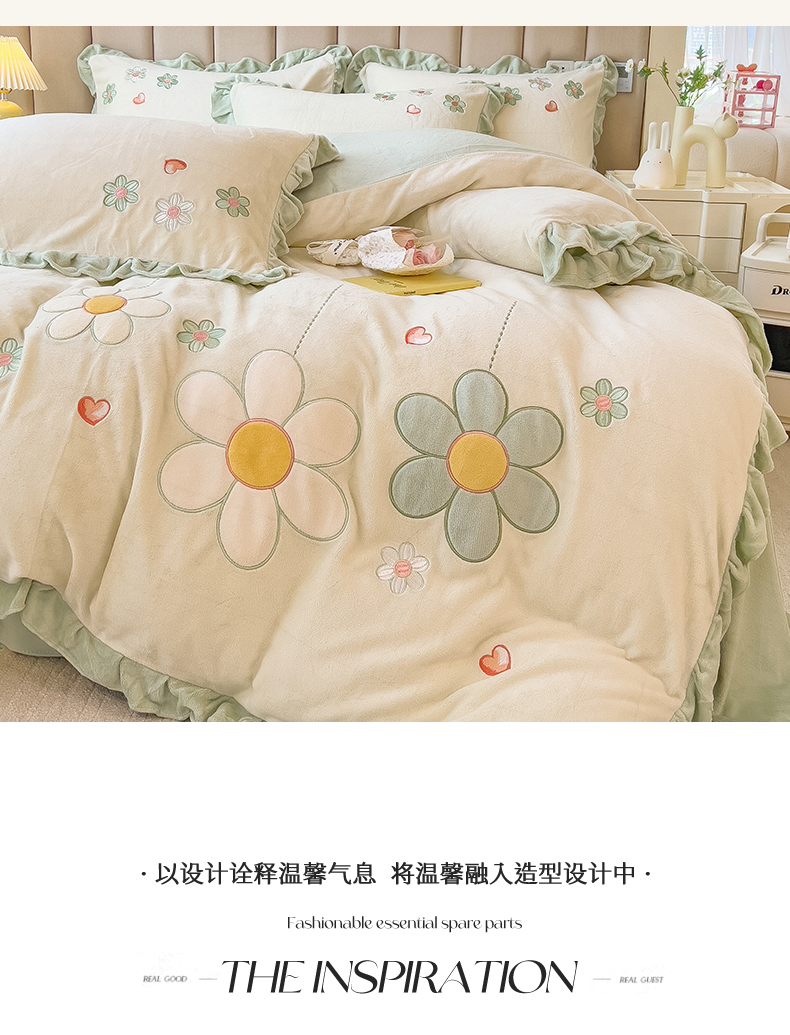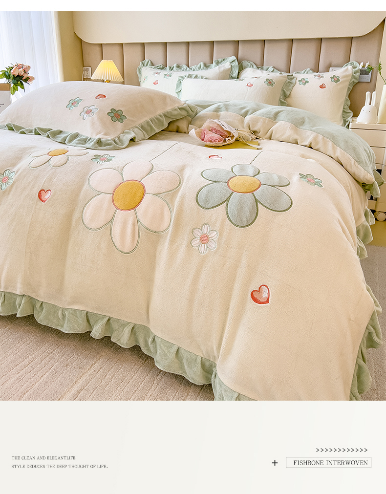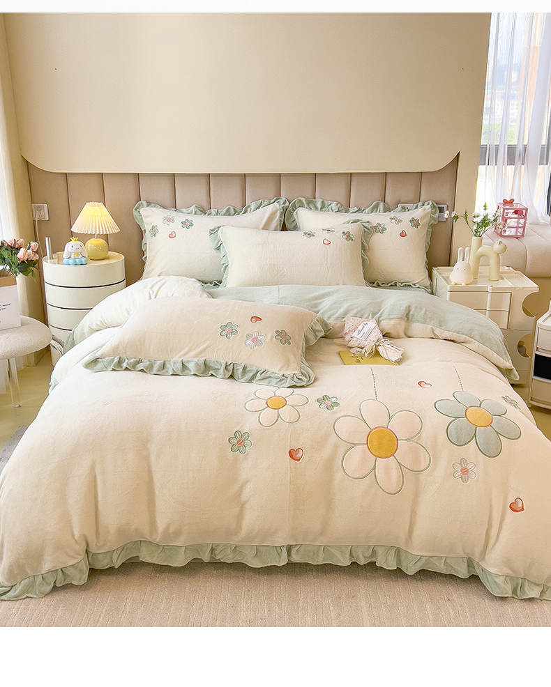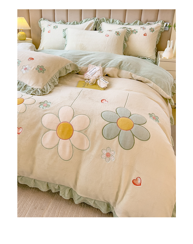 商品名称:兄弟坊 2024新款韩版牛奶绒花朵贴布绣四件套 花朵青柠