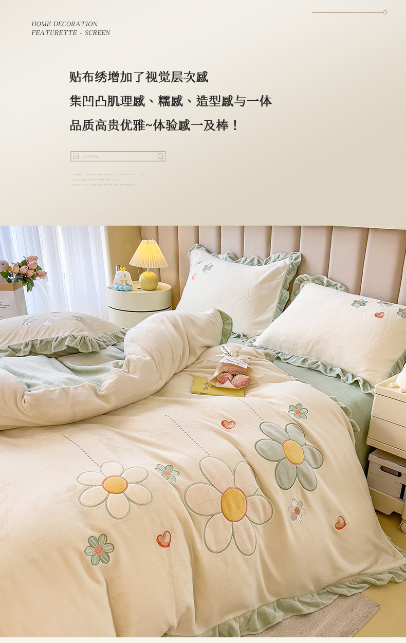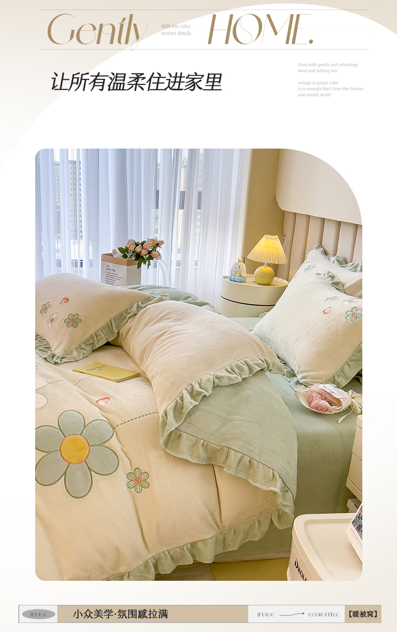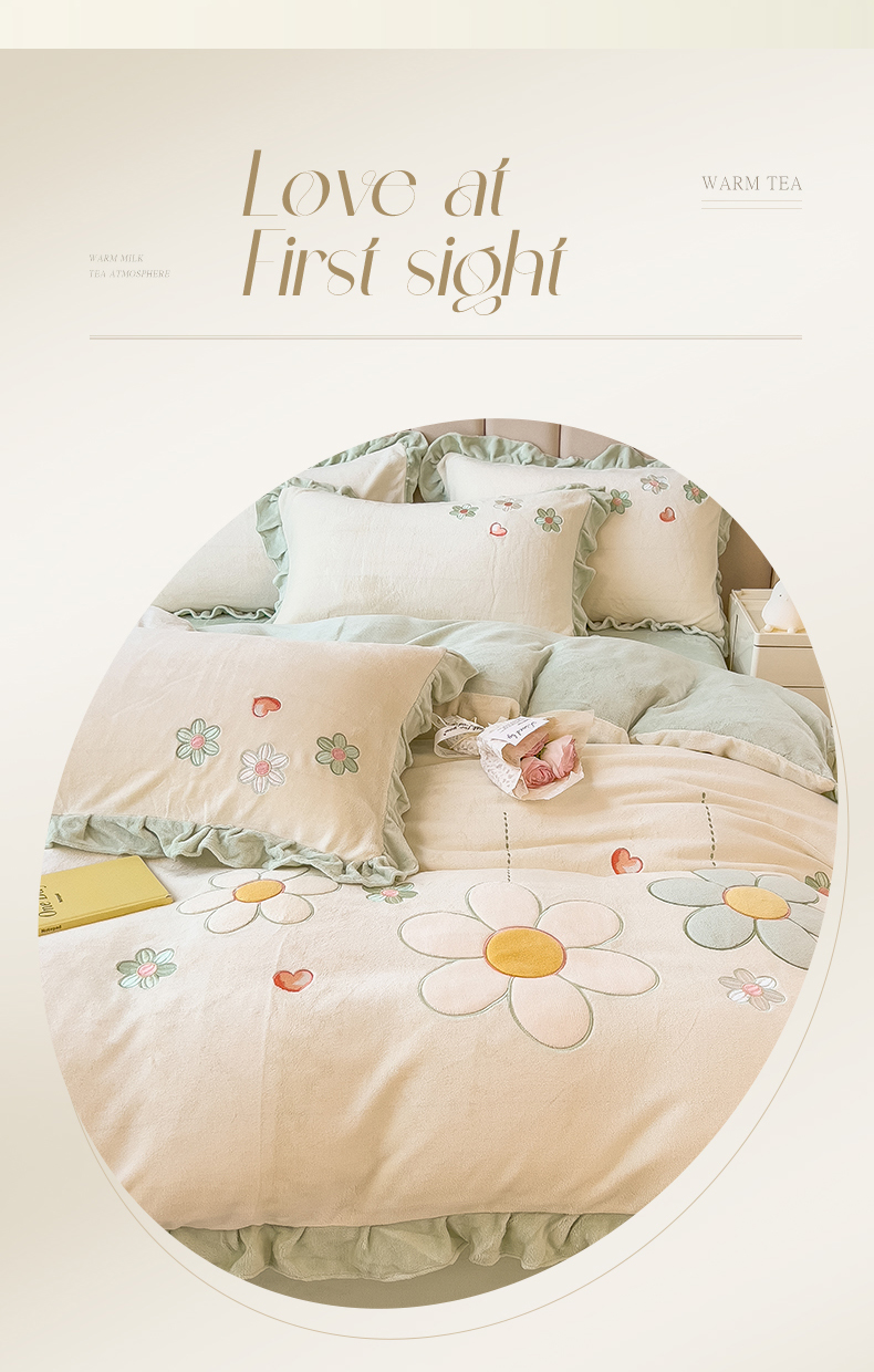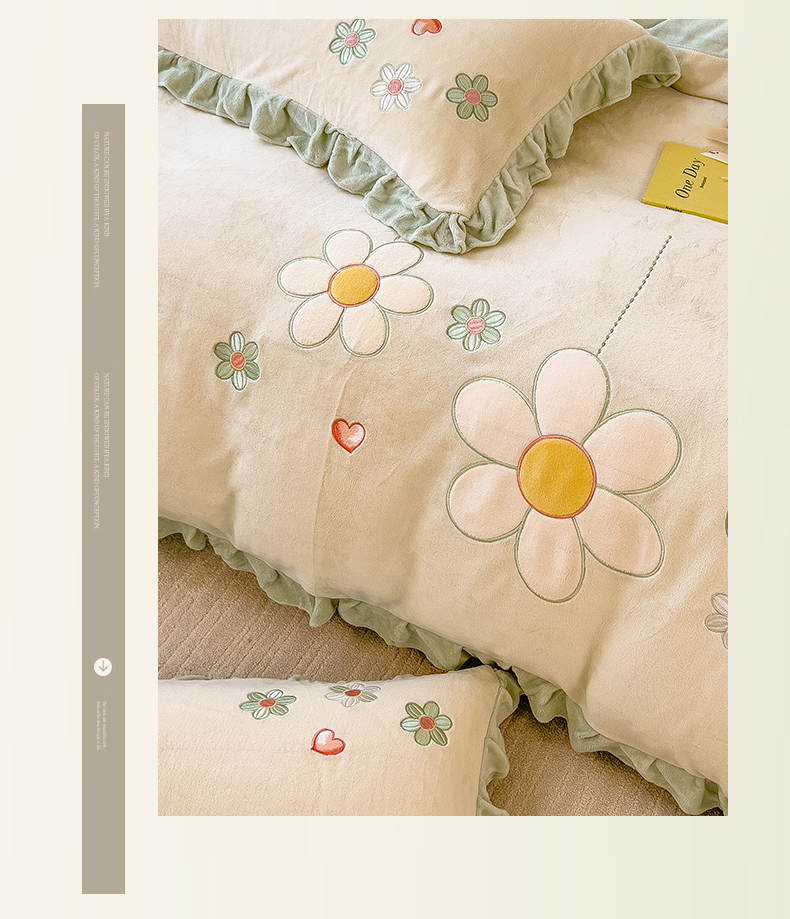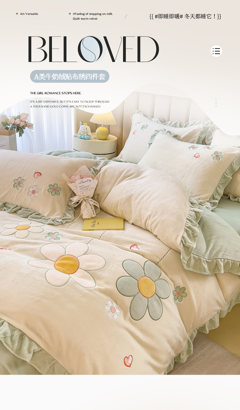 商品名称:兄弟坊 2024新款韩版牛奶绒花朵贴布绣四件套 花朵青柠